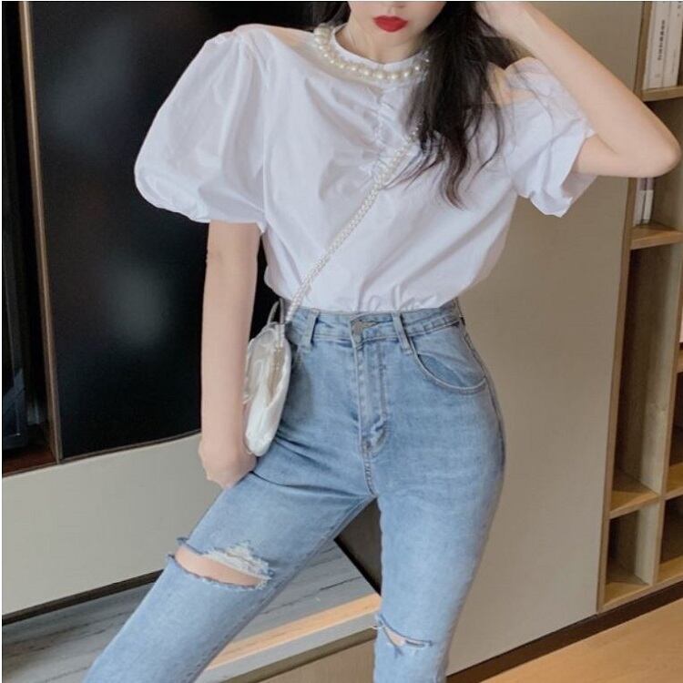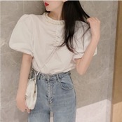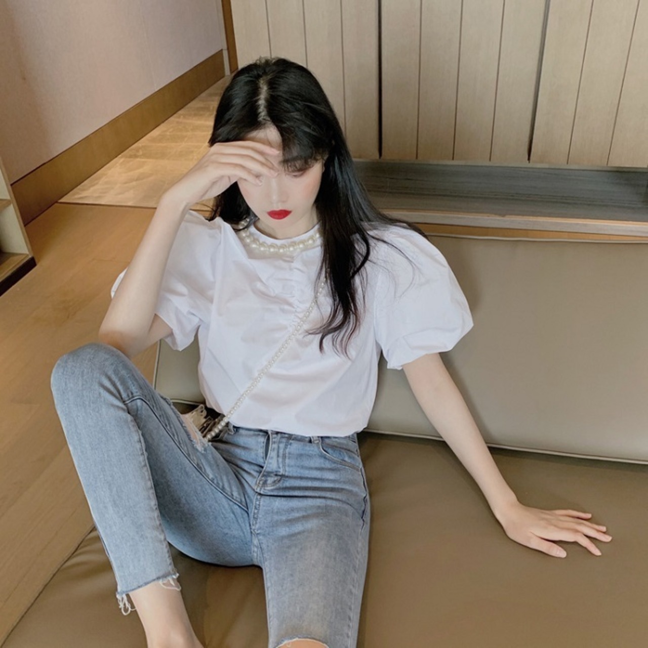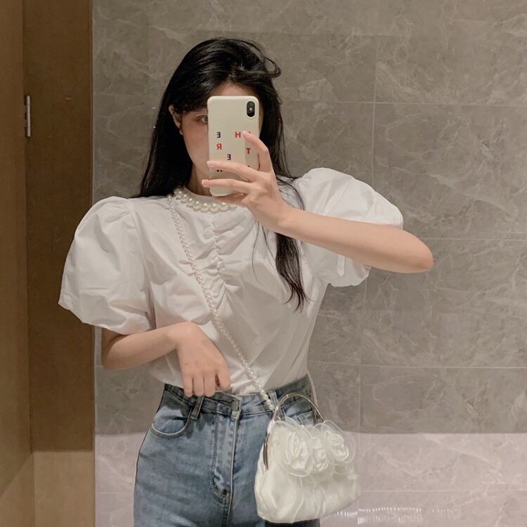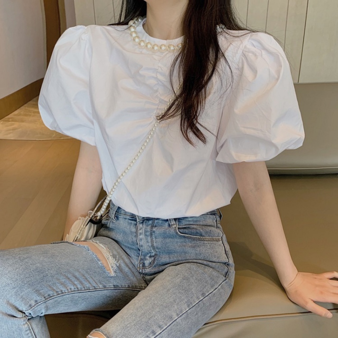 ブラウス トップス ラウンドネック 半袖 パフスリーブ パール付き レトロ きれいめ 上品 カジュアル フェミニン お出かけ デイリー デート 女子会 夏 ホワイト