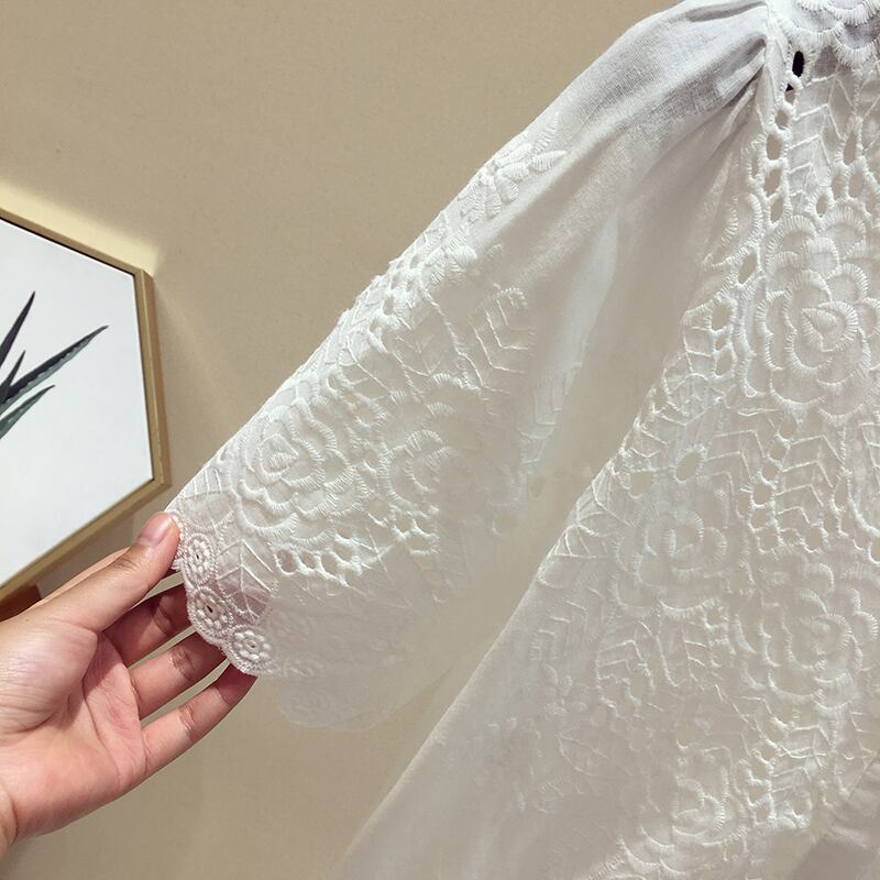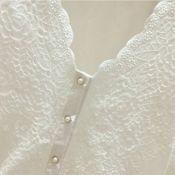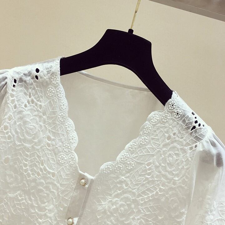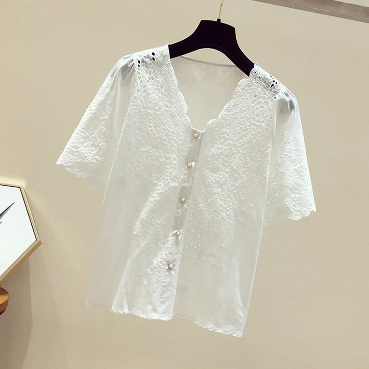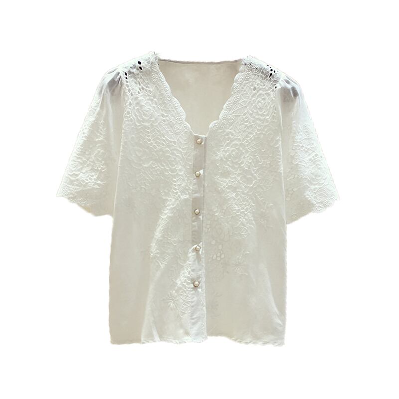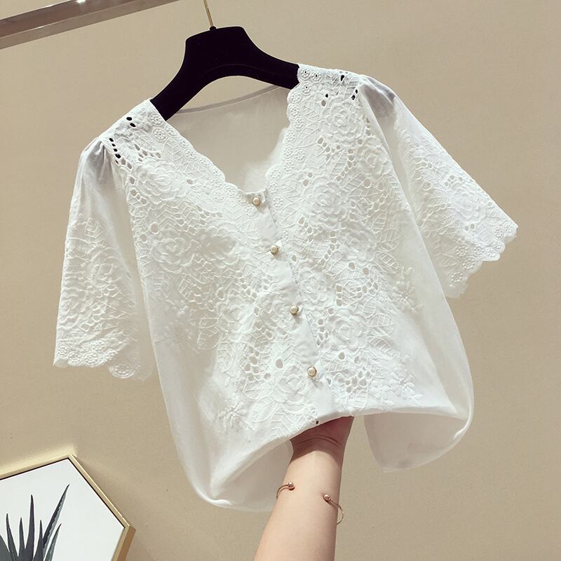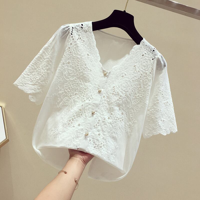 レースブラウス トップス Vネック 半袖 穴あきレース ショート丈 レトロ 無地 可愛い きれいめ 上品 清楚 カジュアル フェミニン お出かけ デイリー デート 女子会 夏 ホワイト