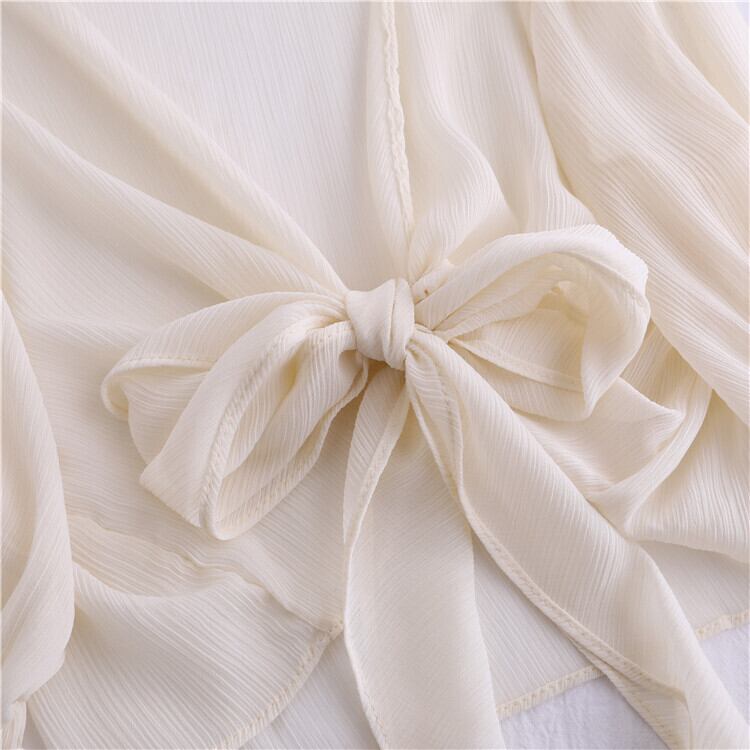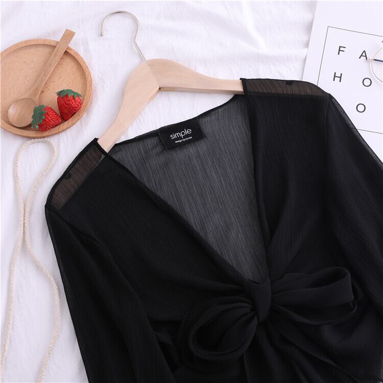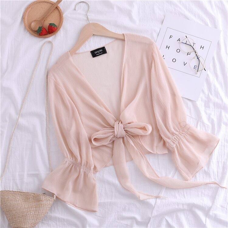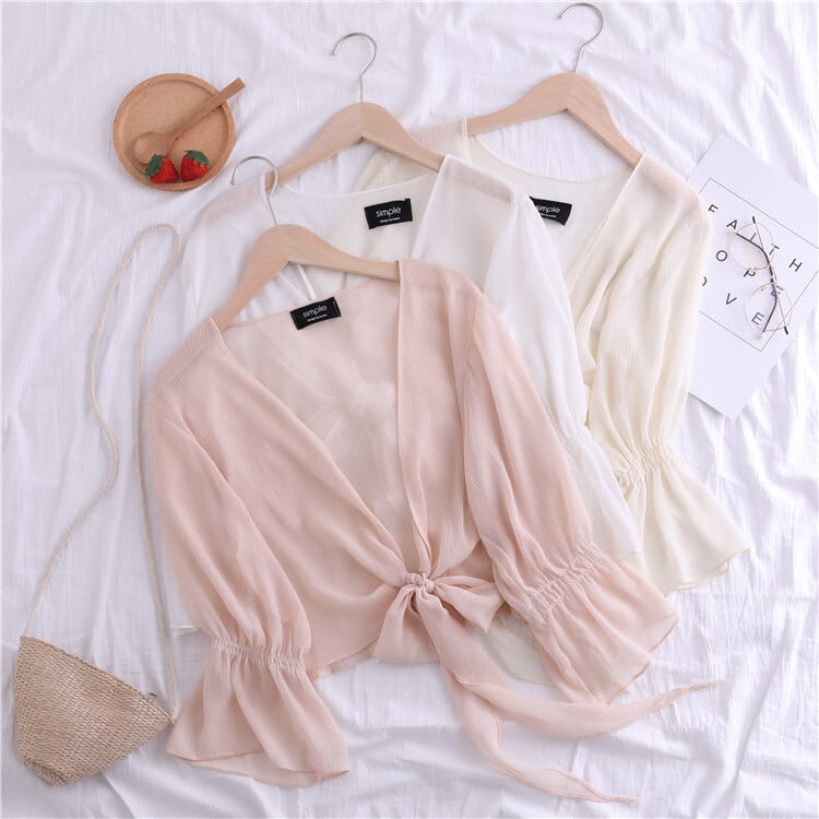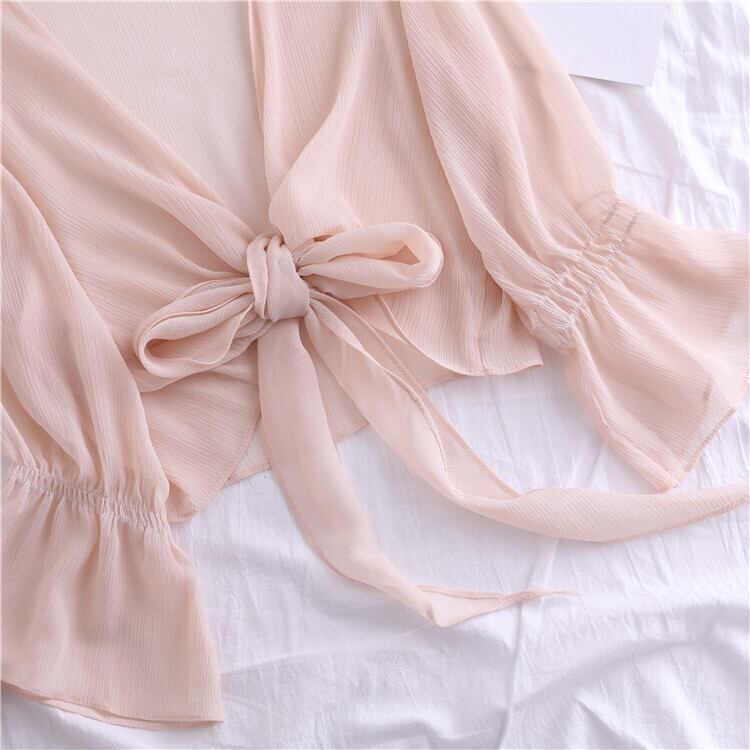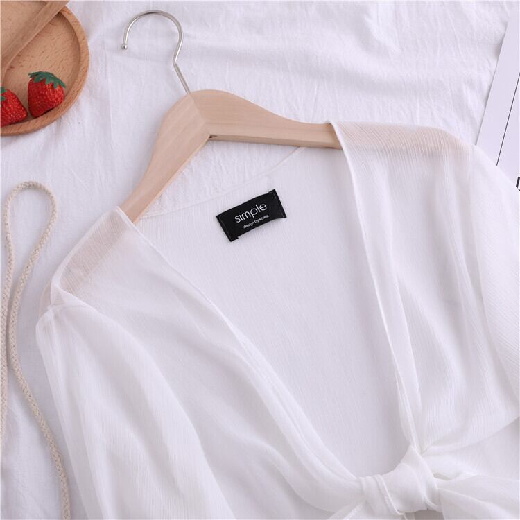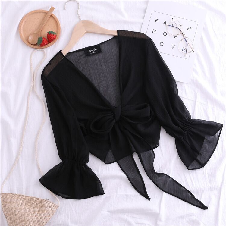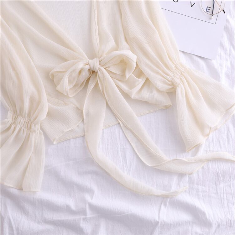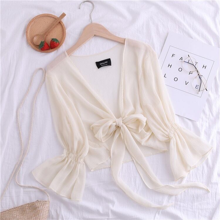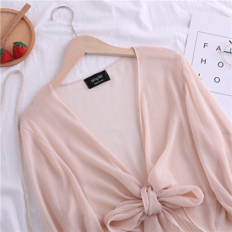 全4色 シフォンカーディガン ショール Vネック ショート丈 リボン 透け感 薄手 長袖 日焼け防止 冷房対策 フェアリー フェミニン リボン ゆったり 体型カバー カジュアル お出かけ デイリー リゾート デート 女子会 夏 ホワイト ブラック ピンク アプリコット