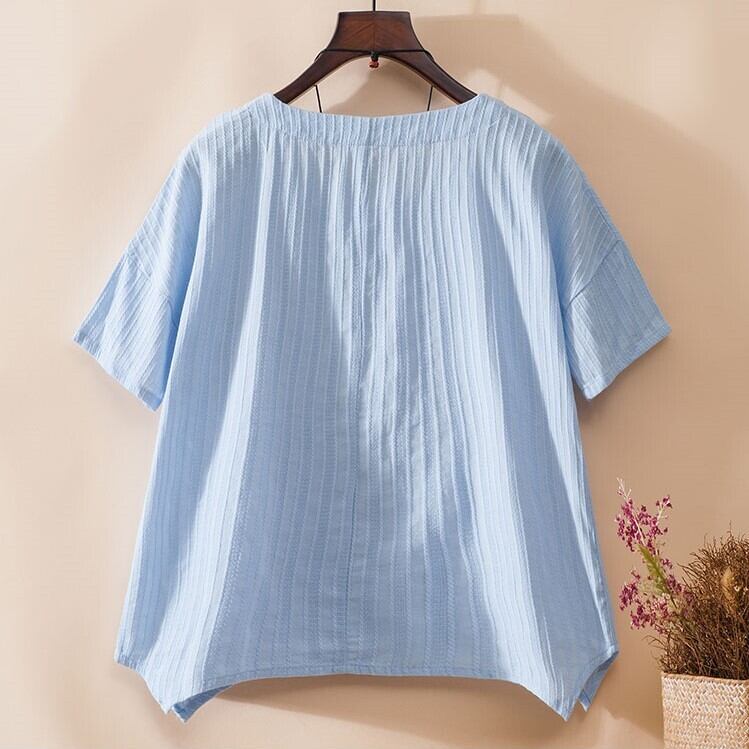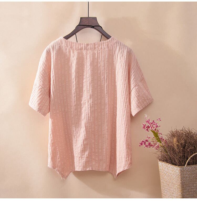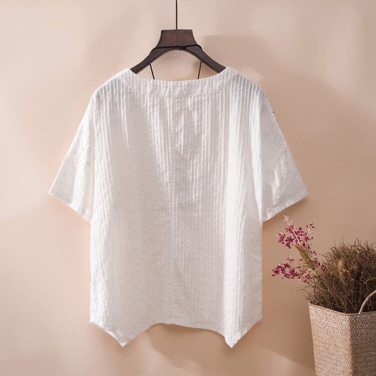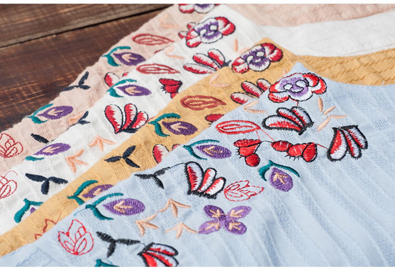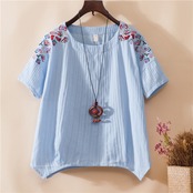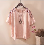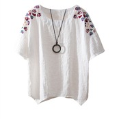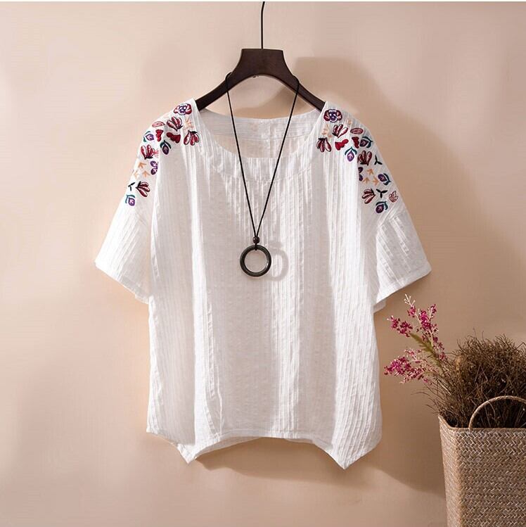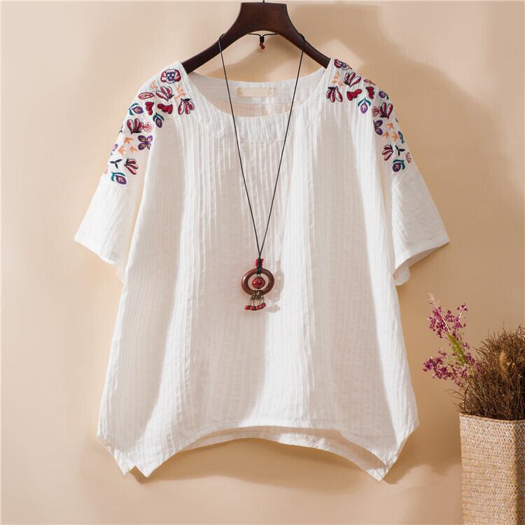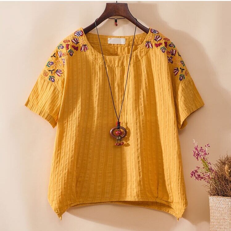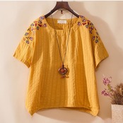 全4色 リネンシャツ ブラウス チュニック Tシャツ 大きいサイズ 刺繍 花柄 半袖 ラウンドネック ゆったり 体型カバー シンプル 可愛い カジュアル ガーリー お出かけ デイリー リゾート デート 女子会 夏 ホワイト ピンク イエロー ブルー