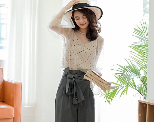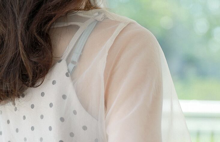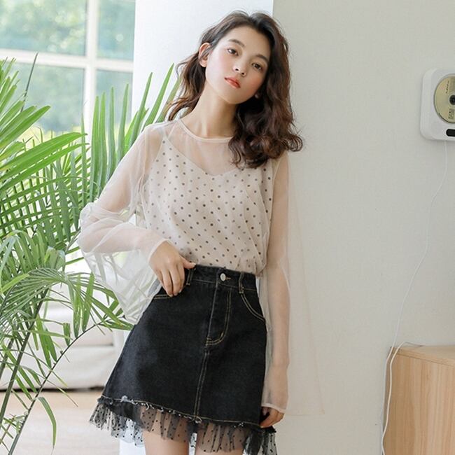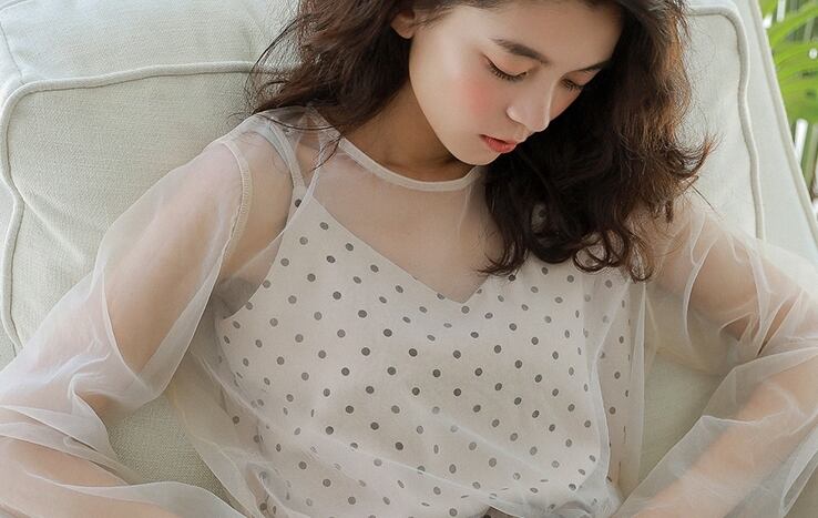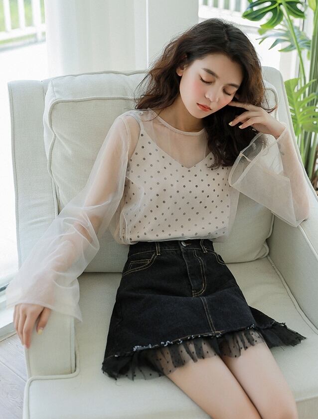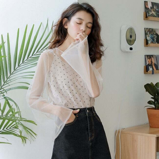 トップス ブラウス ツーピース シースルー ドット柄 水玉 ゆったり ベル袖 長袖 キャミソール 大人可愛い カジュアル お出かけ きれいめ デート 女子会 韓国ファッション 夏