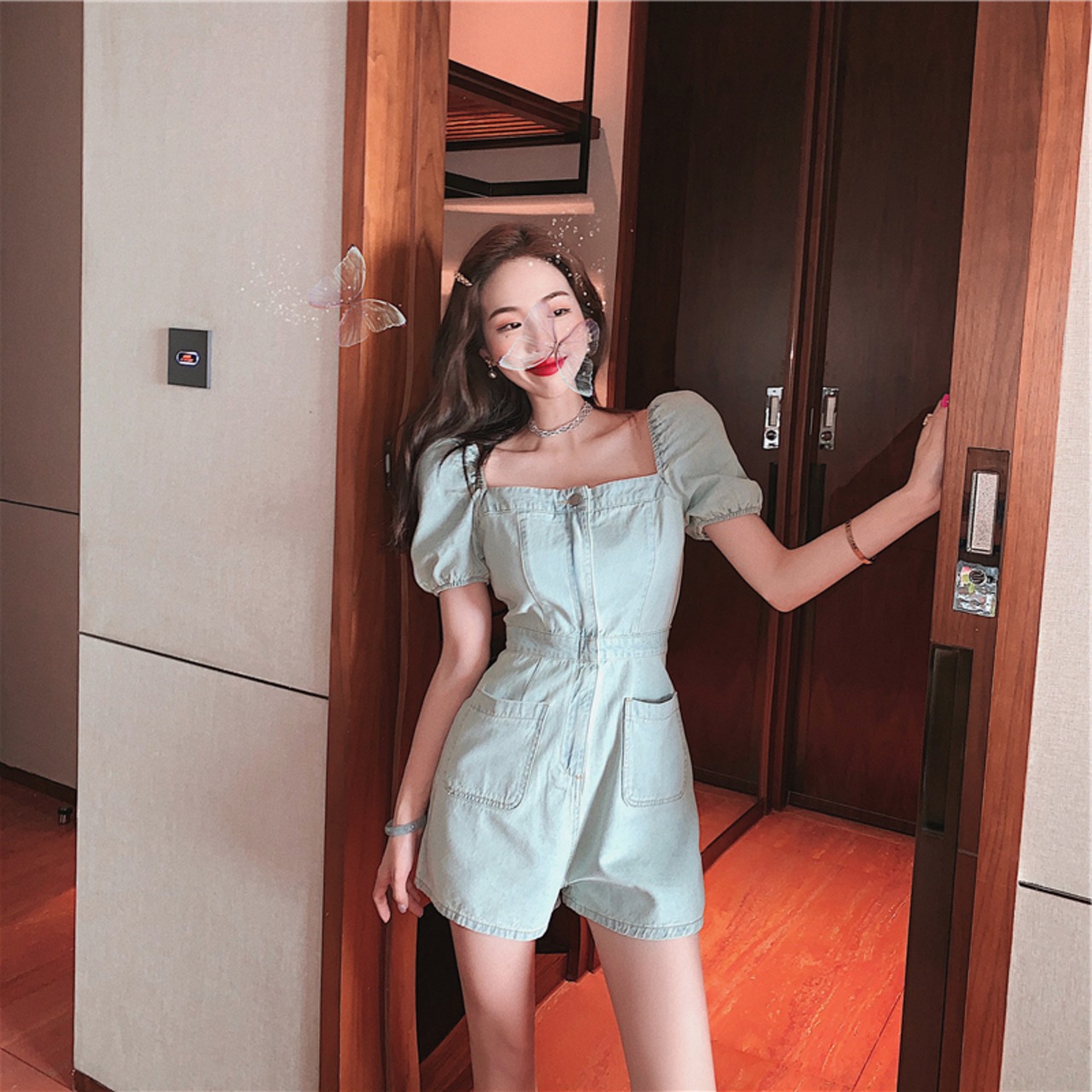全2色 ジャンプスーツ ショートサロペット デニム オールインワン パフスリーブ オーバーオール スクエアネック 半袖 ハイウエスト カジュアル ミニ丈 可愛い デート お出かけ リゾート 夏