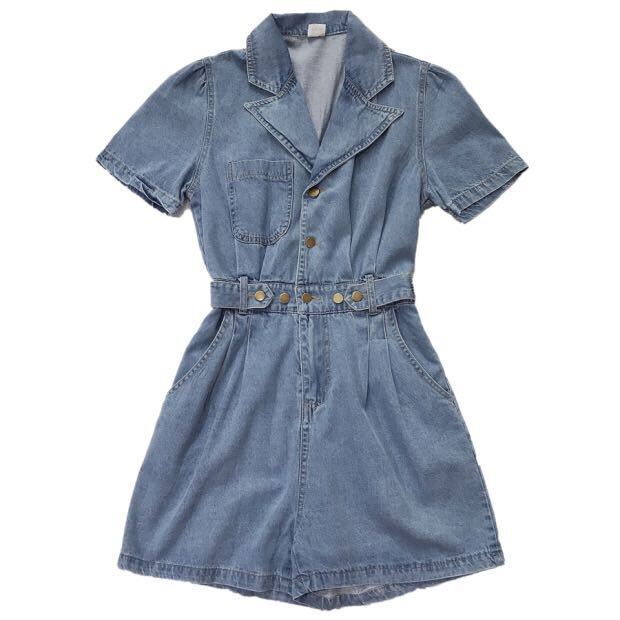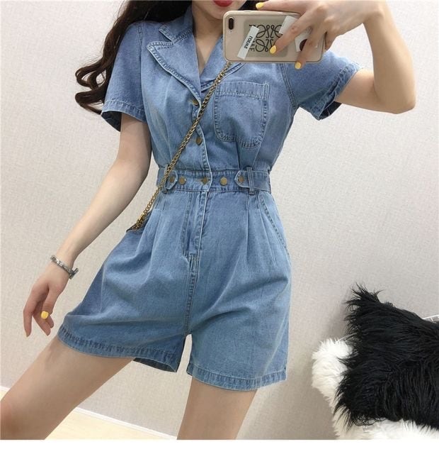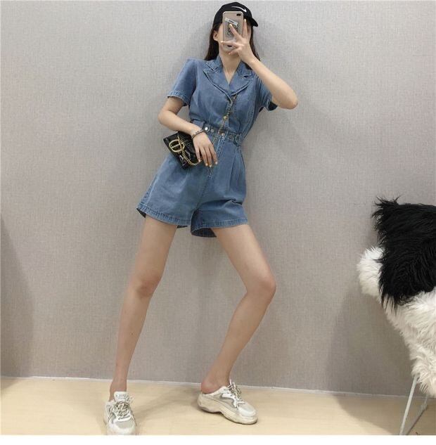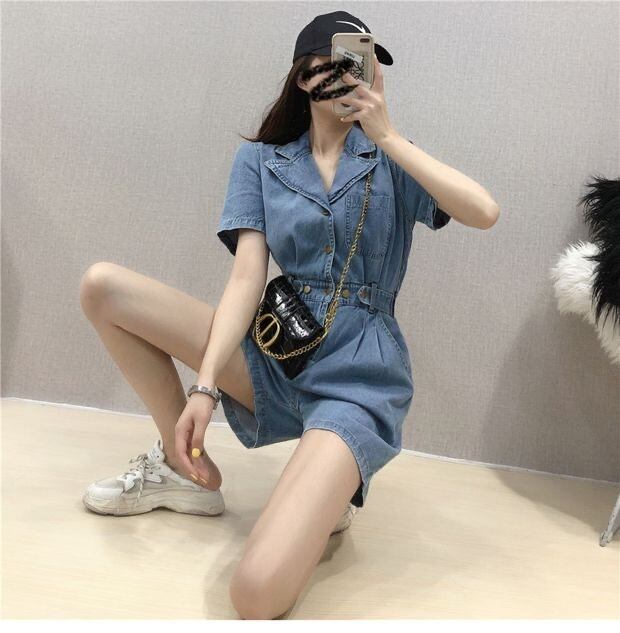 全2色 ジャンプスーツ ショートサロペット デニム オールインワン オーバーオール Vネック フロントボタン 半袖 ハイウエスト カジュアル 可愛い デート お出かけ ジーンズ 韓国ファッション リゾート 夏