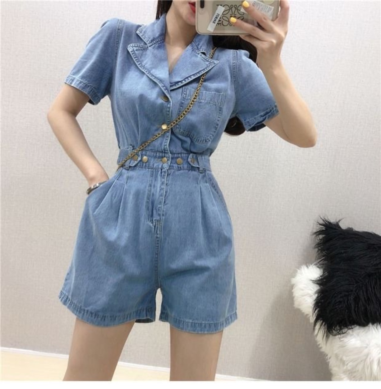 デニム素材でトレンドを感じさせるジャンプスーツ。