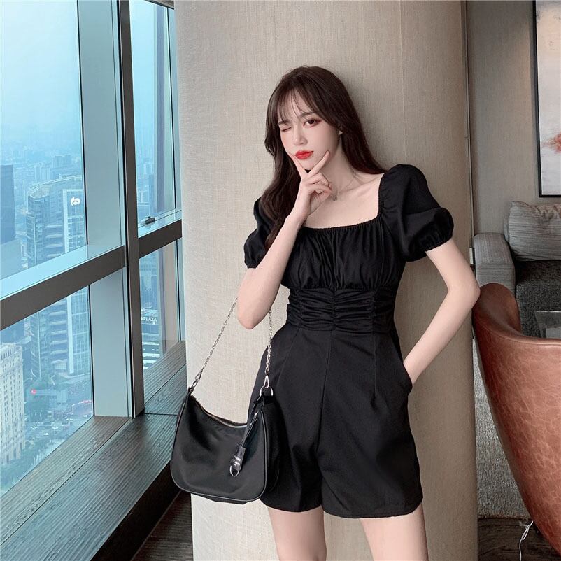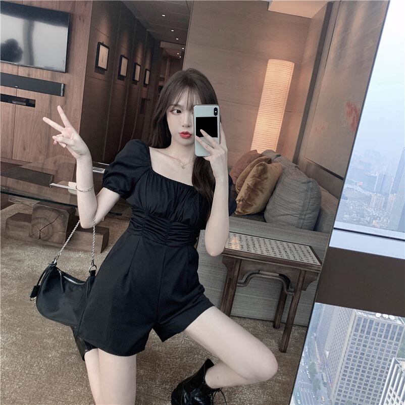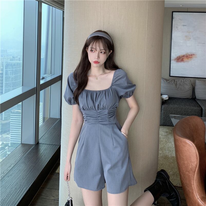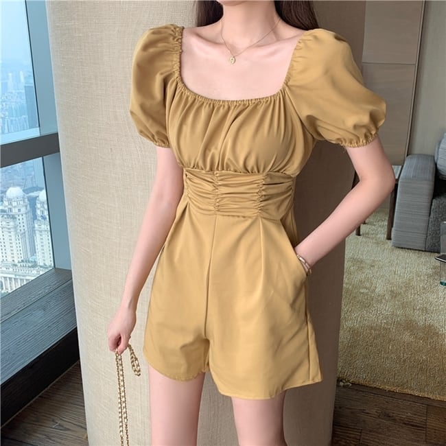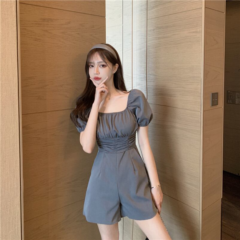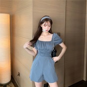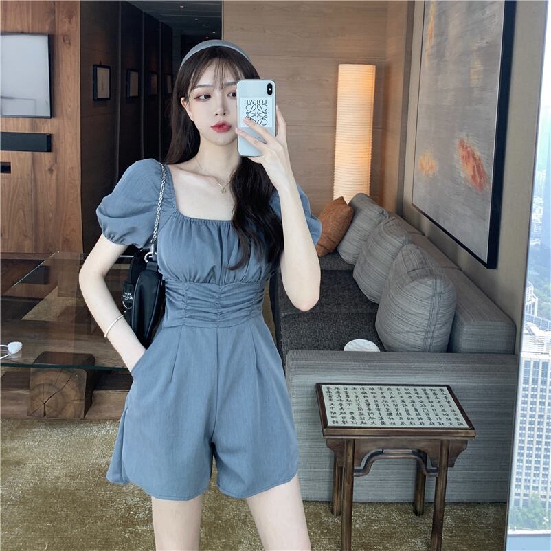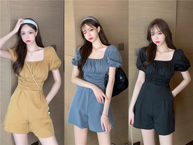全3色 ジャンプスーツ ショートサロペット オールインワン オーバーオール スクエアネック フロントコンシャス 半袖 パフスリーブ ハイウエスト カジュアル 可愛い デート お出かけ 韓国ファッション リゾート 夏