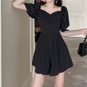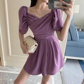 全2色 オールインワン ショートパンツ ジャンプスーツ ミニワンピース 半袖 フレアパンツ シンプル ハイウエスト きれいめ フェミニン リゾート デート パーティ 夏 パープル ブラック