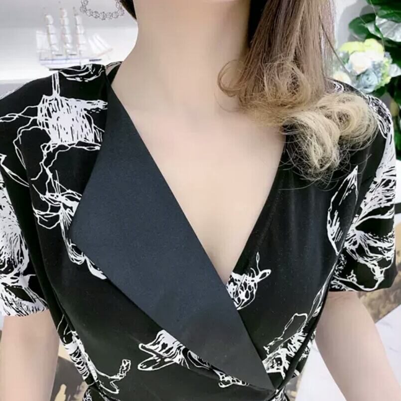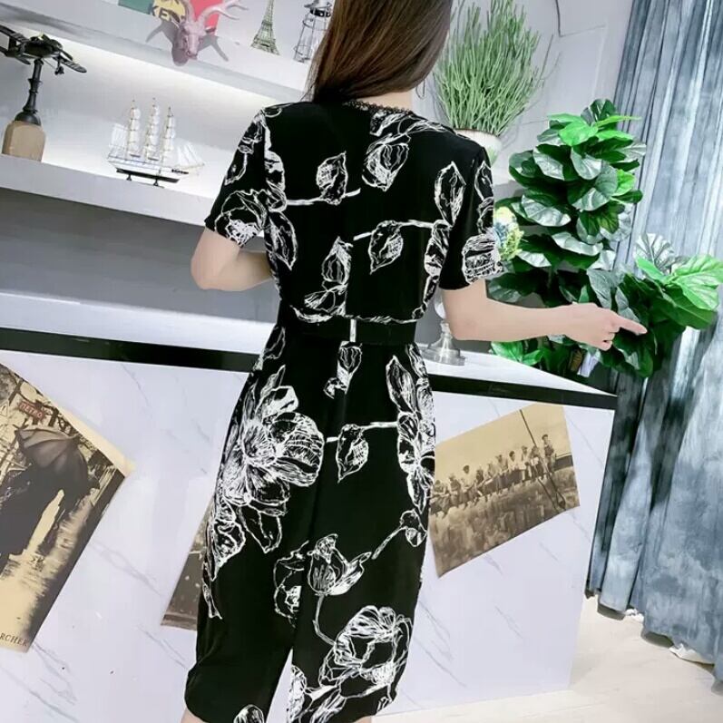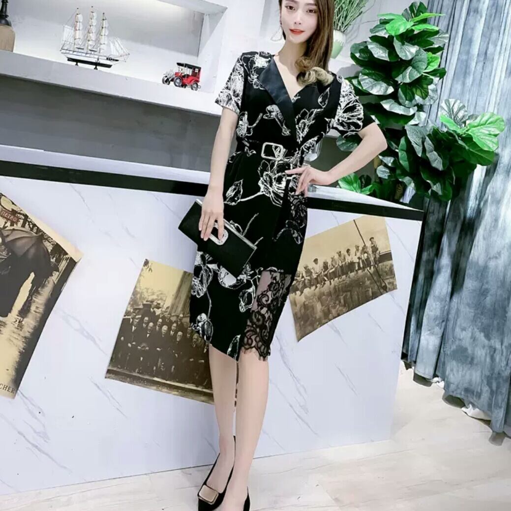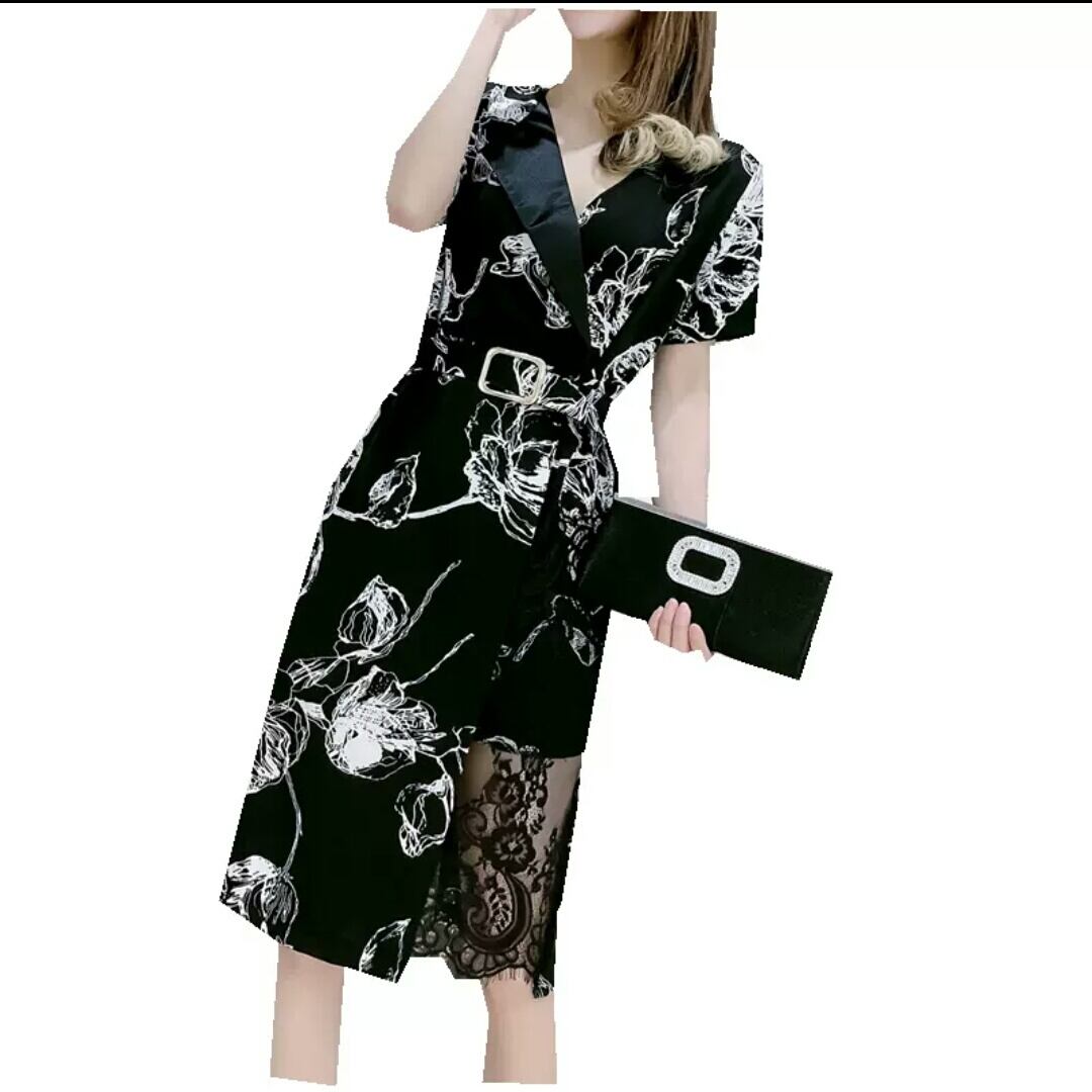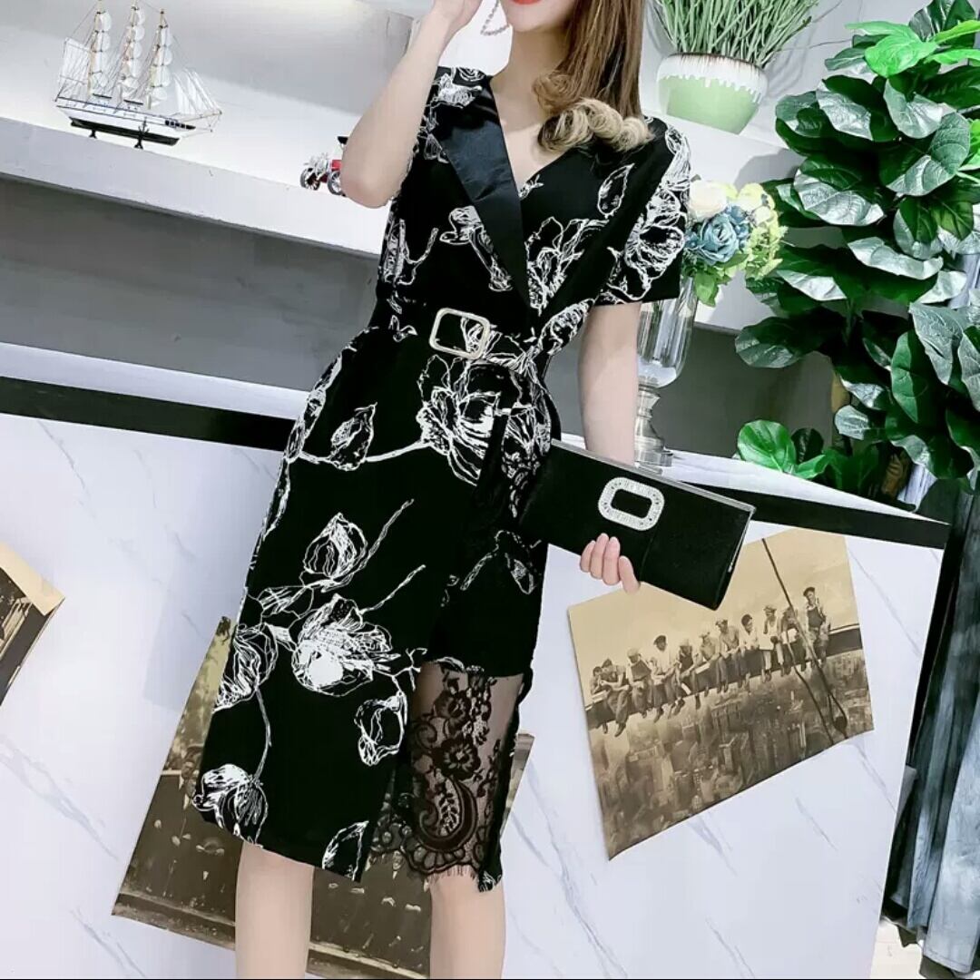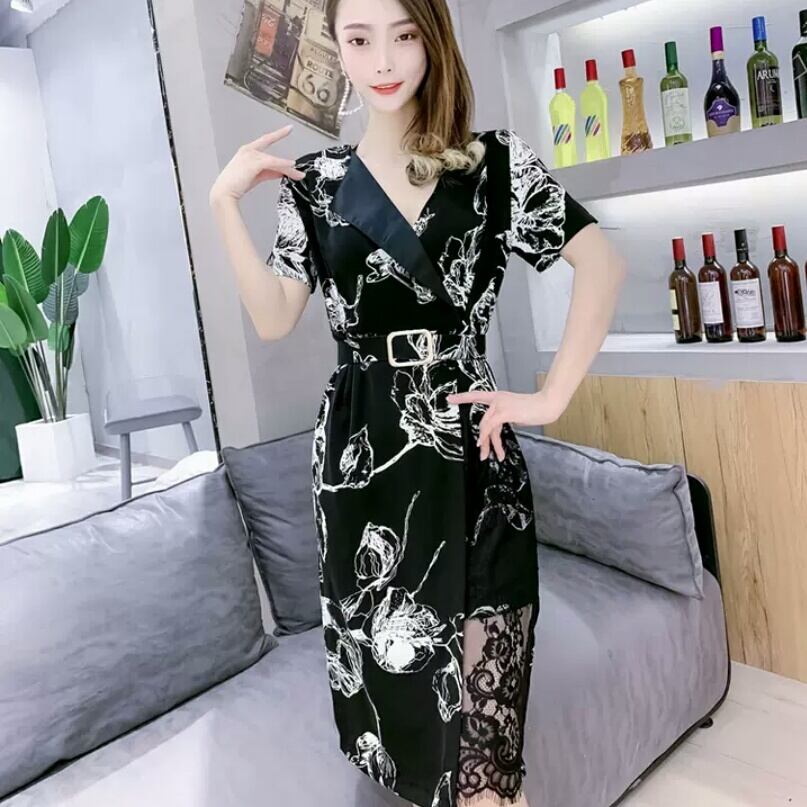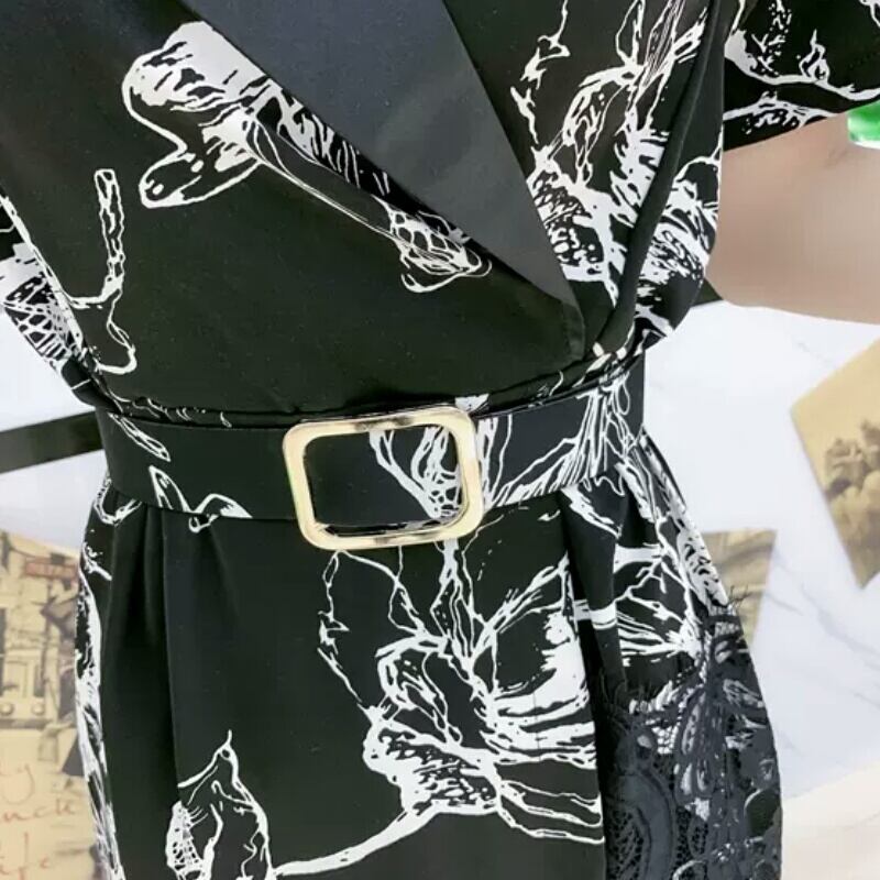 大きいサイズ Vネック ベルト ワンピース 柄 レース ひざ丈 大人 可愛い 上品 エレガント キレイめ お出かけ お買い物 デート 女子会 通勤 通学 学生 韓国ファッション 春 夏