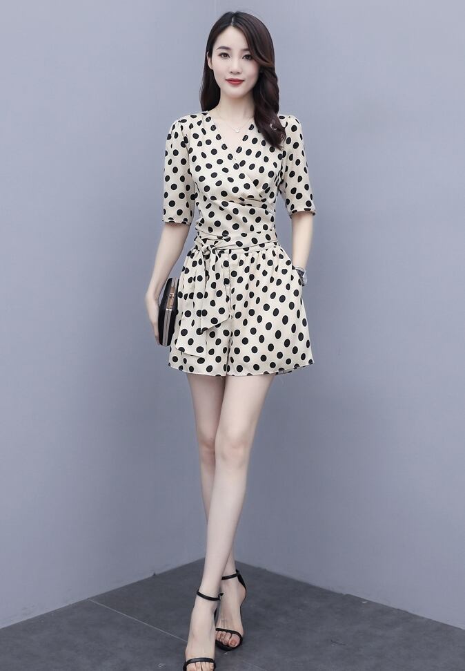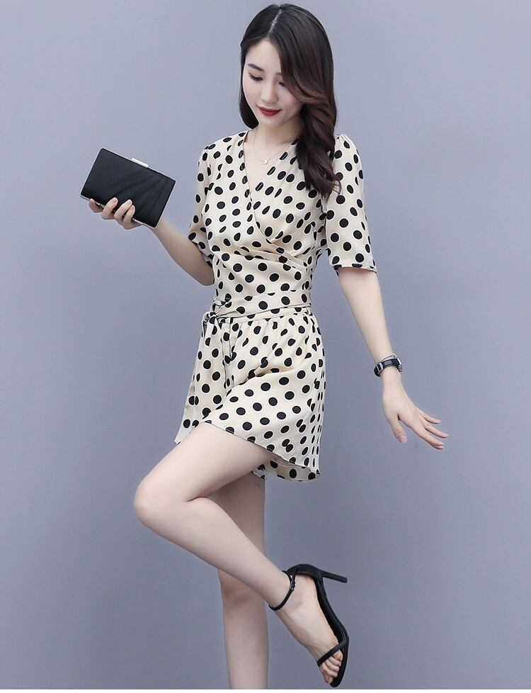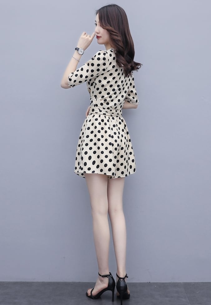 ジャンプスーツ ドット柄 ミニ丈 ショートサロペット オールインワン オーバーオール カシュクールネック Vネック 5分袖 ウエストリボン カジュアル きれいめ デート 大人可愛い 夏