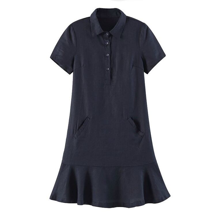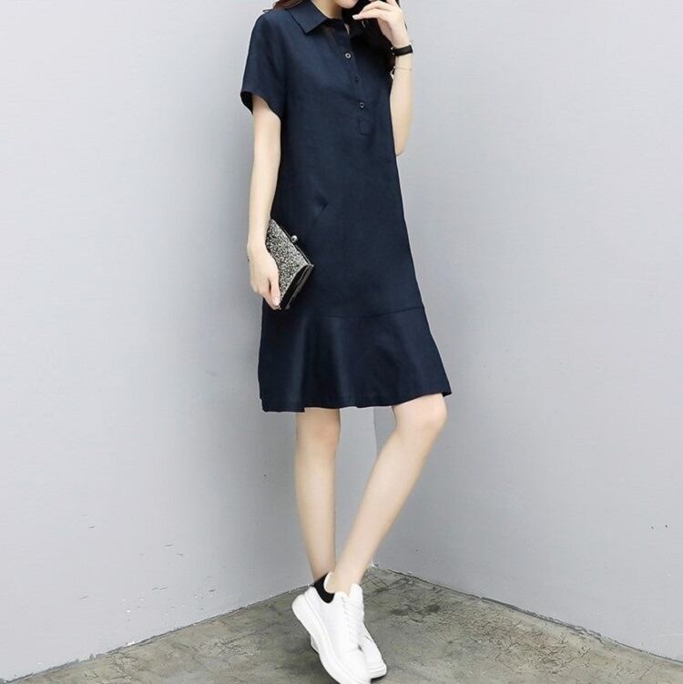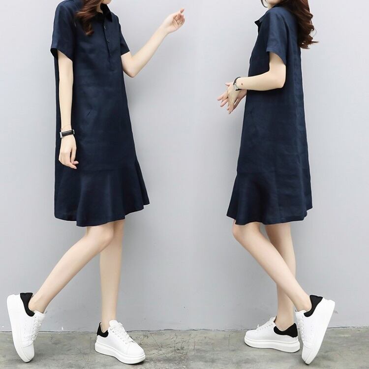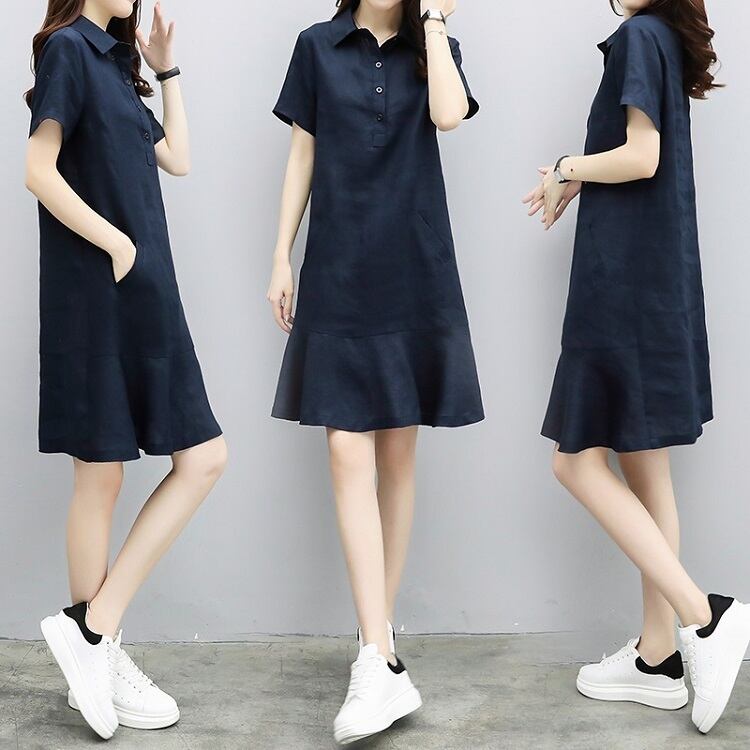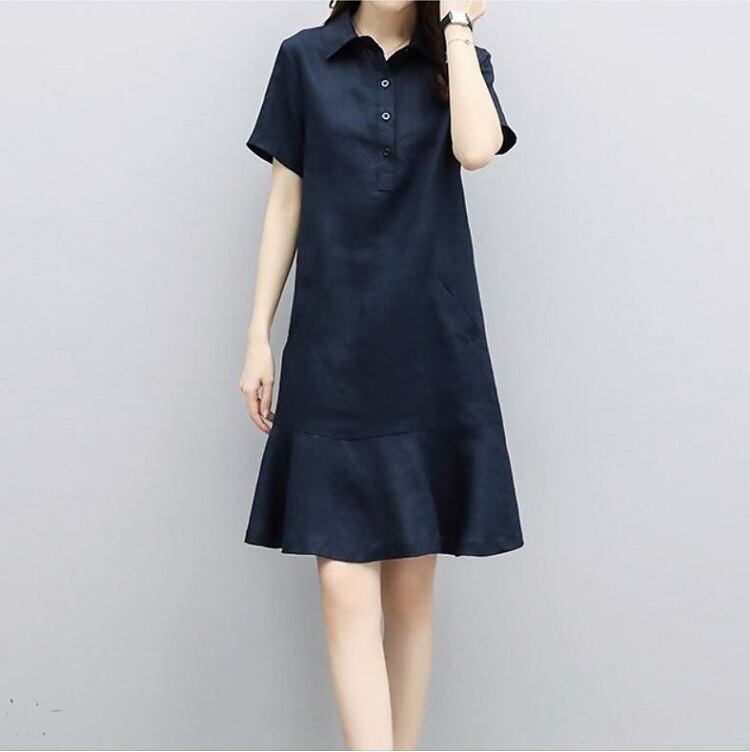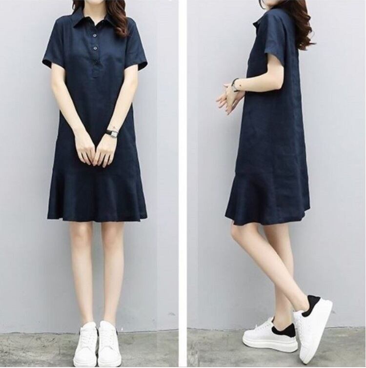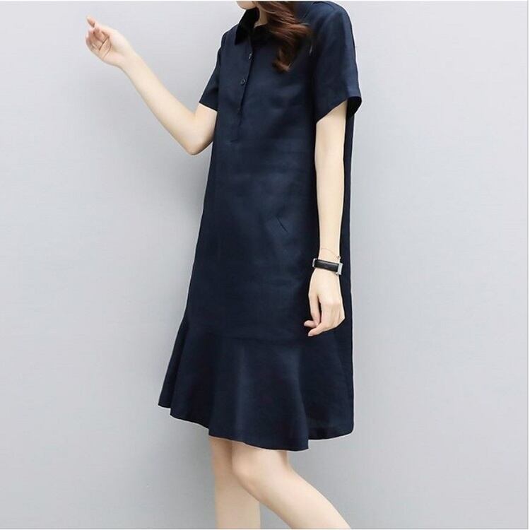 麻綿リネンコットン ワンピース フレアスカート ミニ丈 大きいサイズ 襟付き 半袖 シンプル カジュアル お出かけ リゾート デート デイリー 普段着 夏 ネイビー