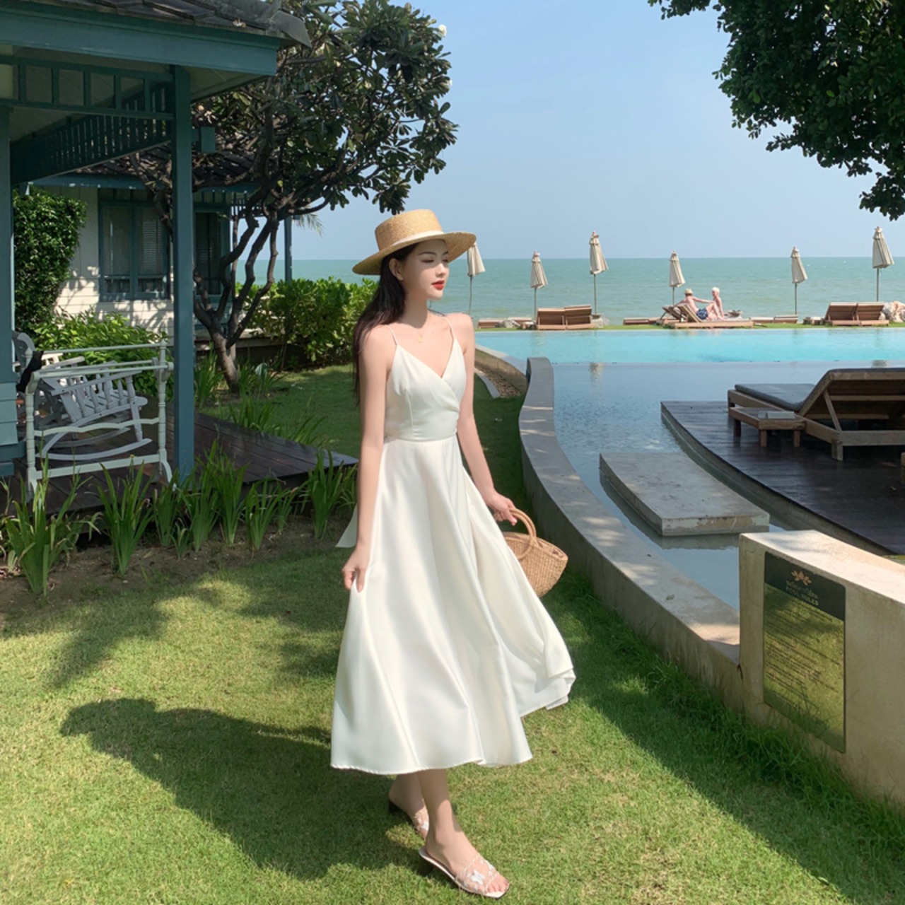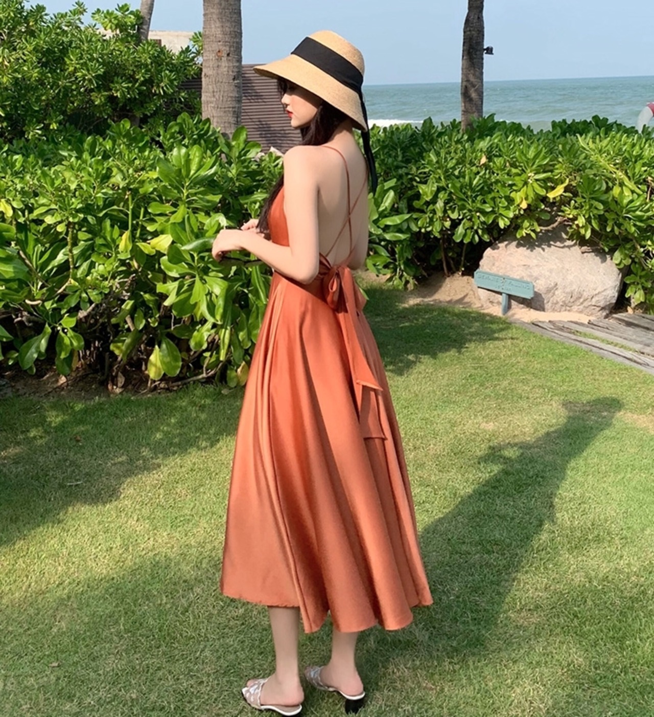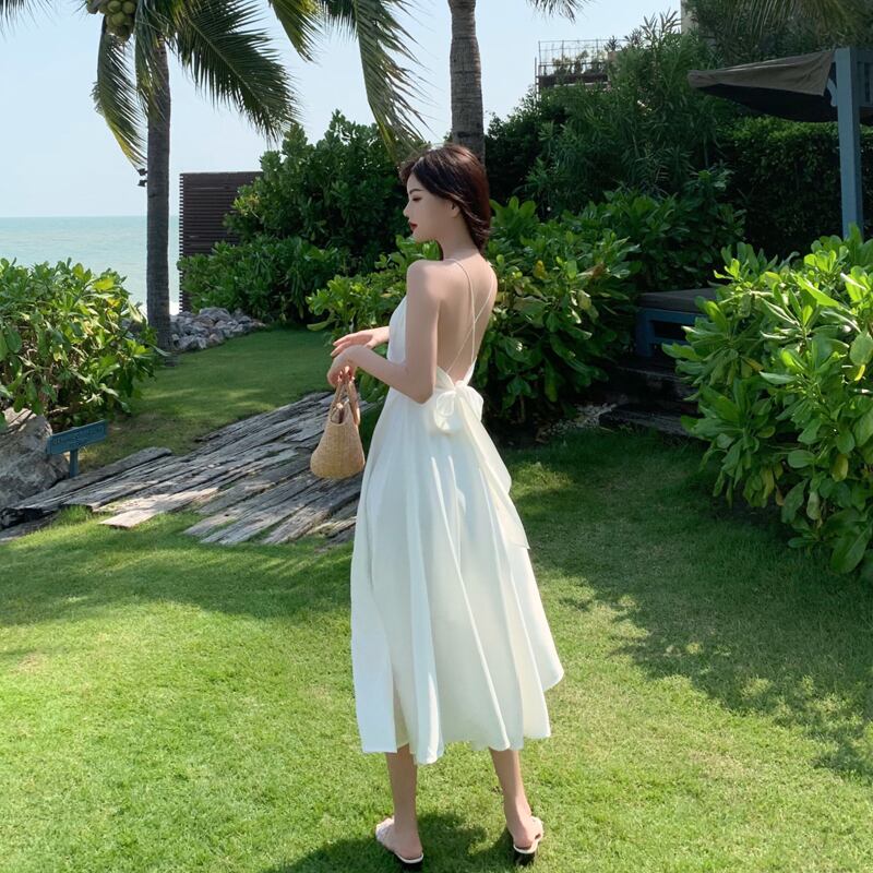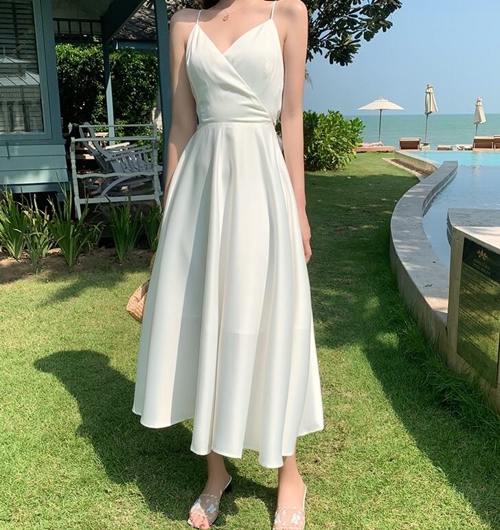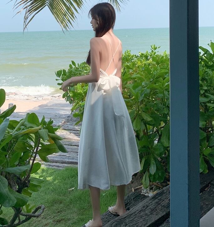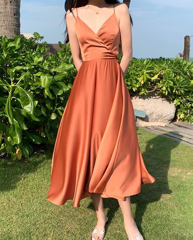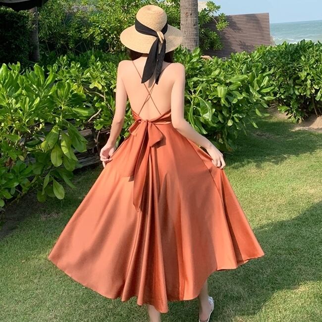 全2色 ワンピース キャミソールワンピ ロング丈 バックコンシャス 光沢 バックシャン 背中開き 背中見せ バックリボン フレア Aライン Vネック カジュアル 大人 上品 きれいめ リゾート デート 夏
