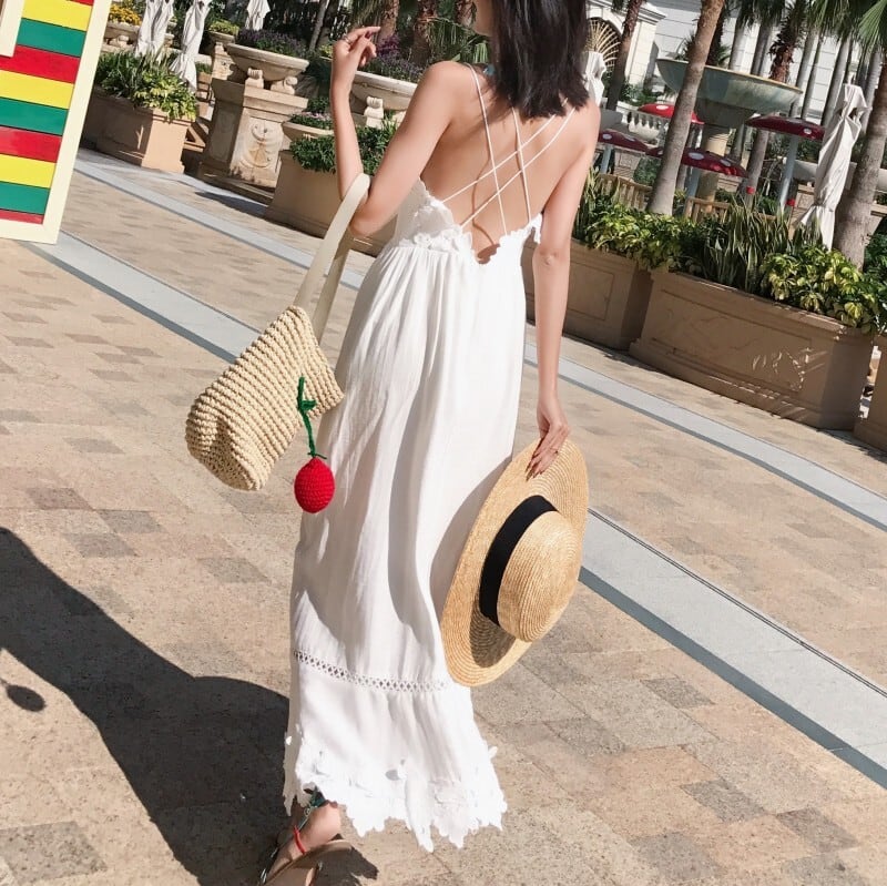 背中が開いたバックスタイルが色っぽいロング丈ワンピース。