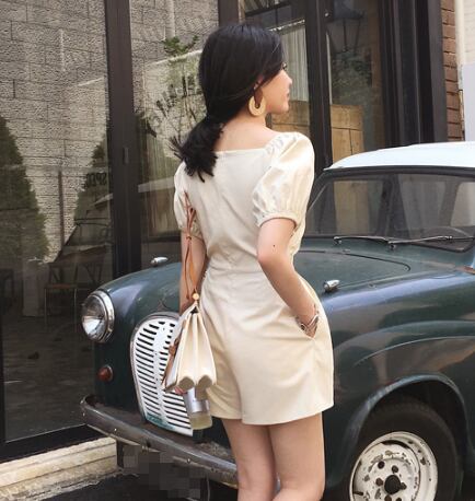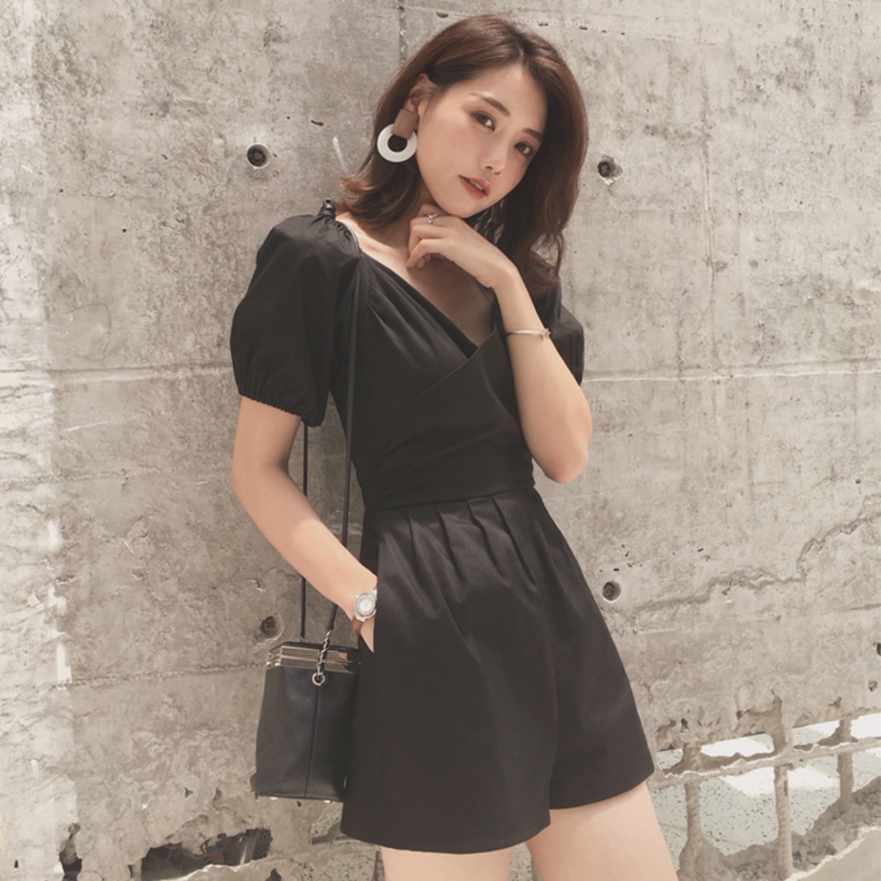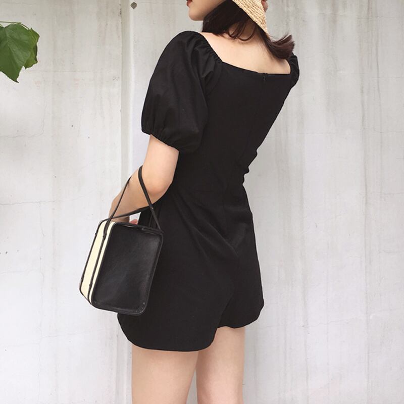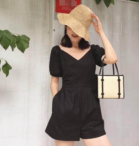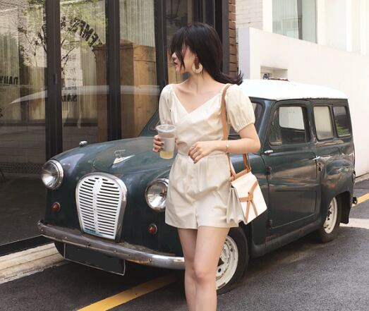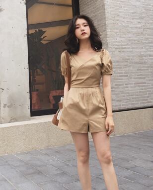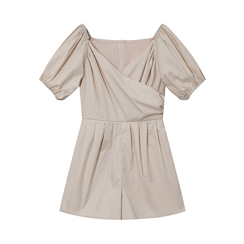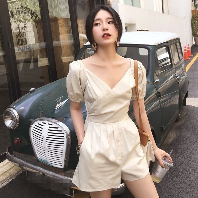 ジャンプスーツ ショートサロペット オールインワン ミニ丈 オーバーオール カシュクールネック Vネック 半袖 ハイウエスト タック入り カジュアル デート お出かけ 夏