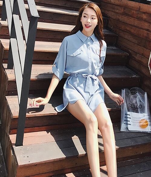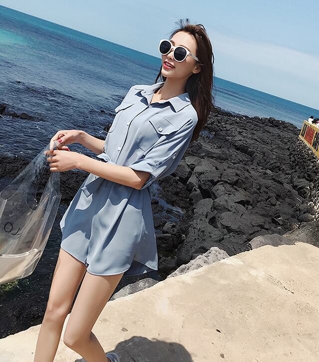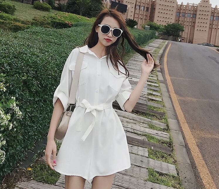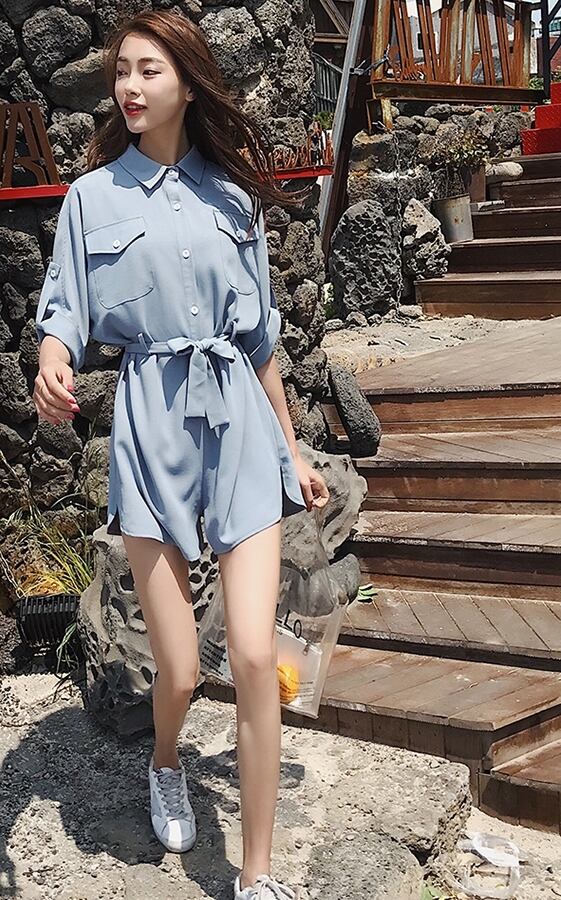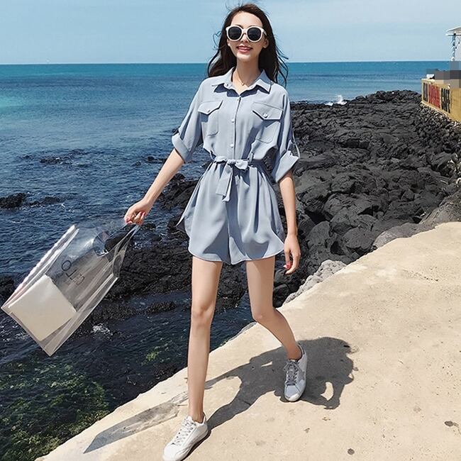 全2色 ジャンプスーツ ショートサロペット オールインワン オーバーオール Vネック フロントボタン 5分袖 ハイウエスト ウエストリボン カジュアル ミニ丈 大人可愛い ゆったり デート お出かけ リゾート 韓国ファッション 夏