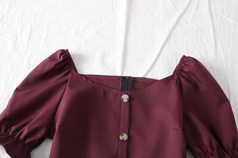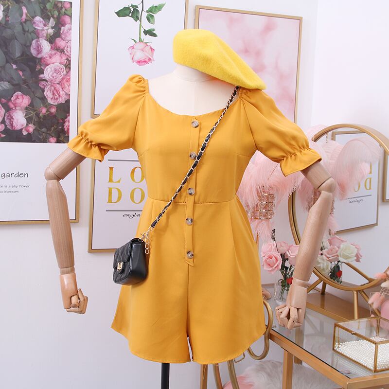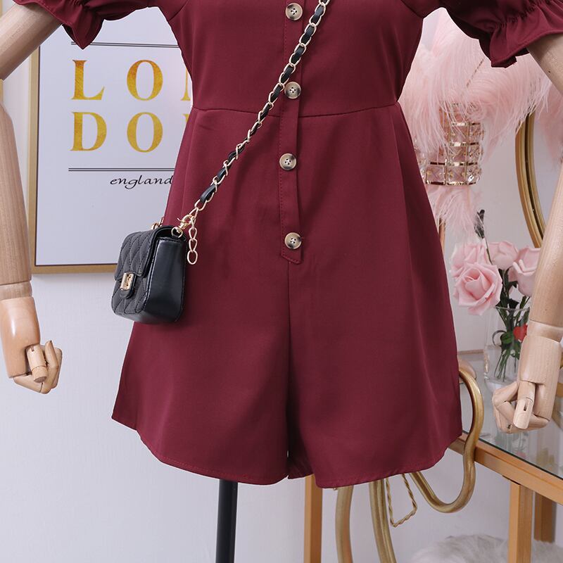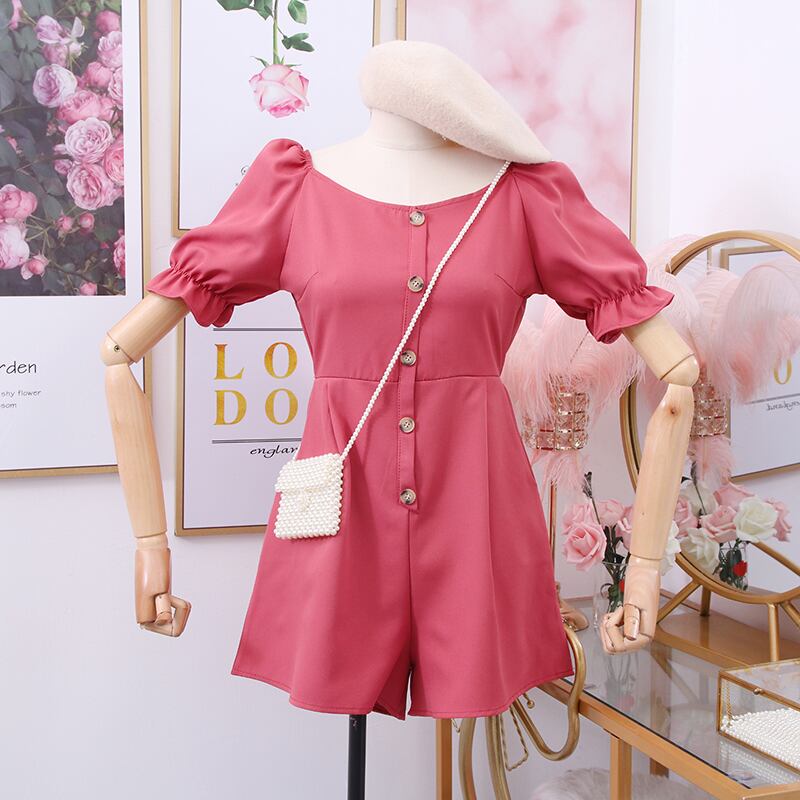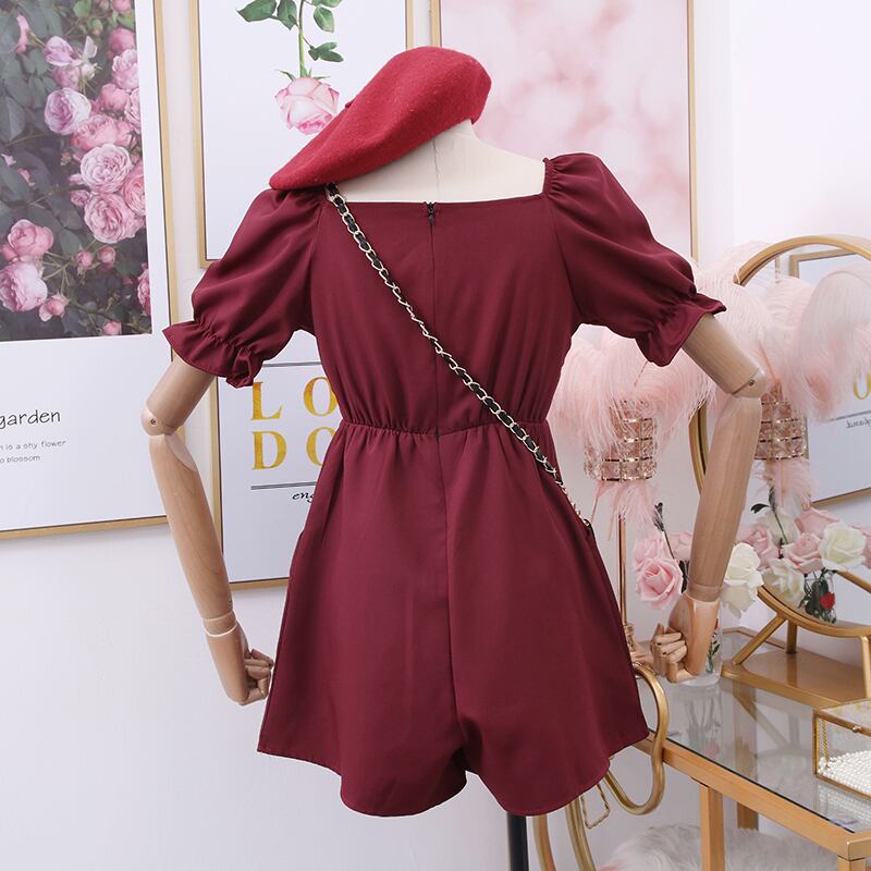 全4色 ジャンプスーツ ミニ丈 スクエアネック パフスリーブ フロントボタン 半袖 シンプル カジュアル お出かけ デート リゾート デイリー 普段着 夏 ブラック ワインレッド ローズレッド イエロー