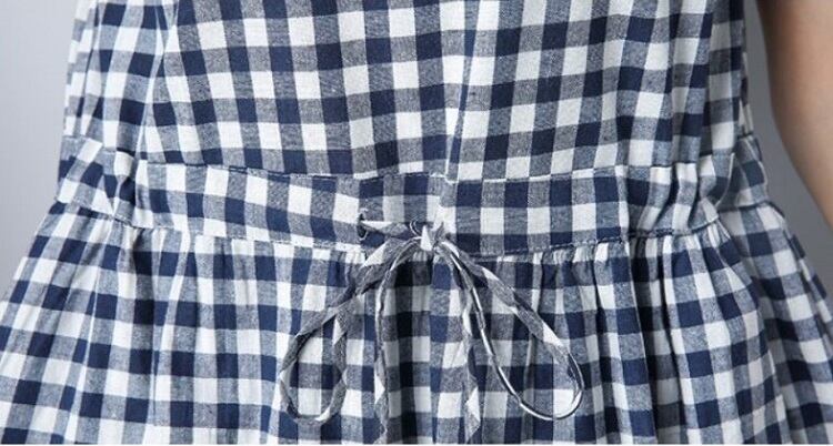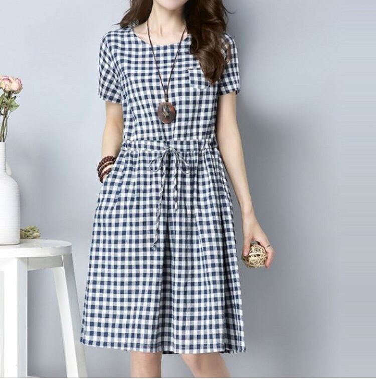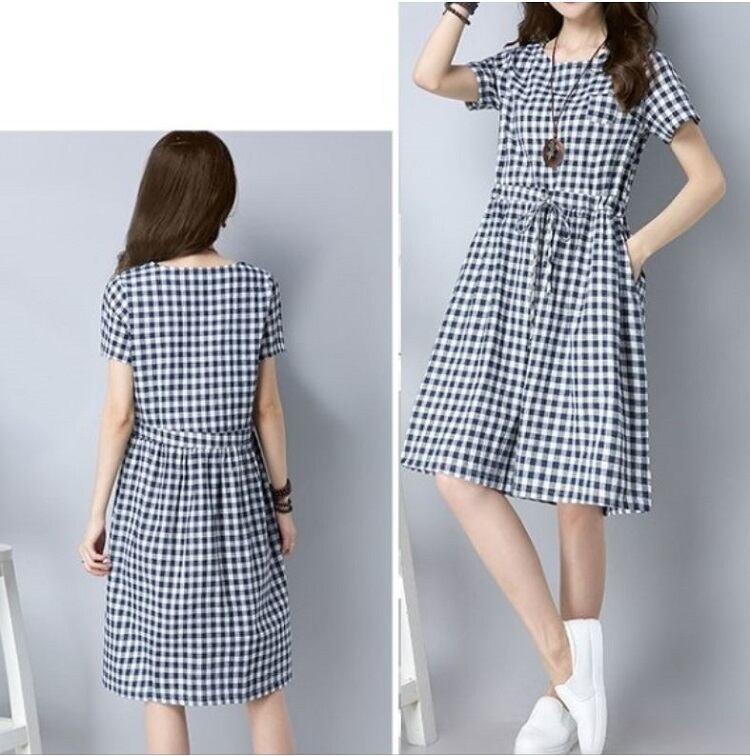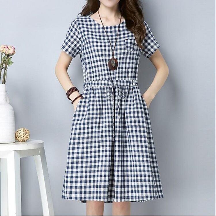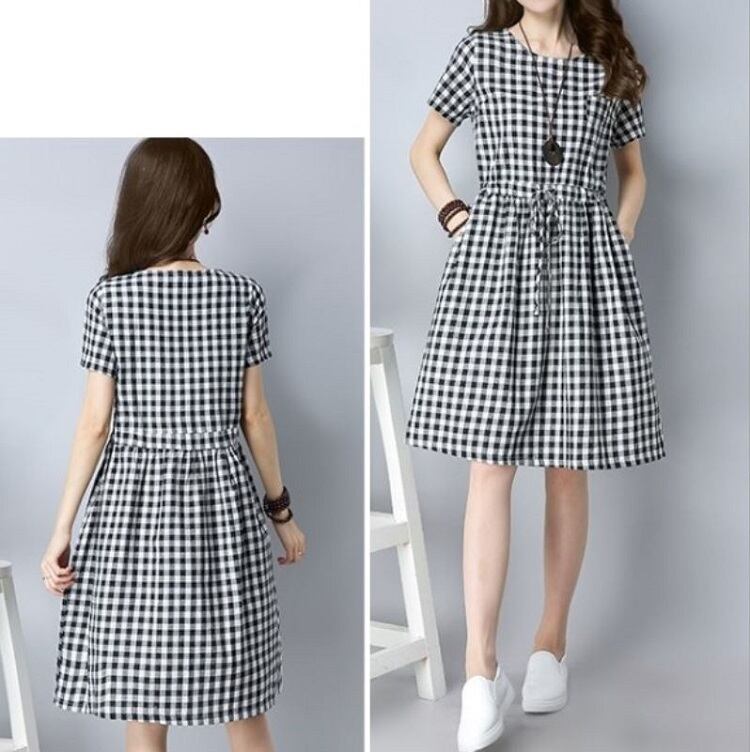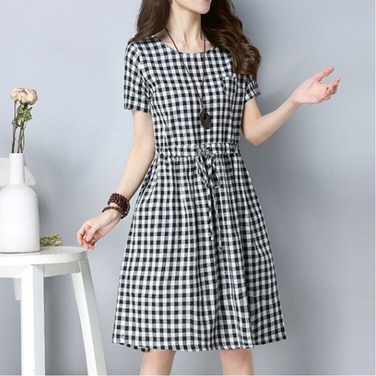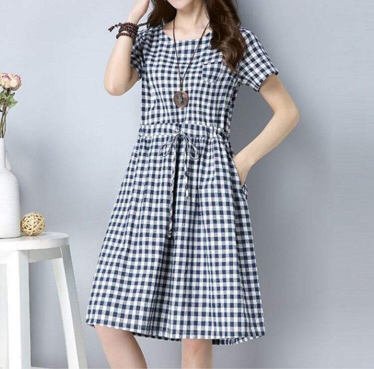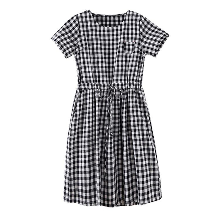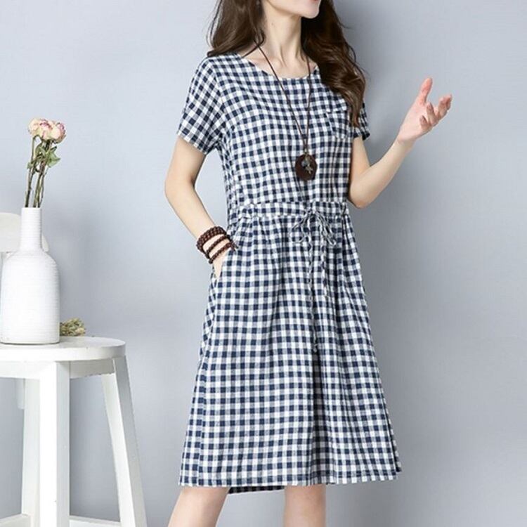 全2色 ワンピース ひざ丈 ミニ丈 麻綿リネンコットン ラウンドネック 半袖 ウエストリボン ギンガムチェック シンプル カジュアル お出かけ デート リゾート デイリー 普段着 夏 ブラック ブルー