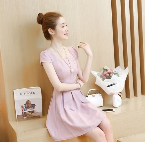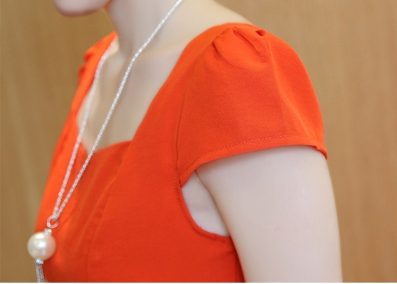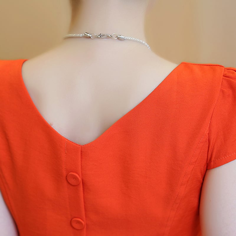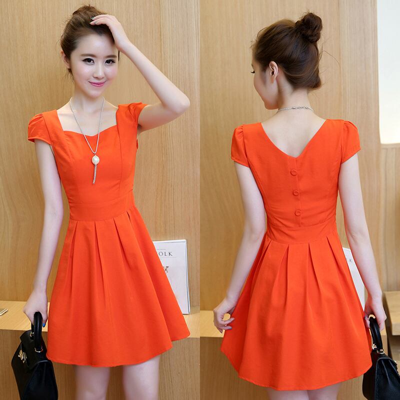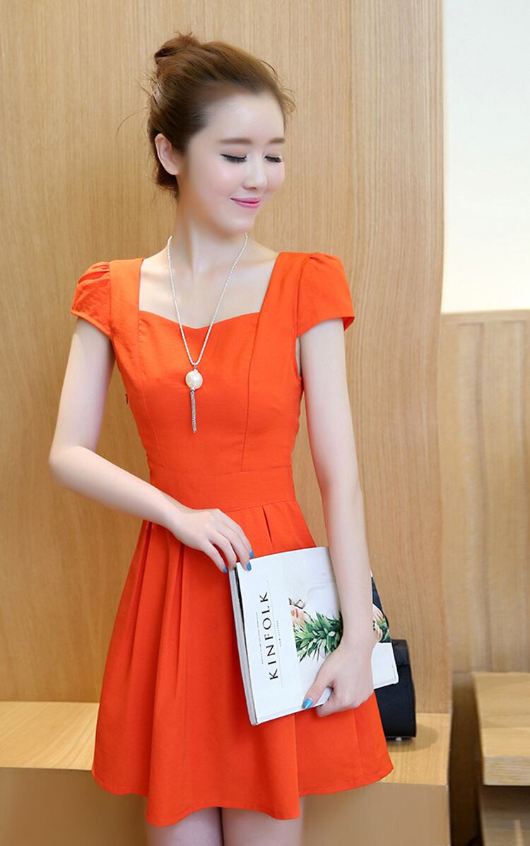 全4色 ワンピース リネン 麻 コットン 綿 ミニ丈 ビビットカラー フレア スクエアネック スリム Aライン バックボタン バックV バックコンシャス バックシャン タック入り 半袖 可愛い お出かけ デート リゾート 夏