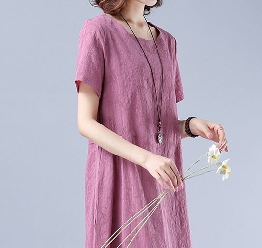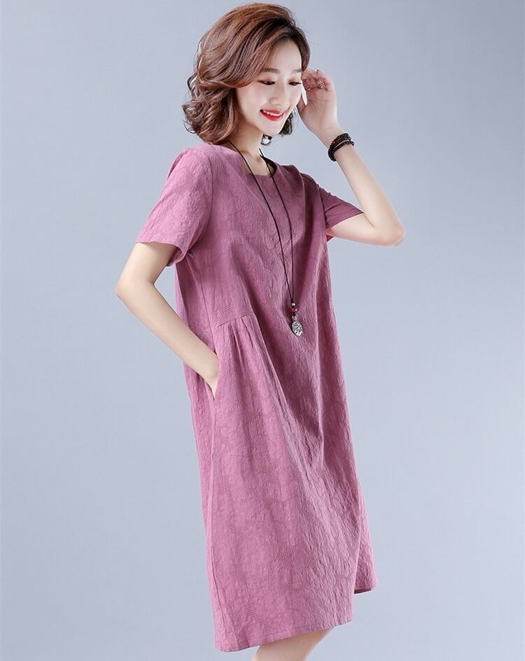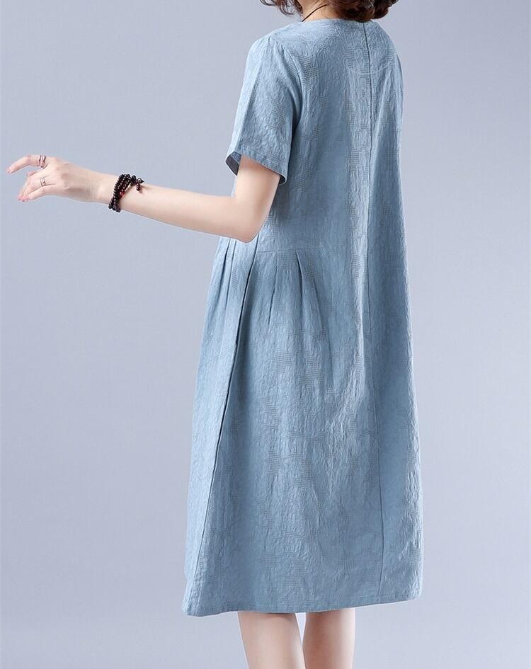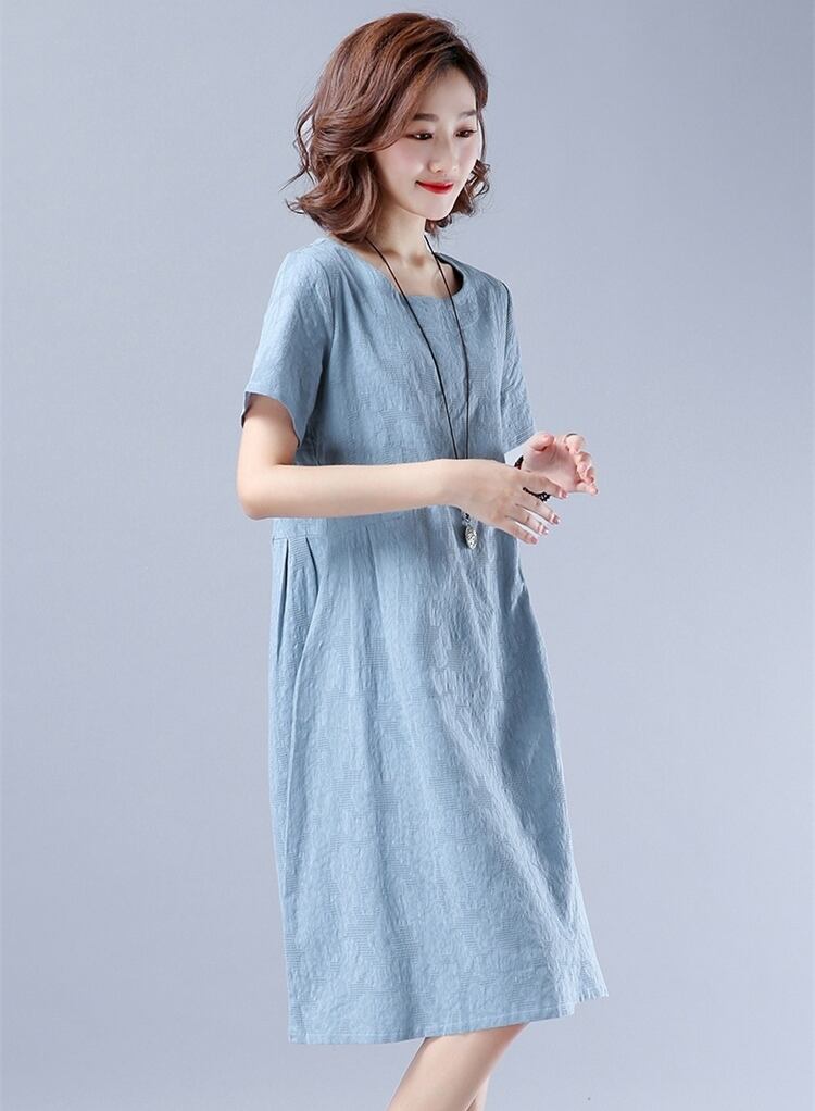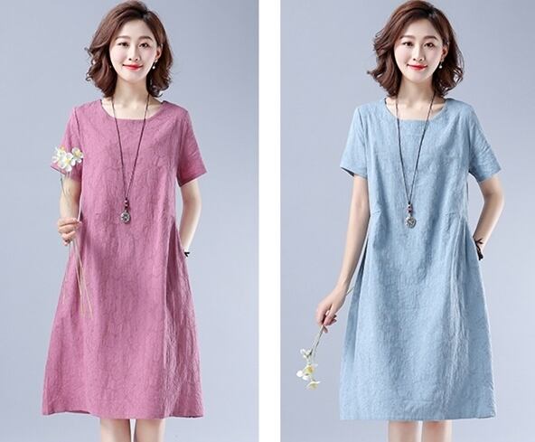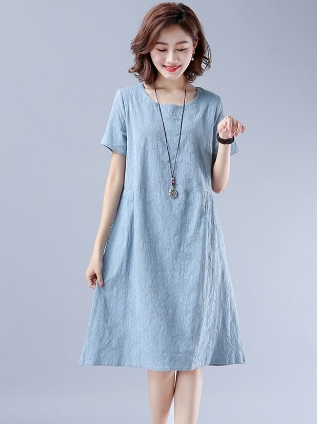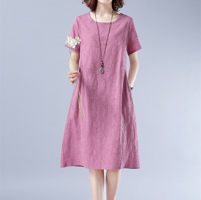 全2色 ワンピース リネン 麻 コットン 綿 ミディ丈 ラウンドネック ゆったり Aライン 大人 シンプル カジュアル 半袖 可愛い お出かけ デート 夏
