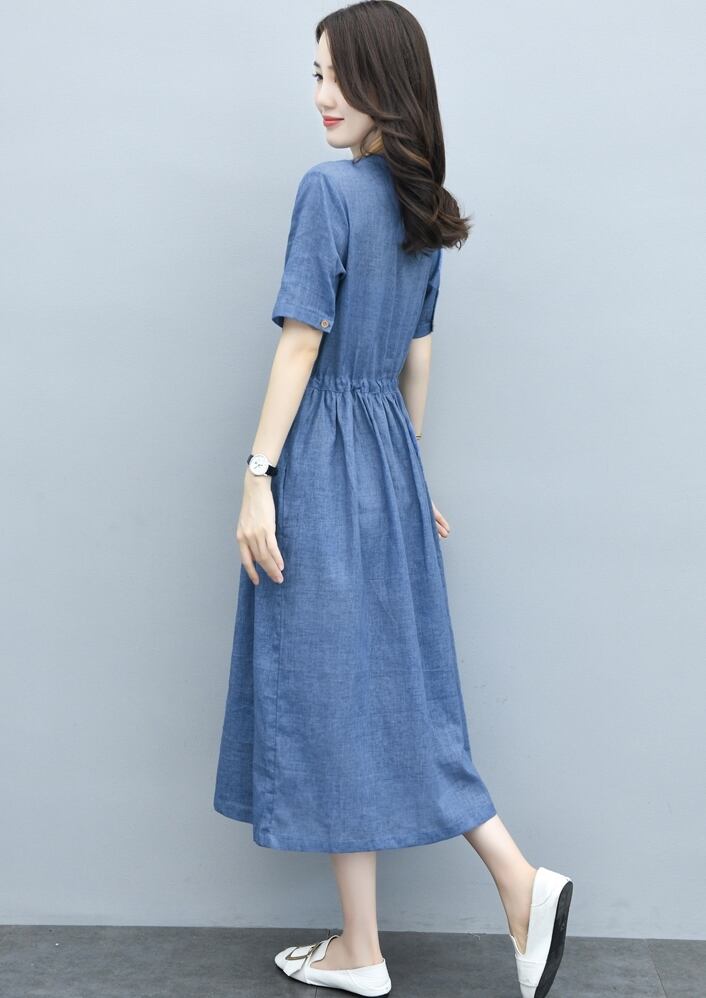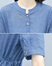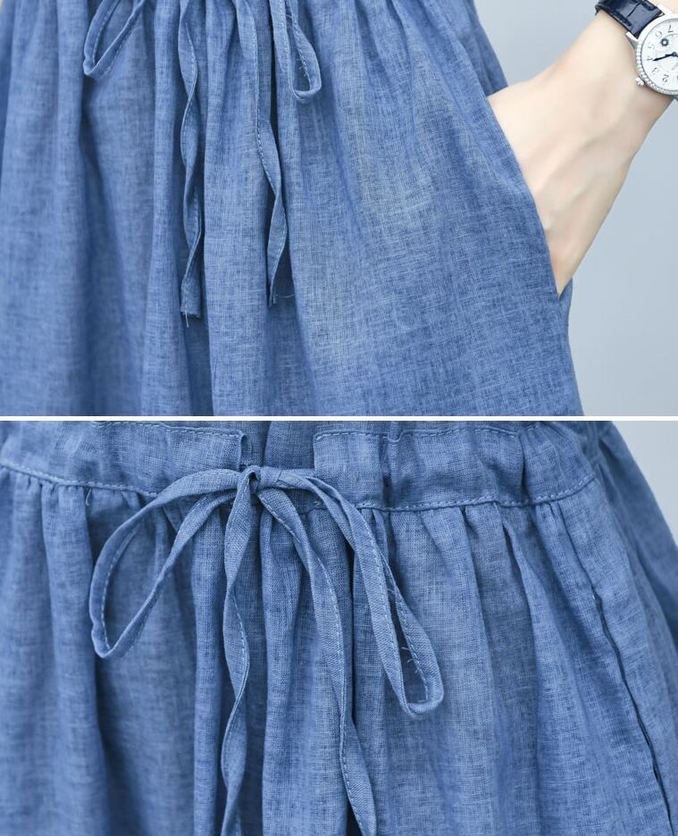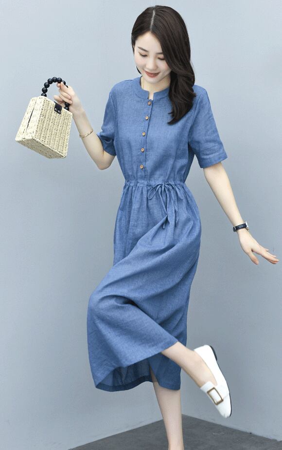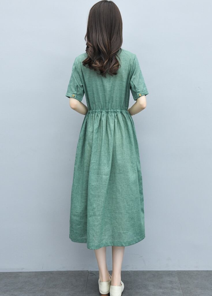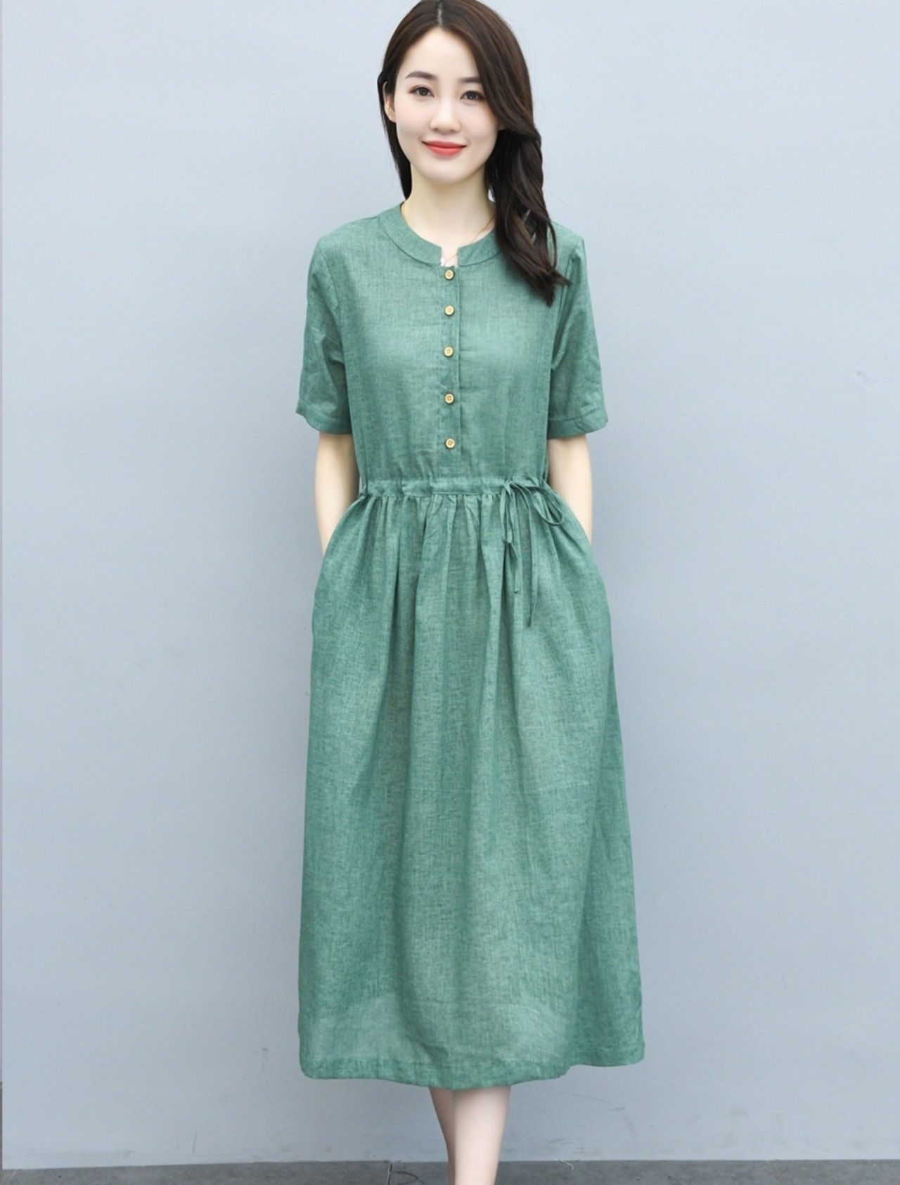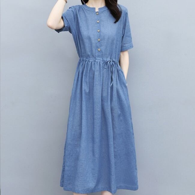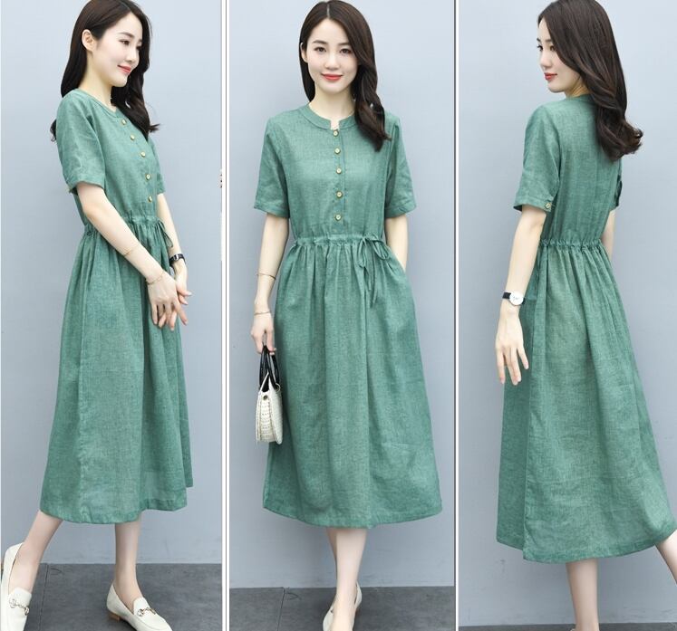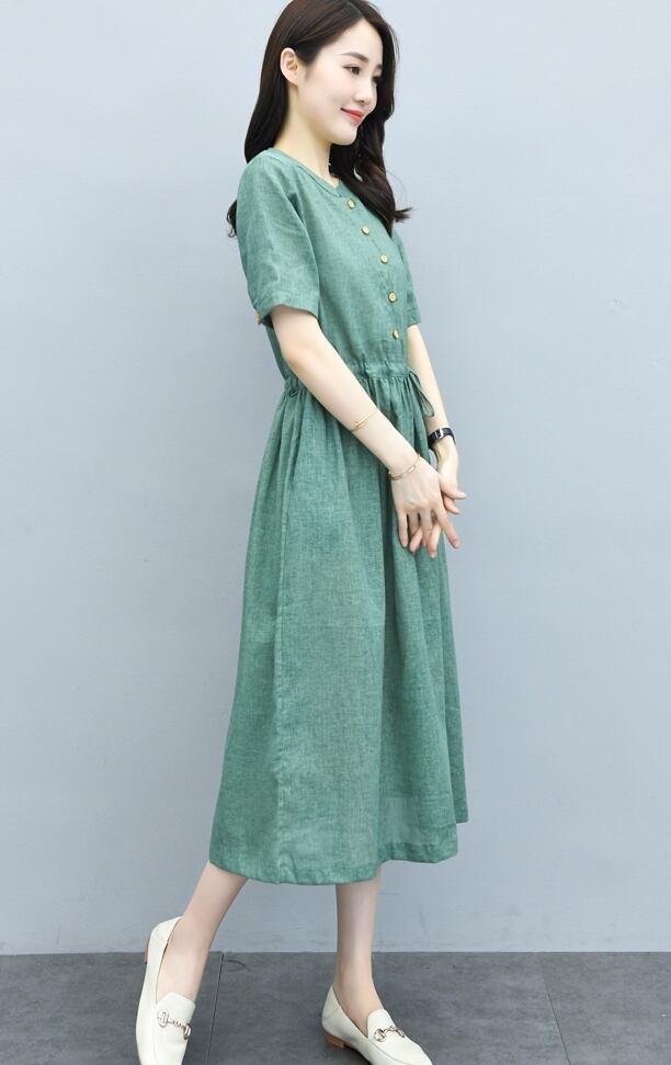 全2色 ワンピース リネン 麻 コットン 綿 ミモレ丈 フロントボタン クルーネック ウエストシャーリング Aライン 大人 シンプル デイリー カジュアル 5分袖 大人可愛い お出かけ デート 夏