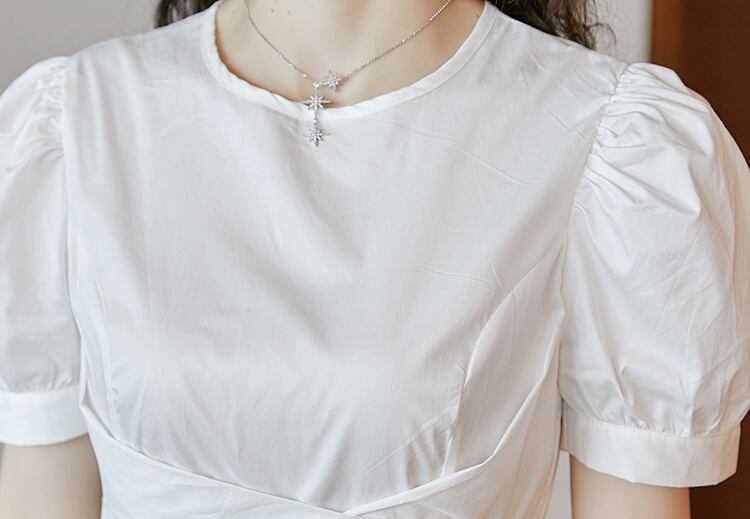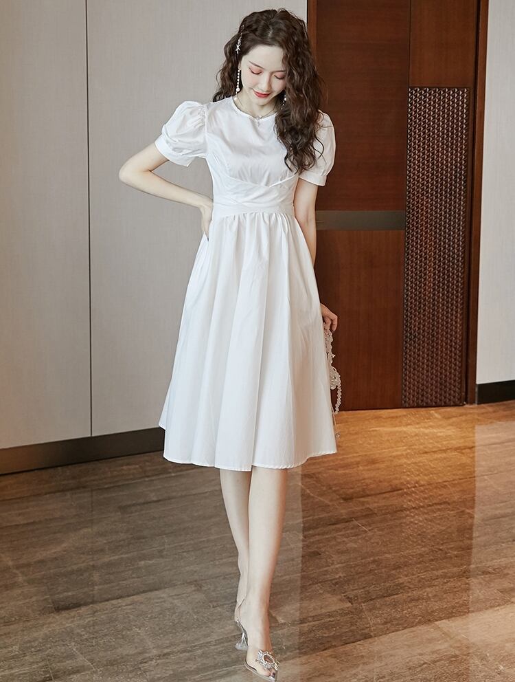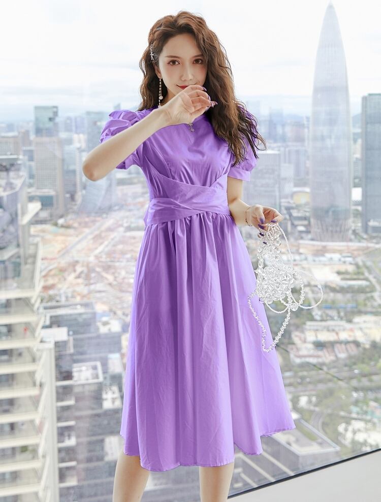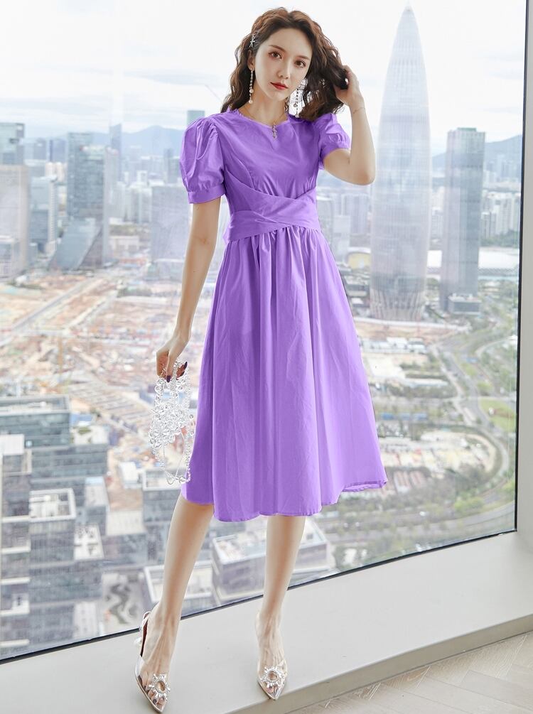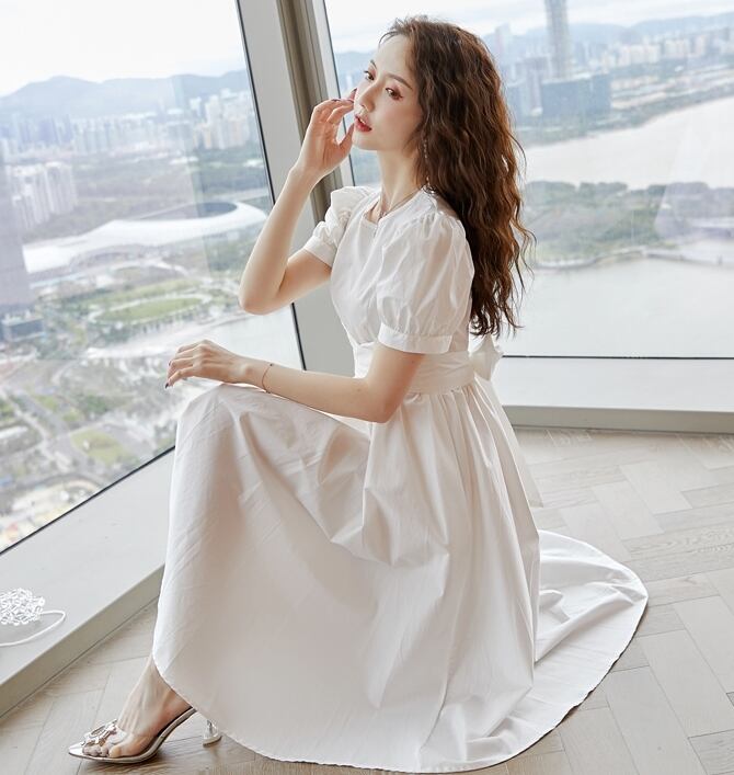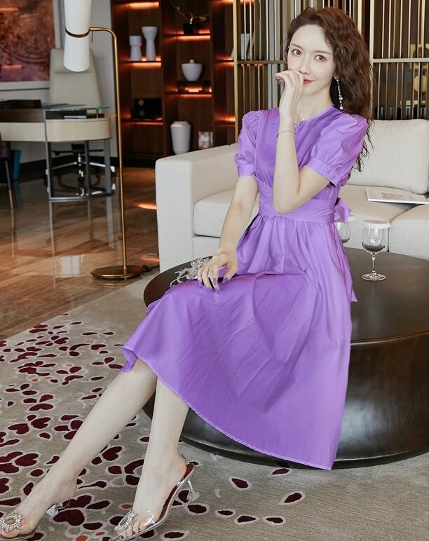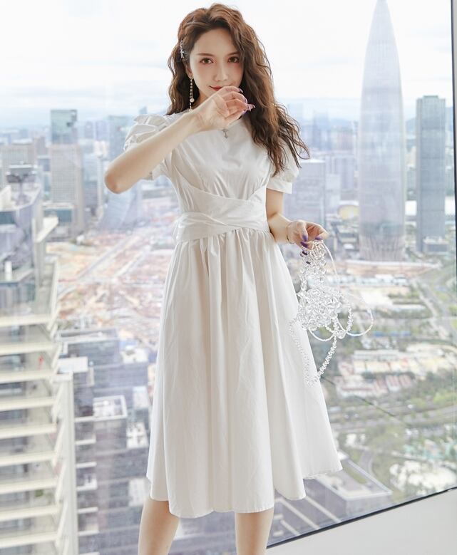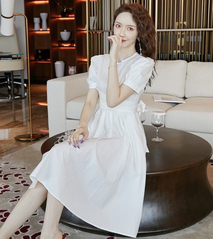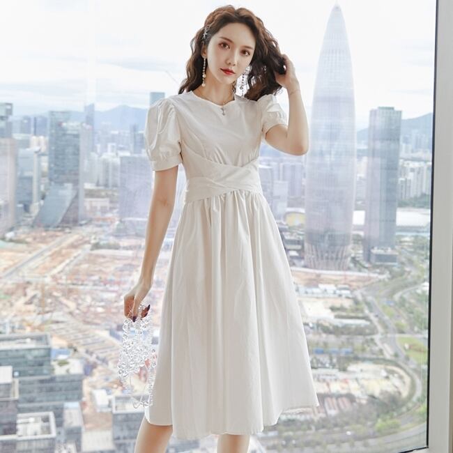 ワンピース 麻 綿 リネン コットン ミモレ丈 クルーネック バックリボン 大人可愛い 上品 フレア パフスリーブ 半袖 お出かけ カジュアル きれいめ デート 女子会 夏