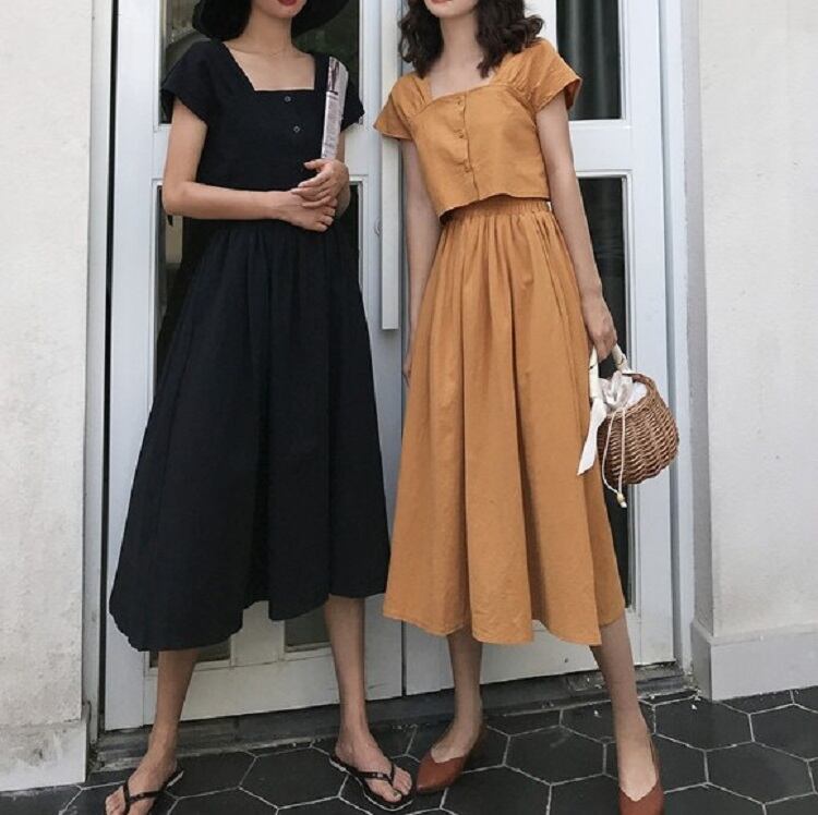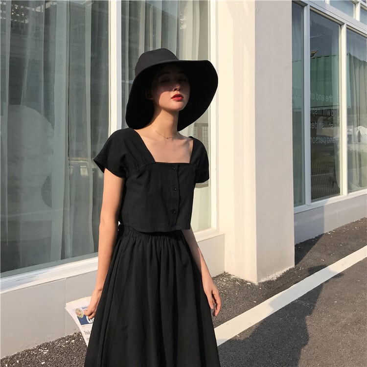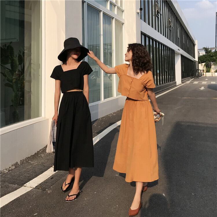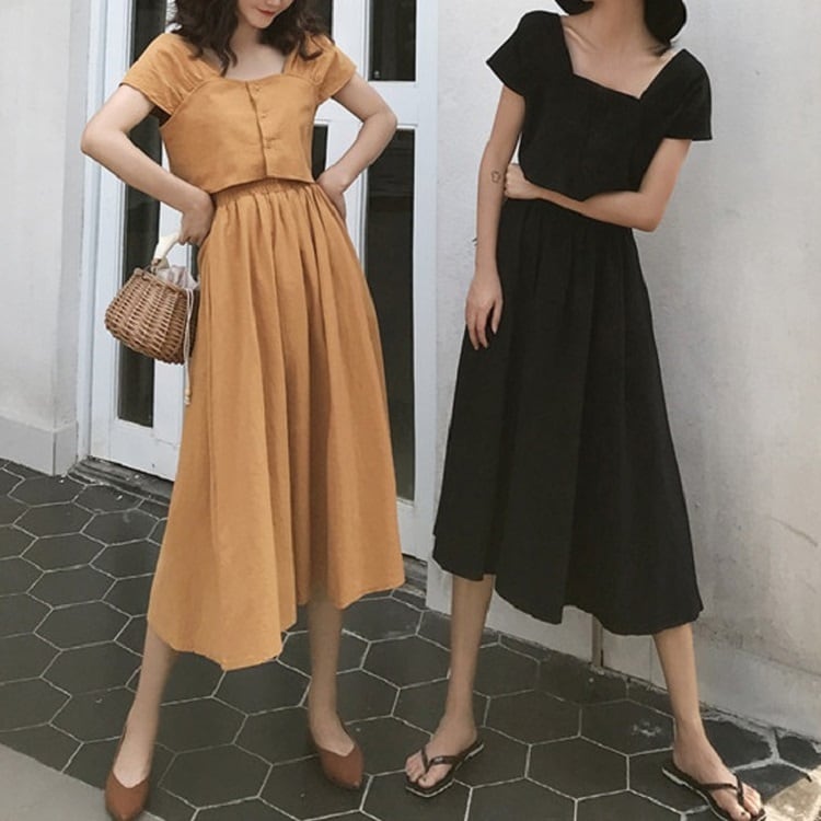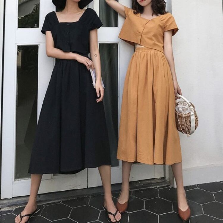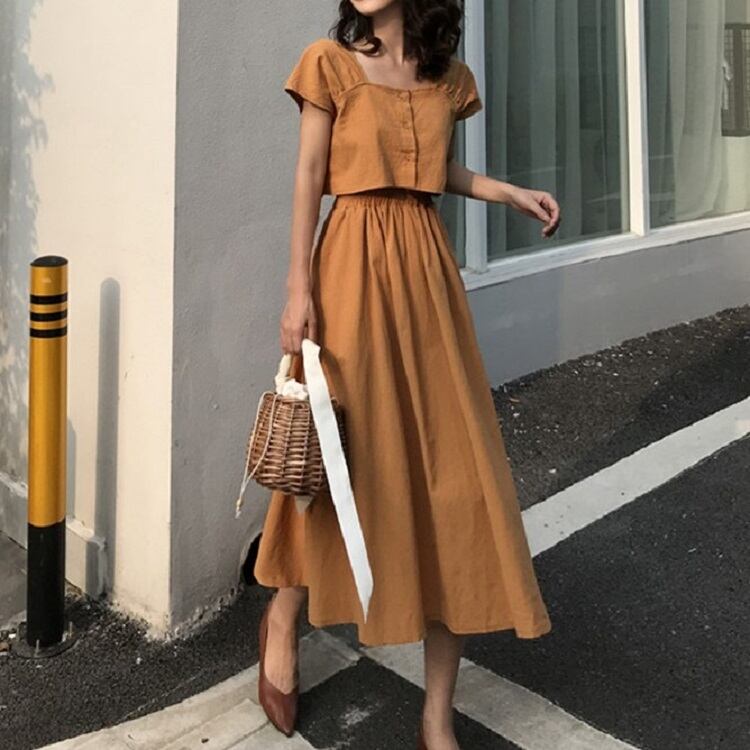 全2色 セットアップ 2点セット 麻綿リネンコットン トップス ブラウス 半袖 ショート丈 スクエアネック ギャザースカート ミディ丈 ひざ丈 無地 シンプル きれいめ カジュアル お出かけ デート リゾート デイリー 普段着 夏 ブラック イエロー