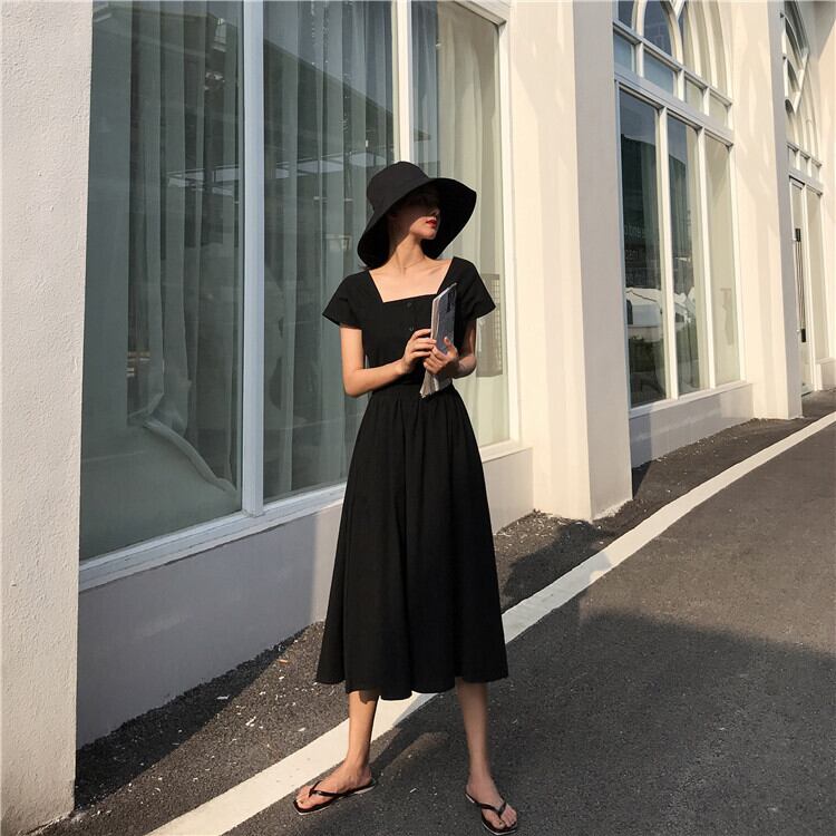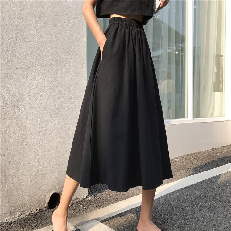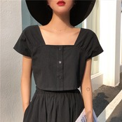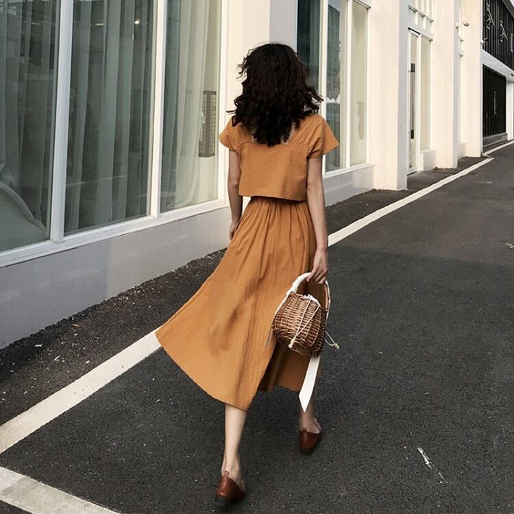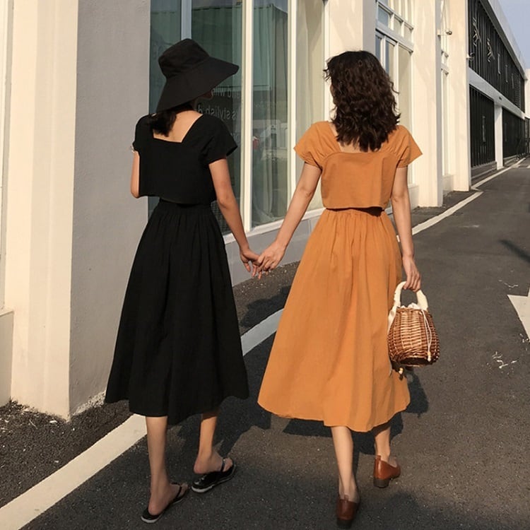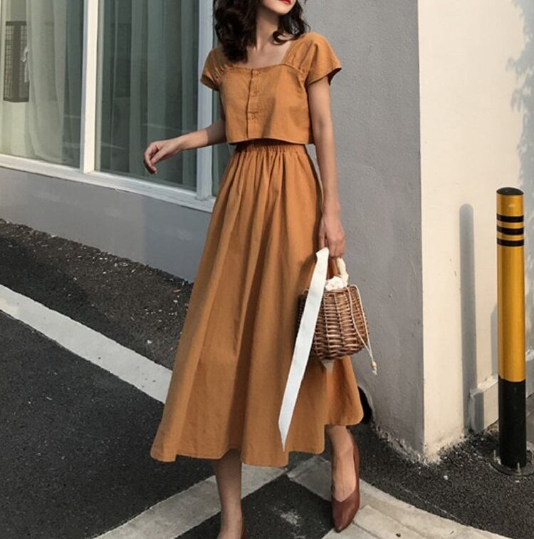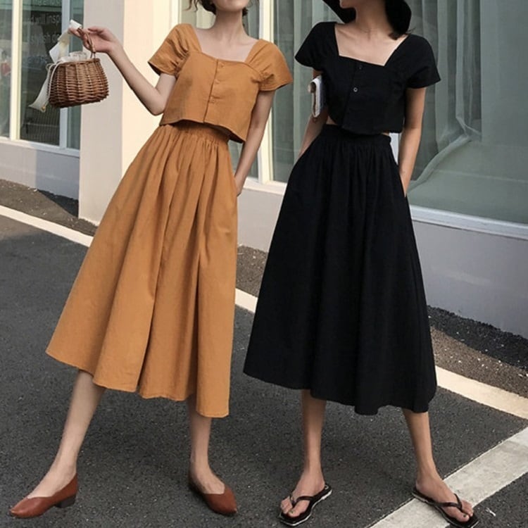 全2色 セットアップ 2点セット 麻綿リネンコットン トップス ブラウス 半袖 ショート丈 スクエアネック ギャザースカート ミディ丈 ひざ丈 無地 シンプル きれいめ カジュアル お出かけ デート リゾート デイリー 普段着 夏 ブラック イエロー