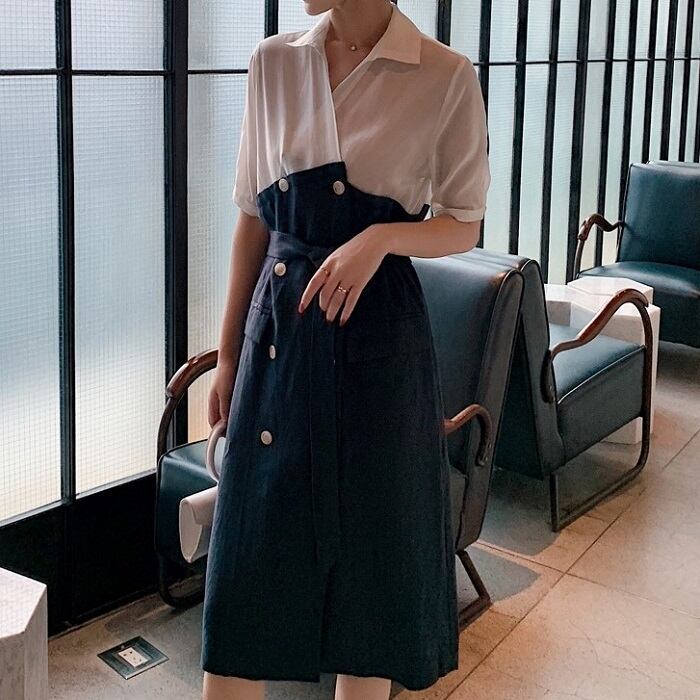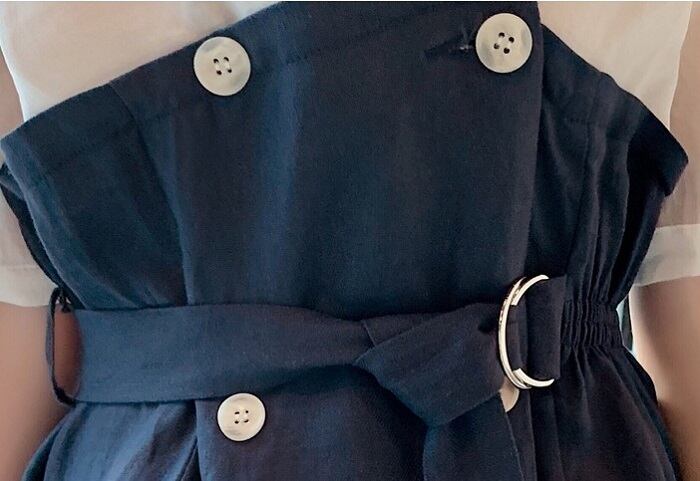 ダブルボタンがレトロな雰囲気のひざ丈ワンピース。