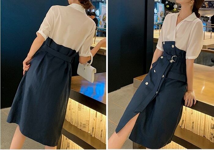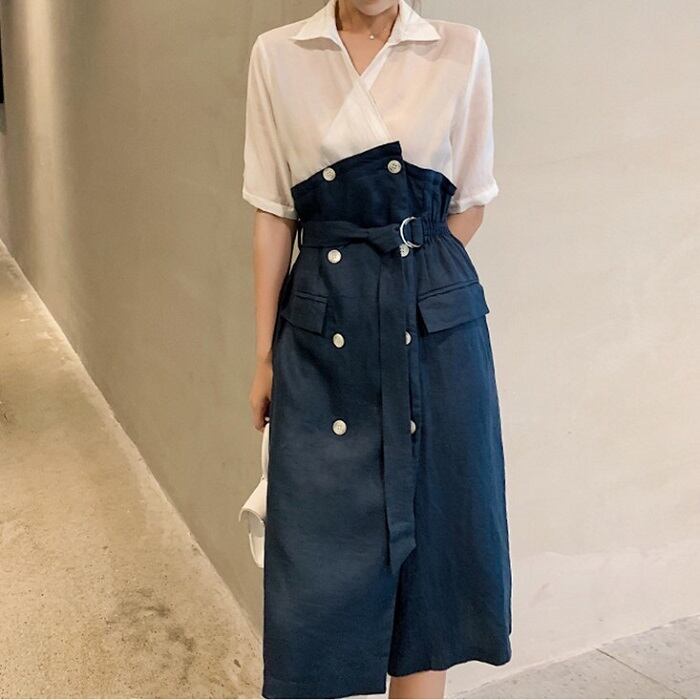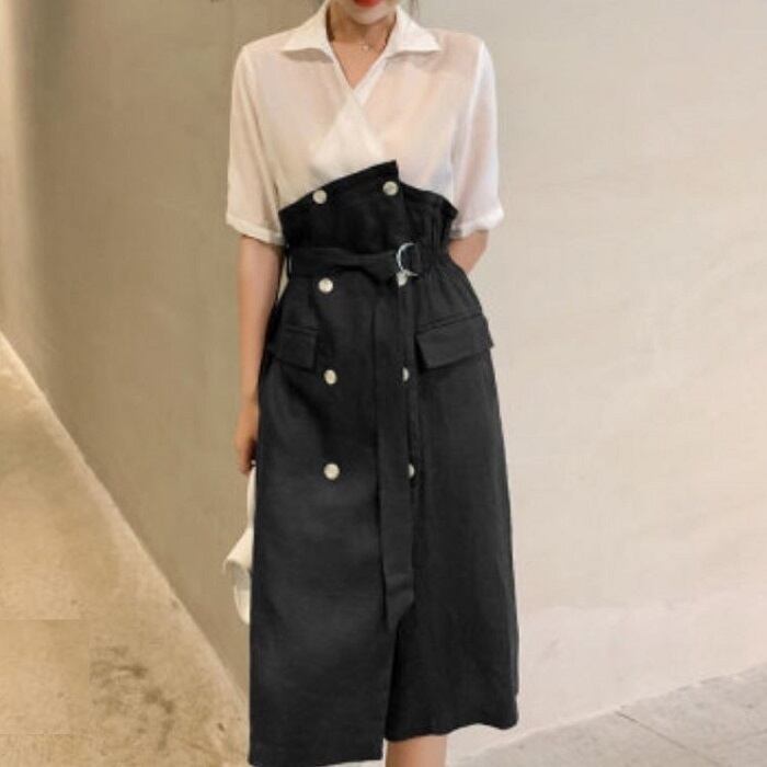 全2色 大きいサイズ ワンピース ひざ丈 切替え ダブルボタン 襟付き Vネック Aライン 麻綿リネンコットン 半袖 シンプル レトロ きれいめ カジュアル お出かけ デート リゾート デイリー 普段着 夏 ネイビー ブラック