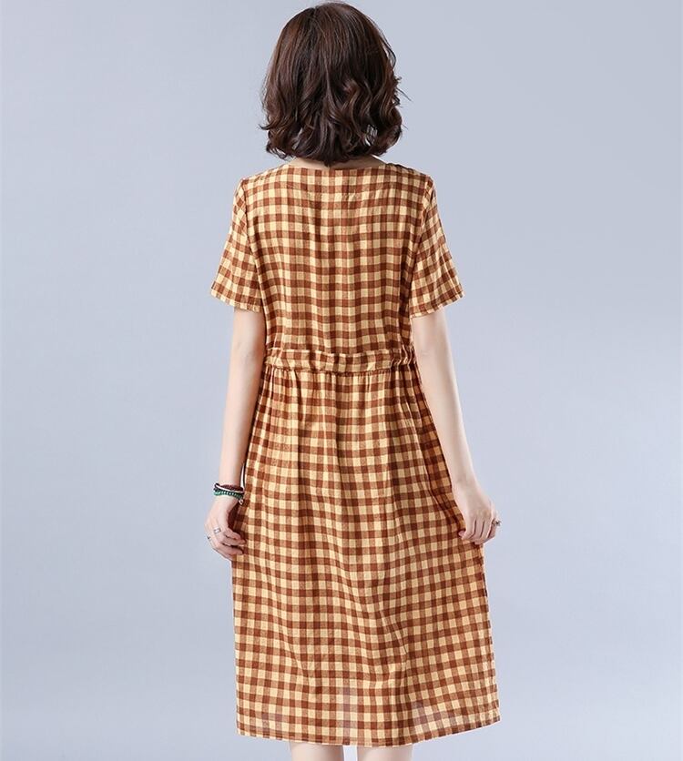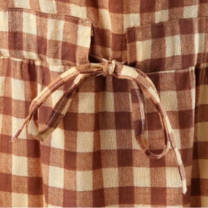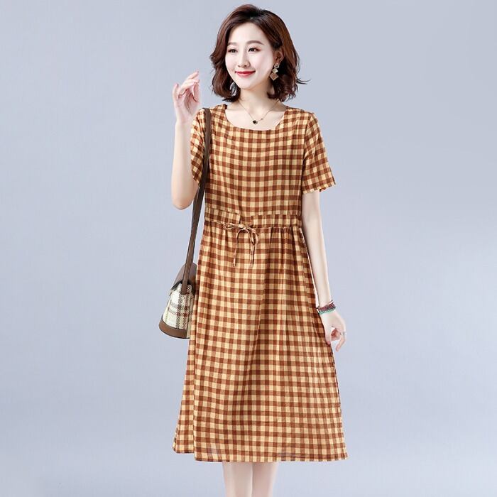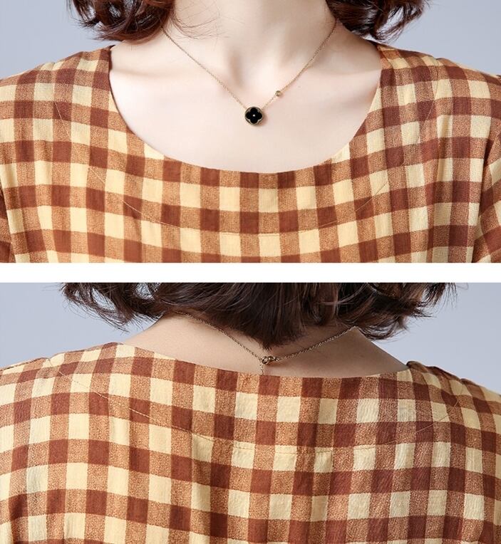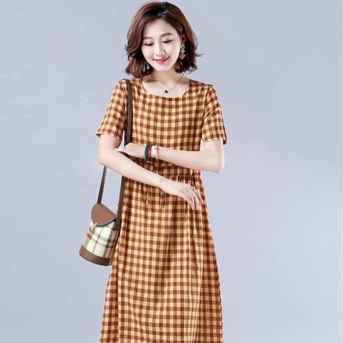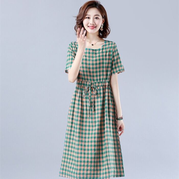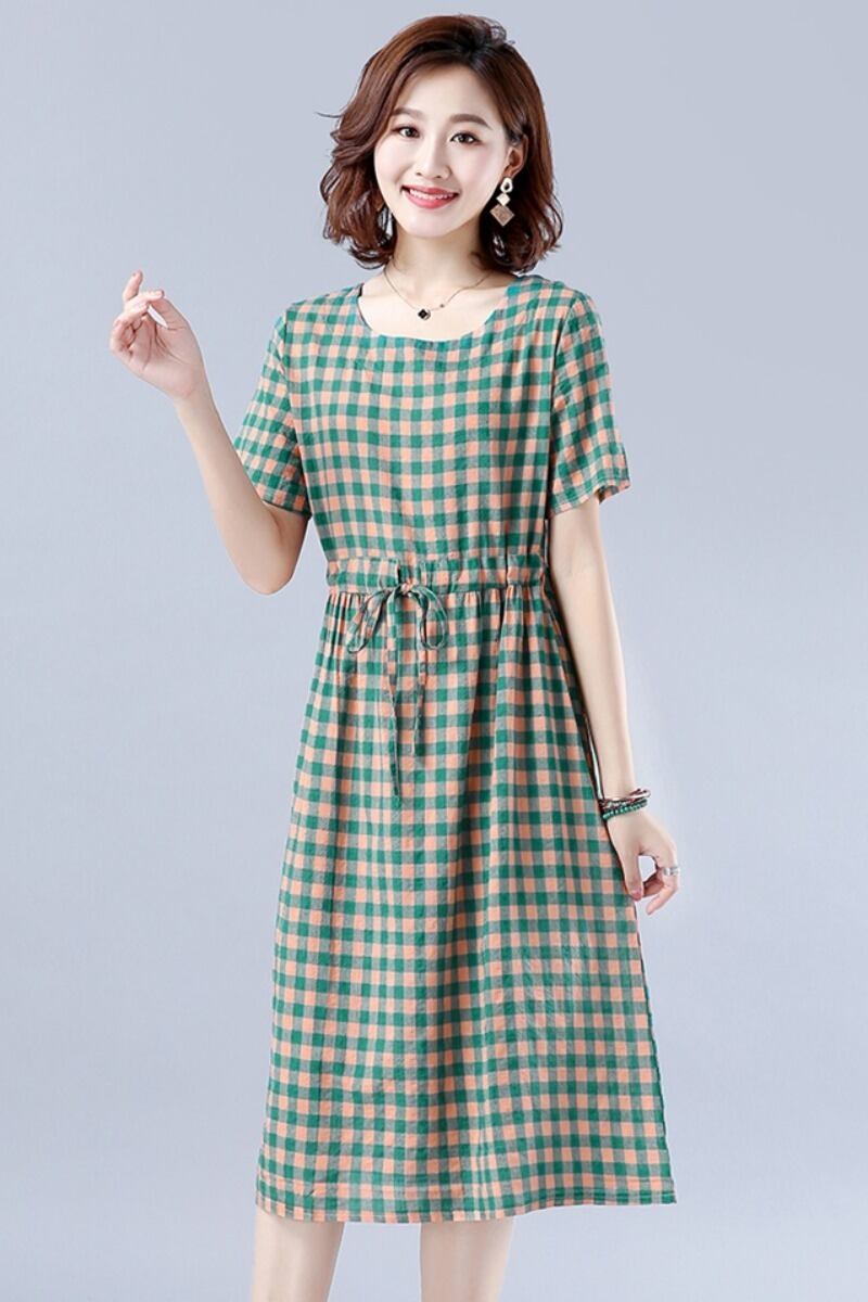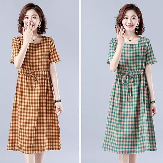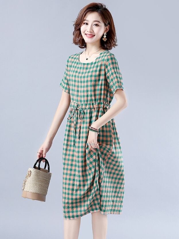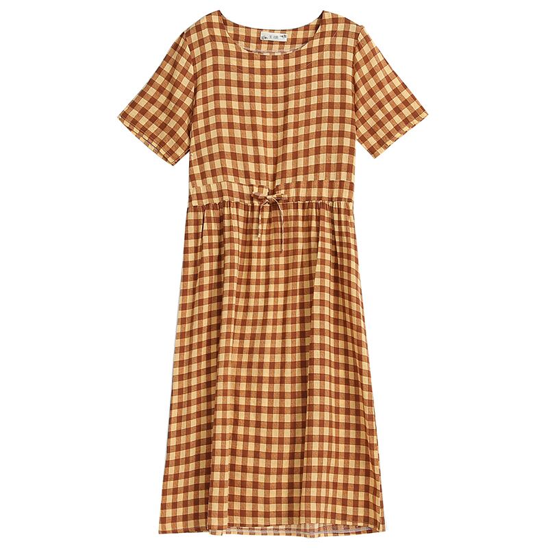 全2色 ワンピース リネン 麻 コットン 綿 ミモレ丈 チェック柄 スクエアネック ゆったり ウエストリボン Aライン 大人 シンプル デイリー カジュアル 半袖 お出かけ シンプル 夏