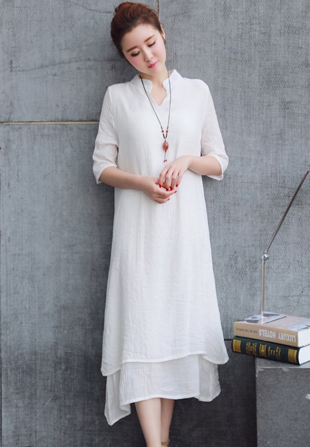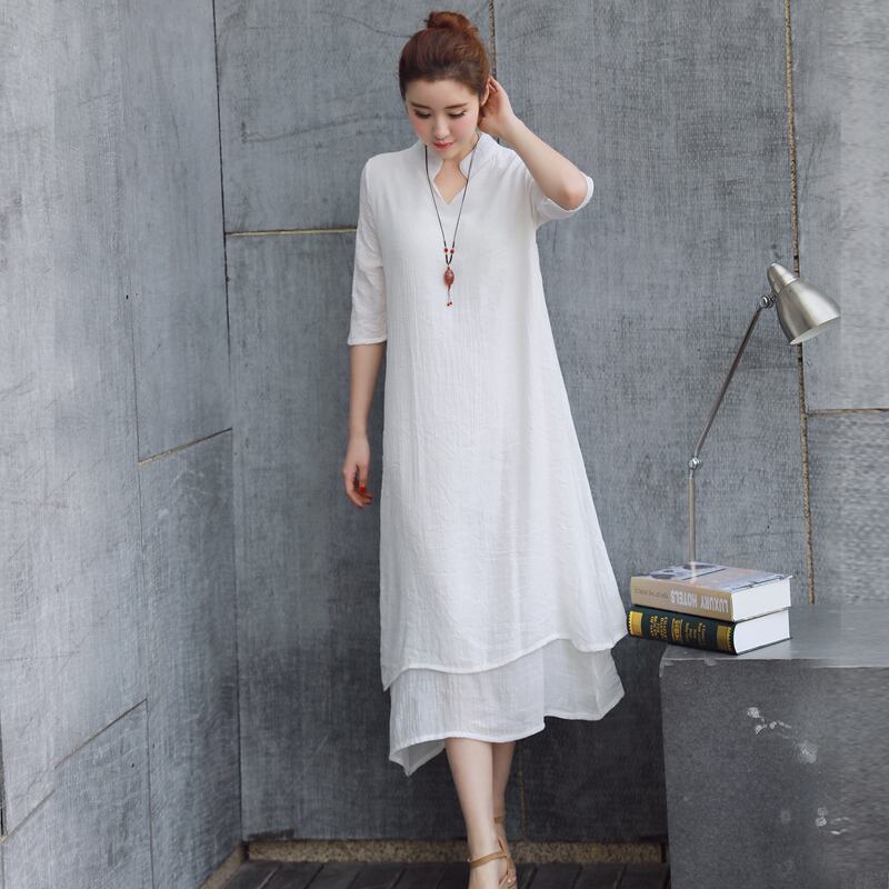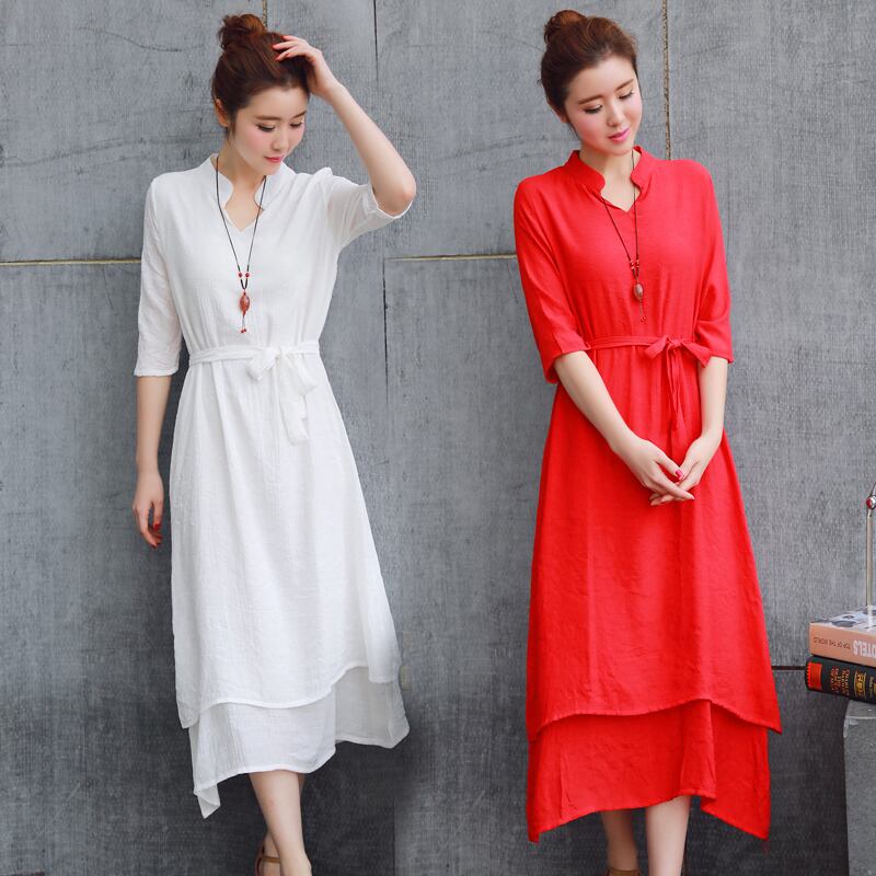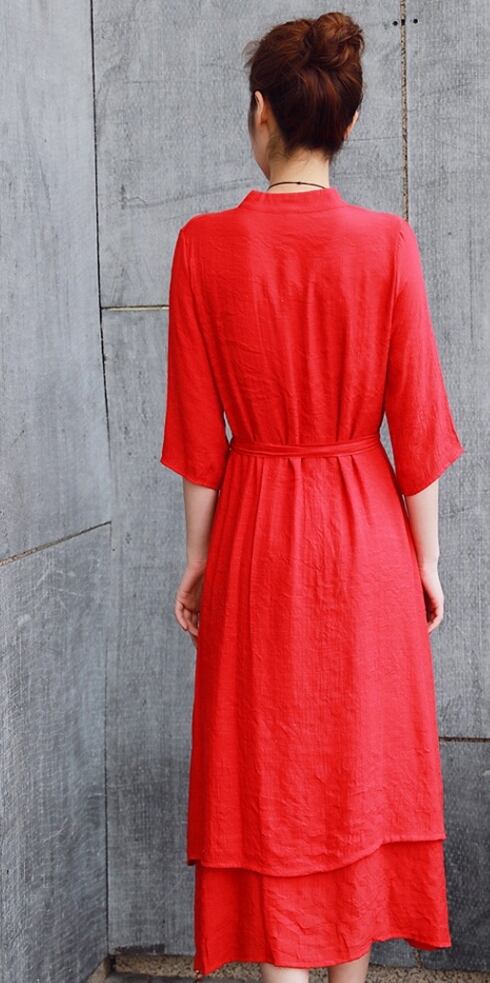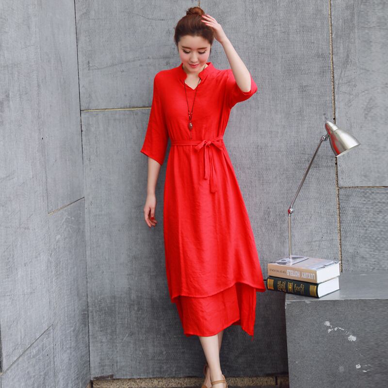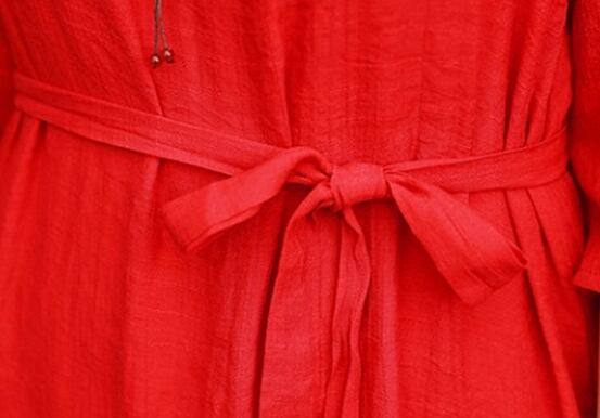 全2色 ワンピース リネン コットン 綿 麻 Vネック 7分袖 ミモレ丈 ウエストリボン ゆったり 体型カバー 大人 カジュアル お出かけ リゾート デート フレア 夏