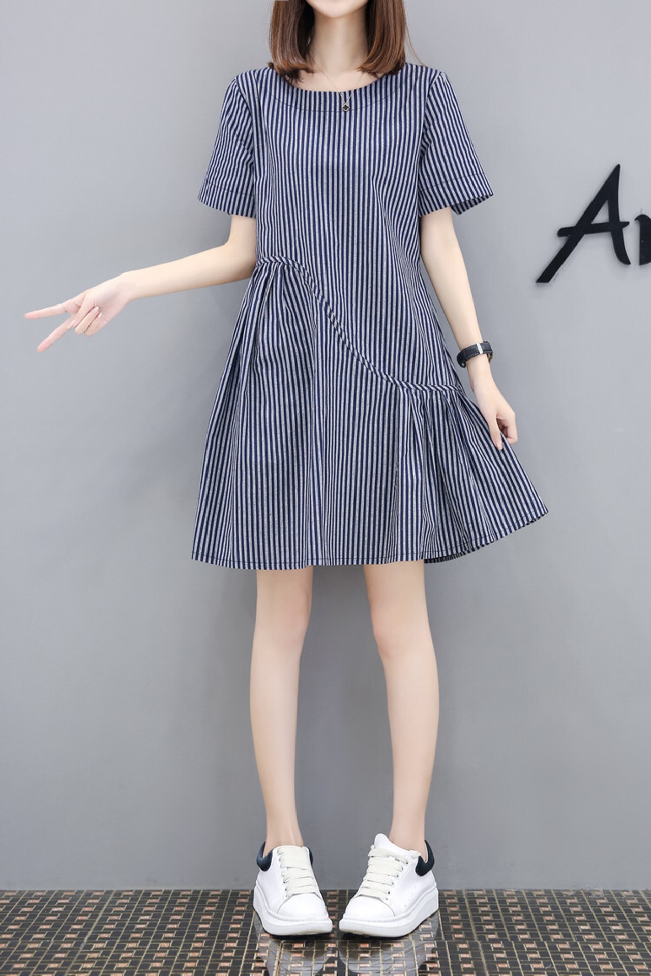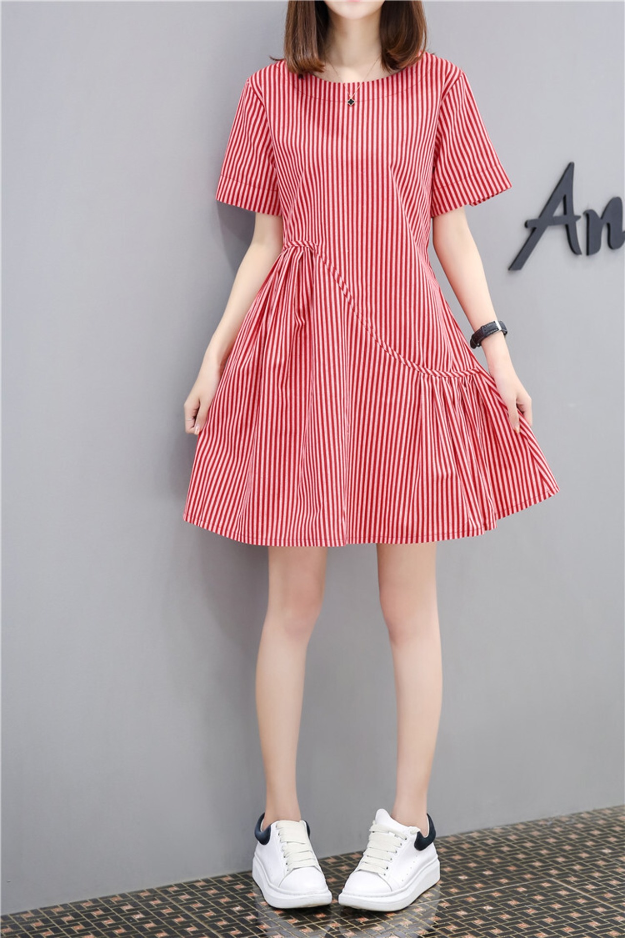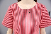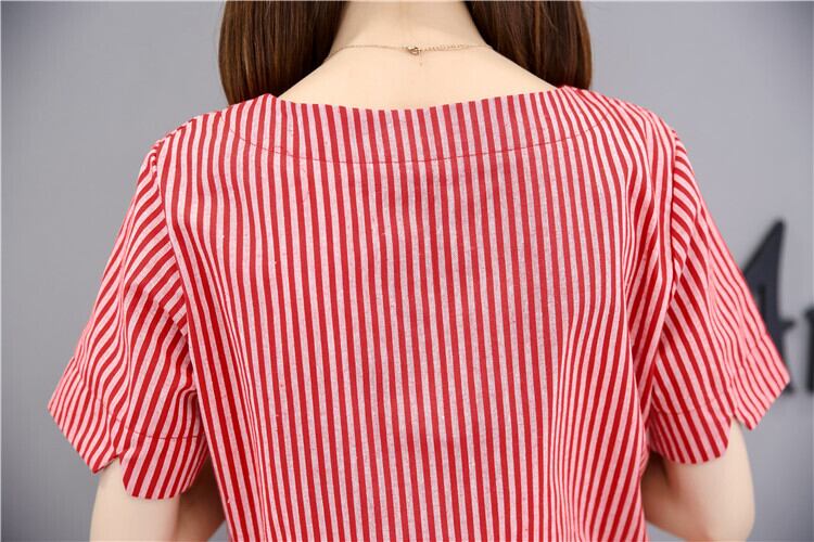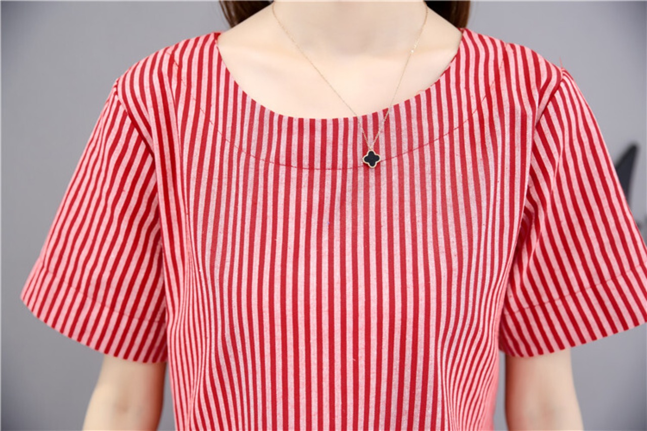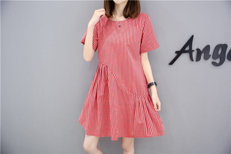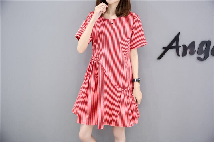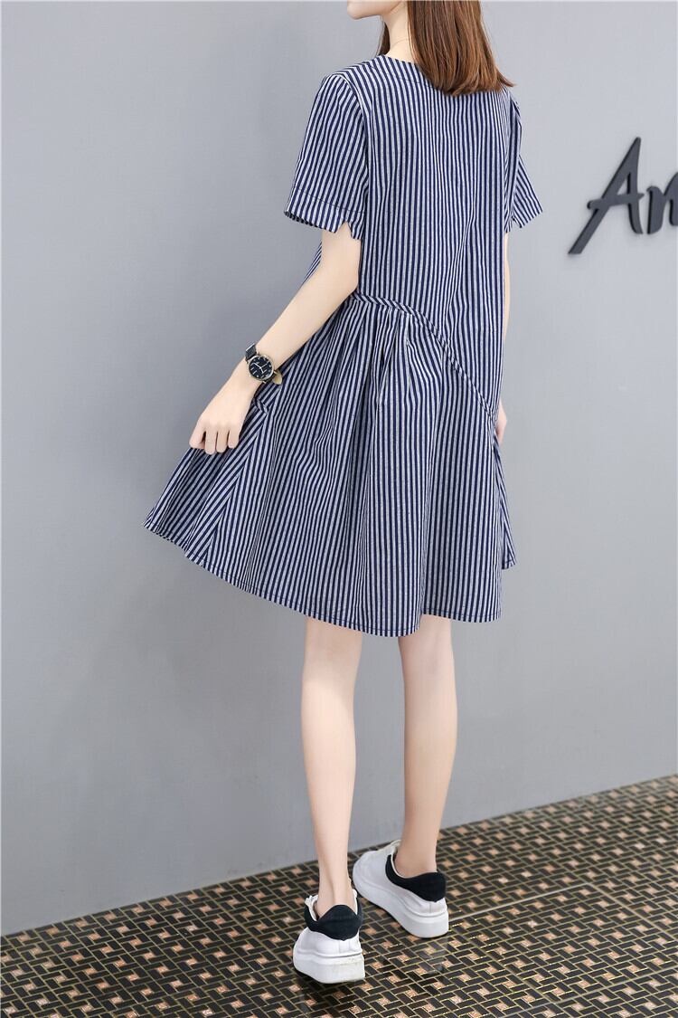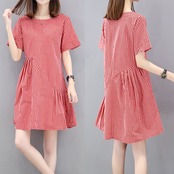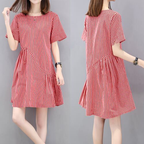 全2色 ワンピース 麻 綿 リネン コットン ストライプ ミニ丈 Aライン フレア ラウンドネック ドレープ ゆったり ガーリー 半袖 可愛い お出かけ カジュアル デート リゾート 夏