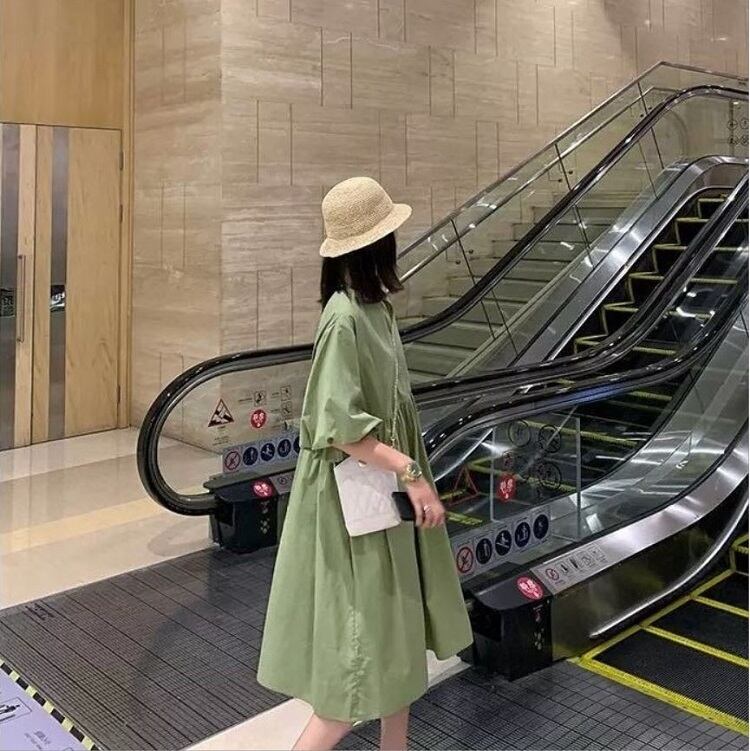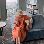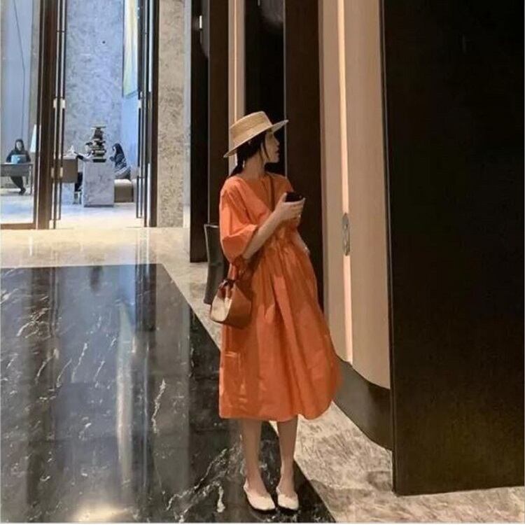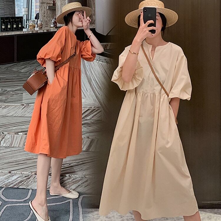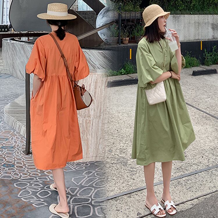 全4色 大きいサイズ ワンピース Aライン フレアスカート 麻綿リネンコットン ひざ丈 ミディ丈 ラウンドネック パフスリーブ 半袖 シンプル 無地 きれいめ レトロ ゆったり カジュアル お出かけ デート リゾート デイリー 普段着 夏 オレンジ アプリコット グリーン ホワイト