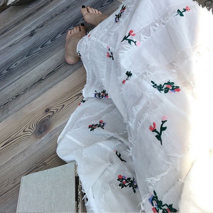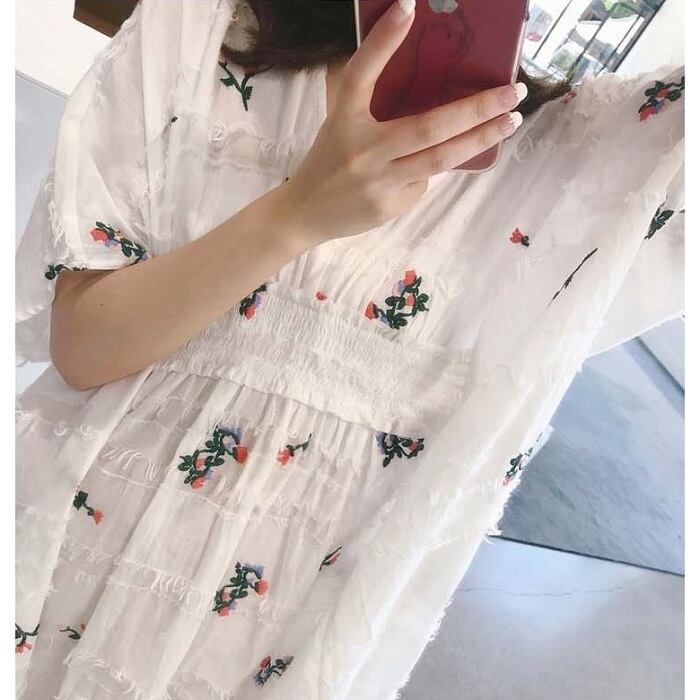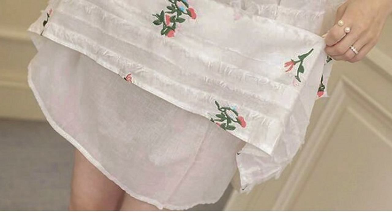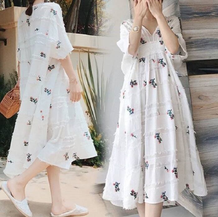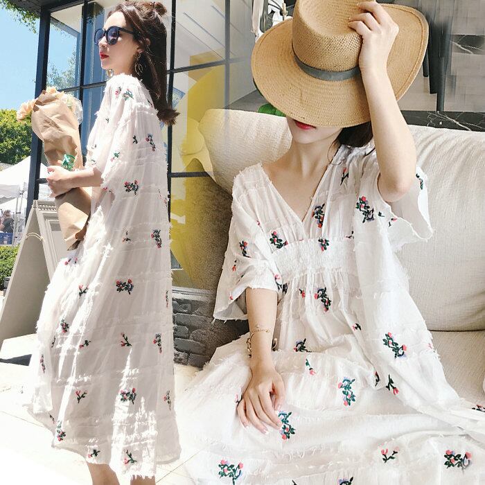 大きいサイズ ワンピース Aライン フレアスカート 麻綿リネンコットン ひざ丈 ミディ丈 Vネック フレアスリーブ 半袖 シンプル 花柄 きれいめ レトロ ゆったり カジュアル マタニティ お出かけ デート リゾート デイリー 普段着 夏 ホワイト