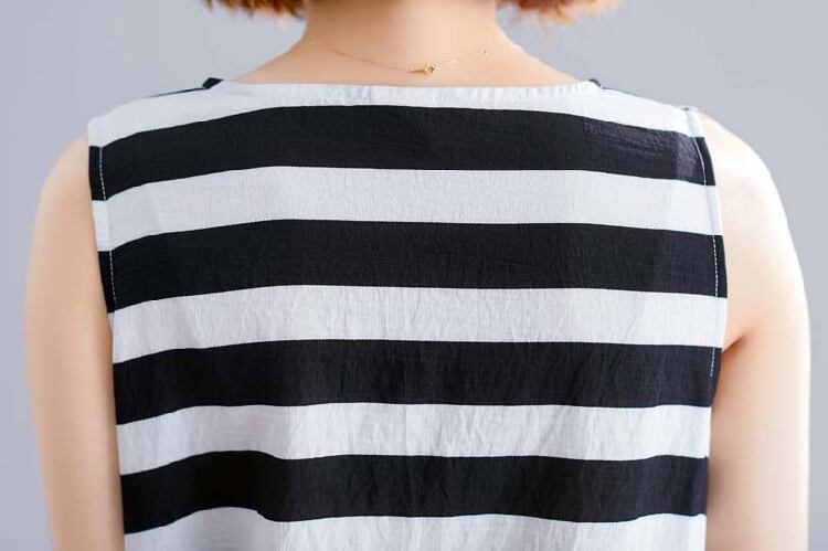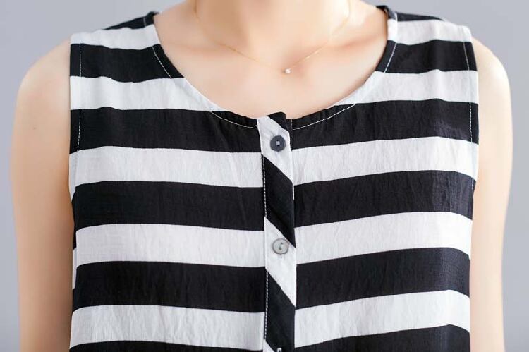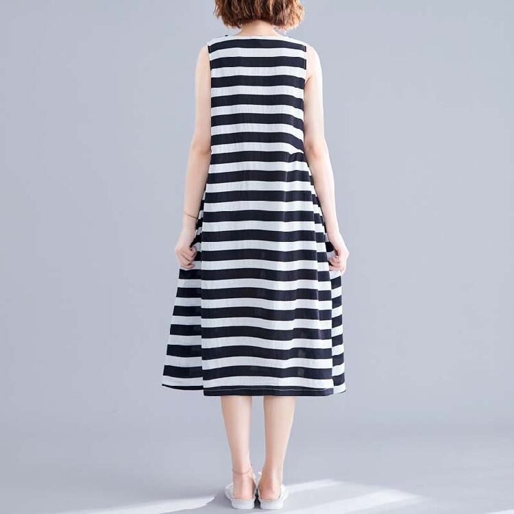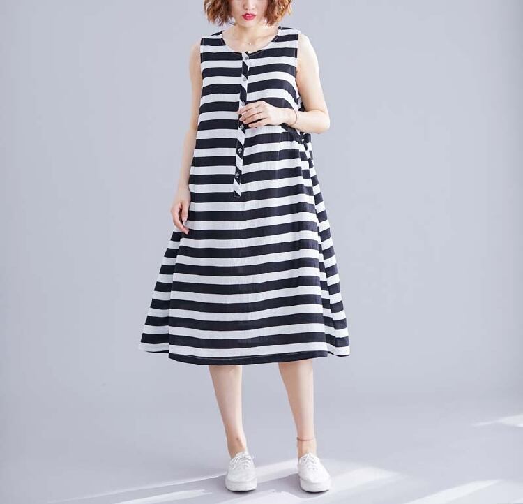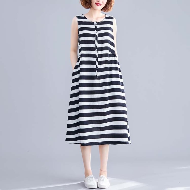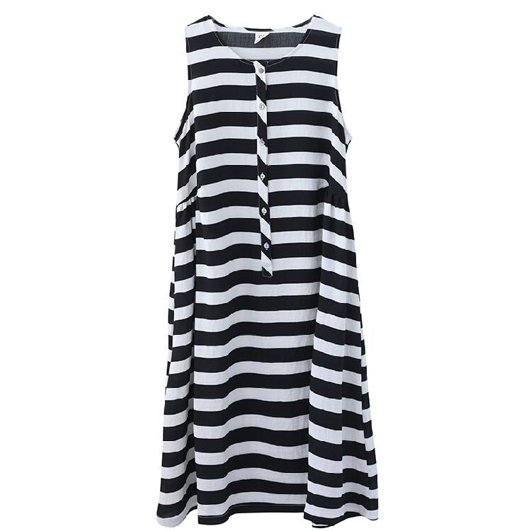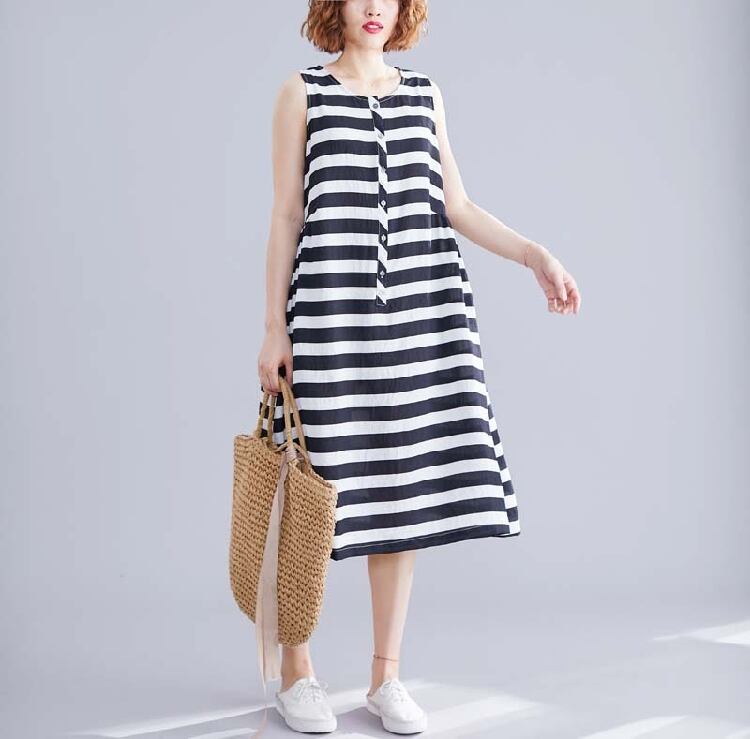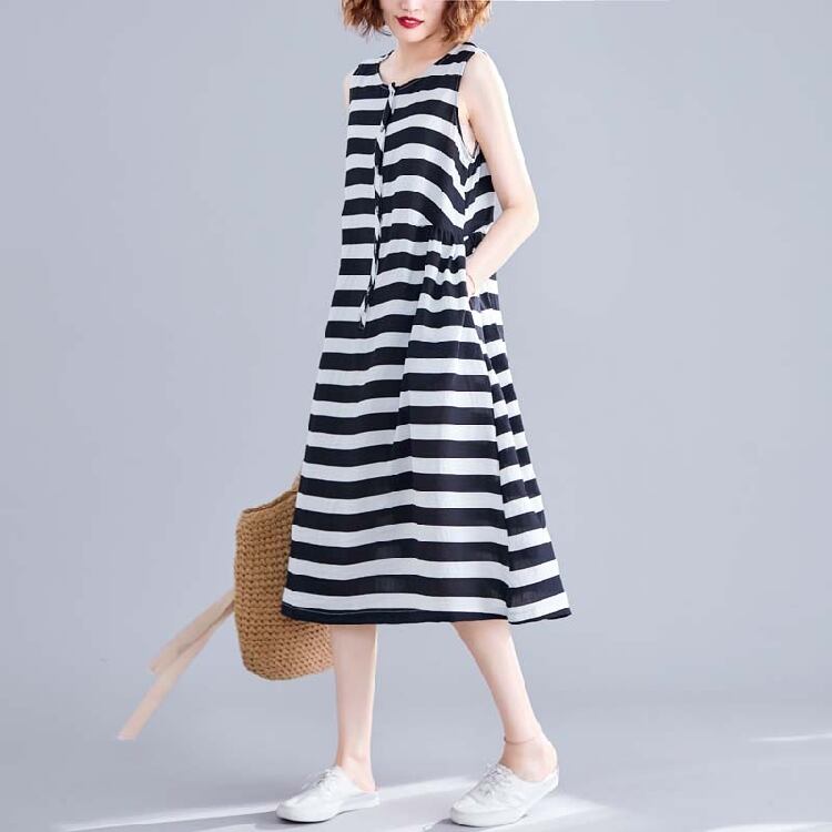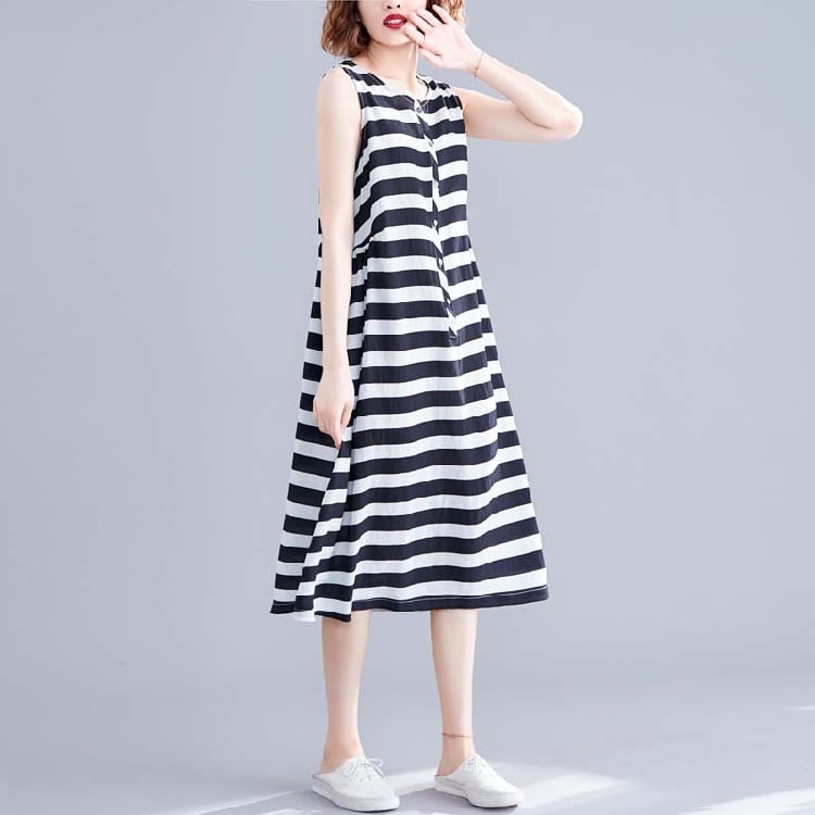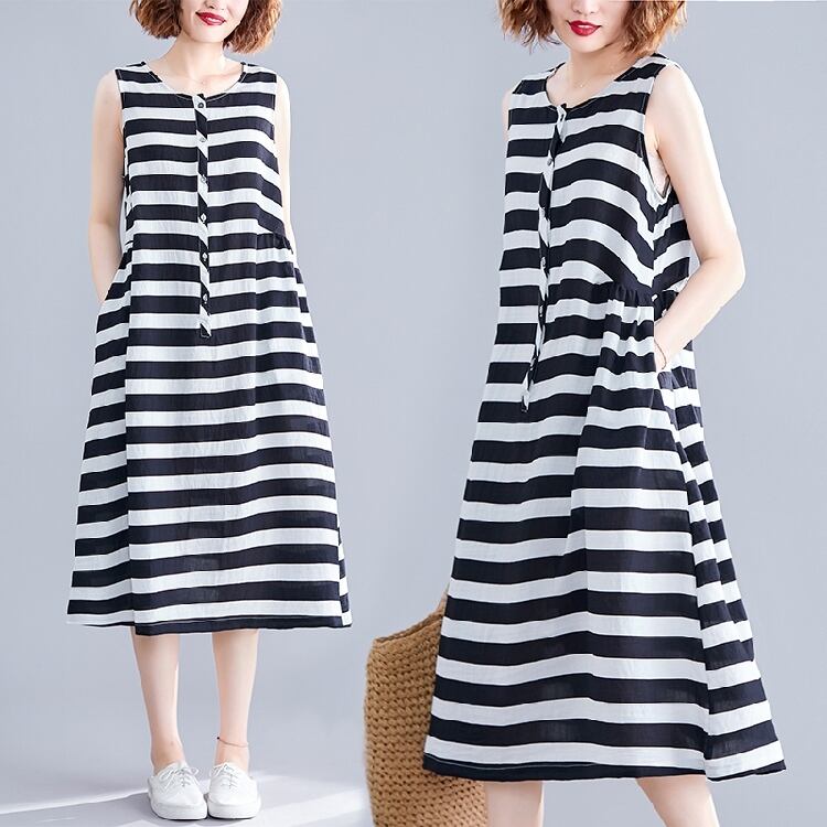 ボーダーワンピース 麻綿リネンコットン ひざ丈 ミディ丈 ラウンドネック ノースリーブ ウエストゴム シンプル レトロ ゆったり カジュアル お出かけ デート リゾート デイリー 普段着 夏 ブラック ホワイト