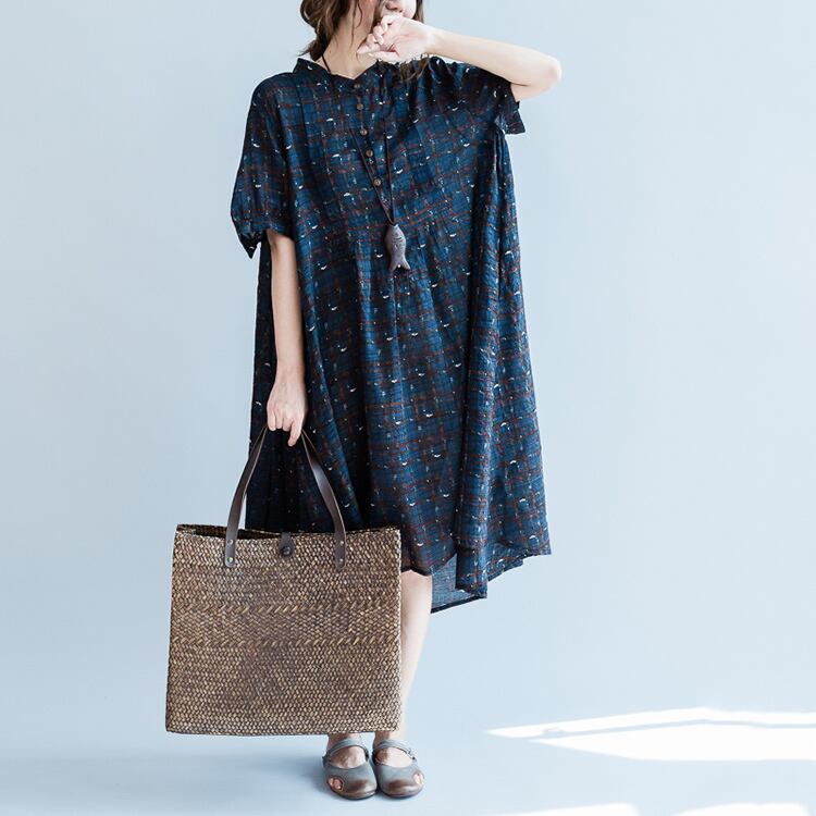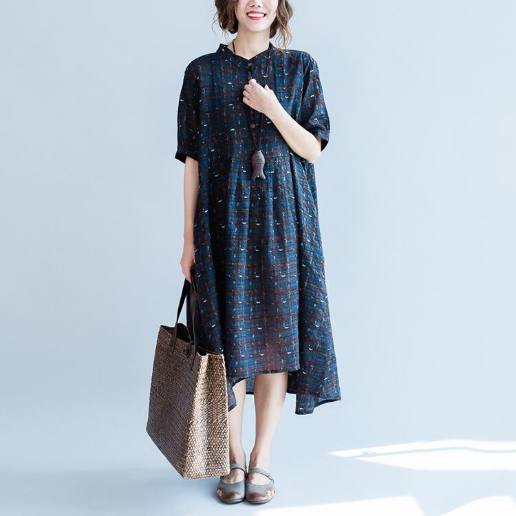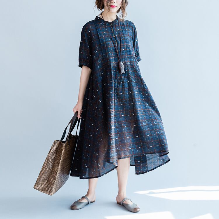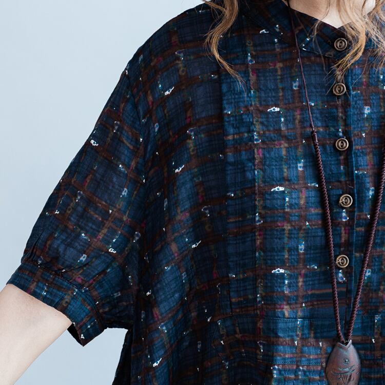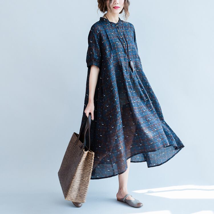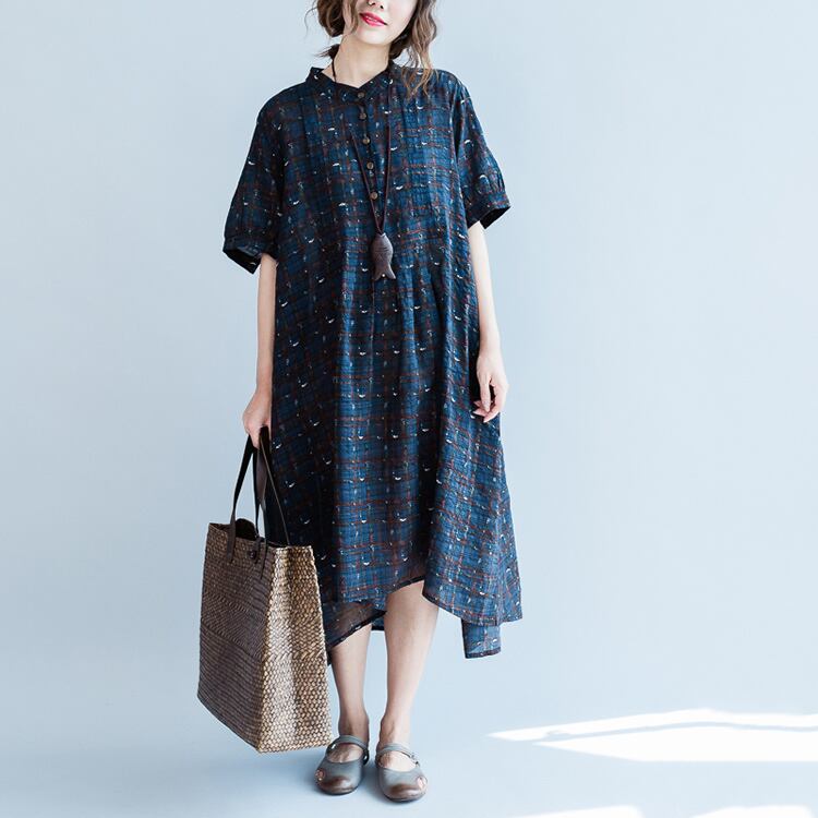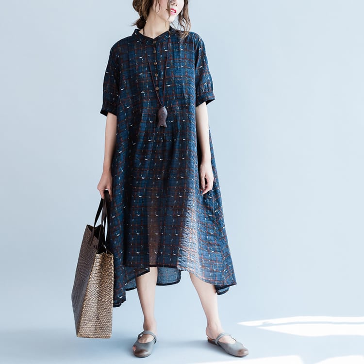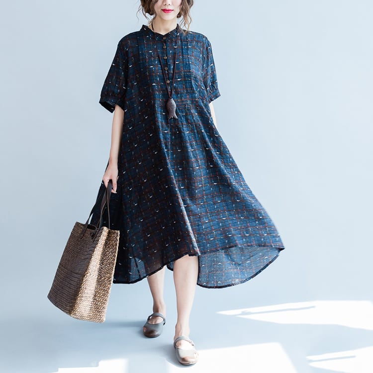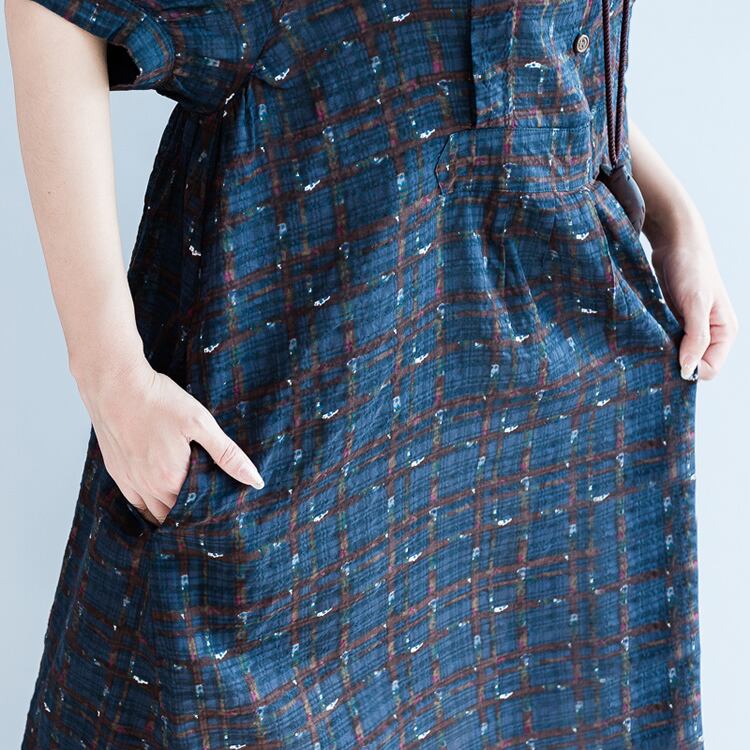 ワンピース 麻綿リネンコットン ひざ丈 ミディ丈 半袖 スタンドカラー チェック ナチュラル シンプル レトロ ゆったり 体型カバー マタニティ カジュアル お出かけ デート リゾート デイリー 普段着 夏 ブルー