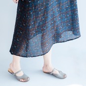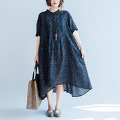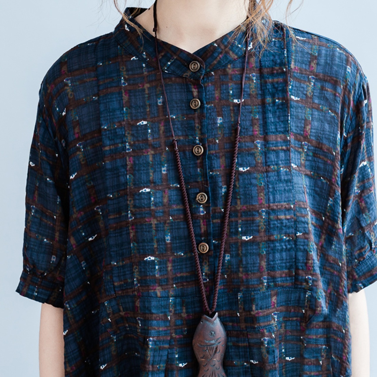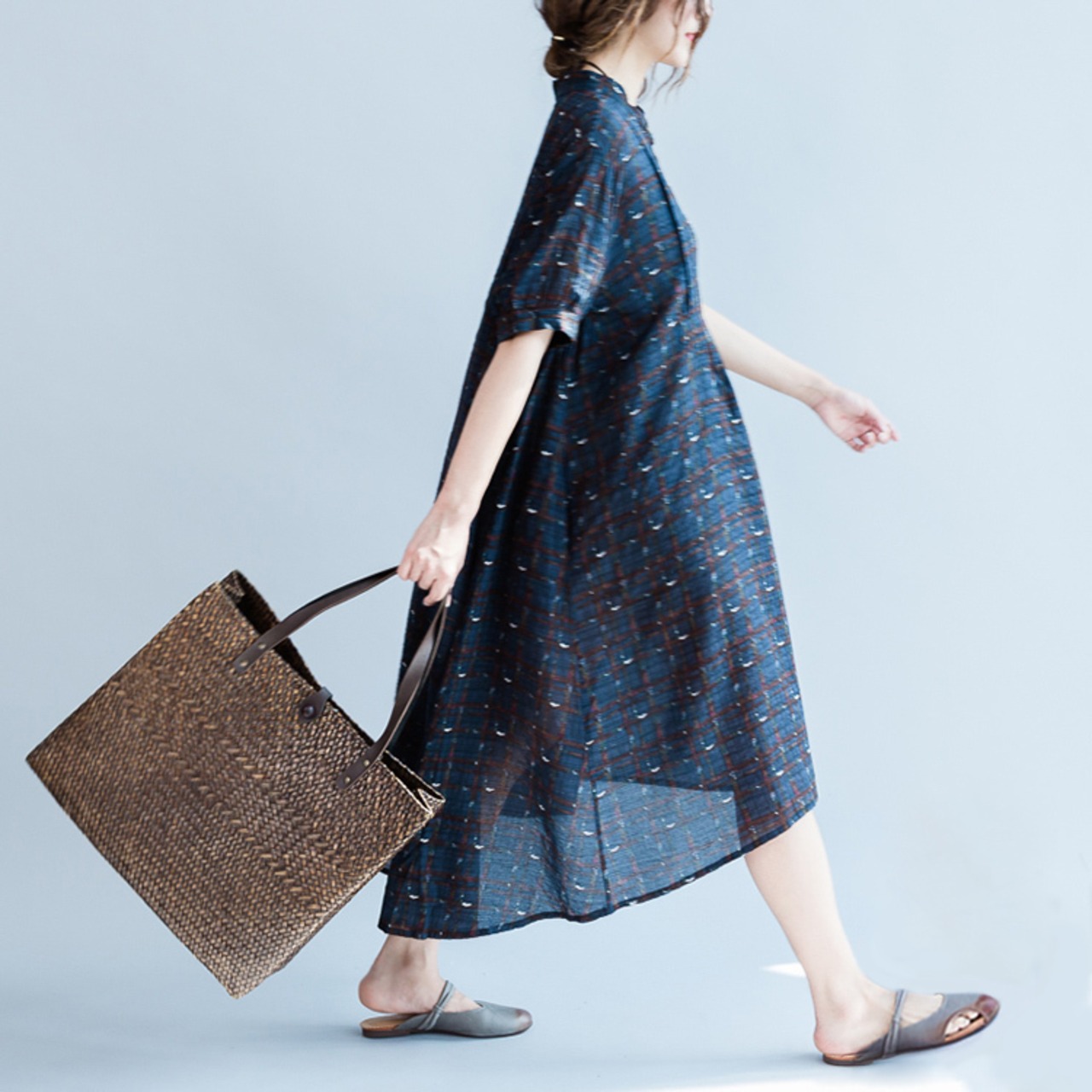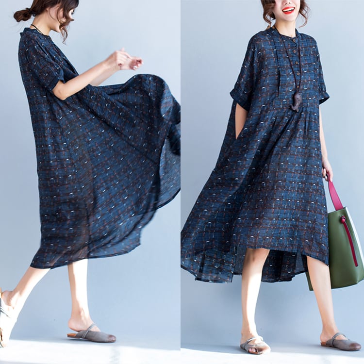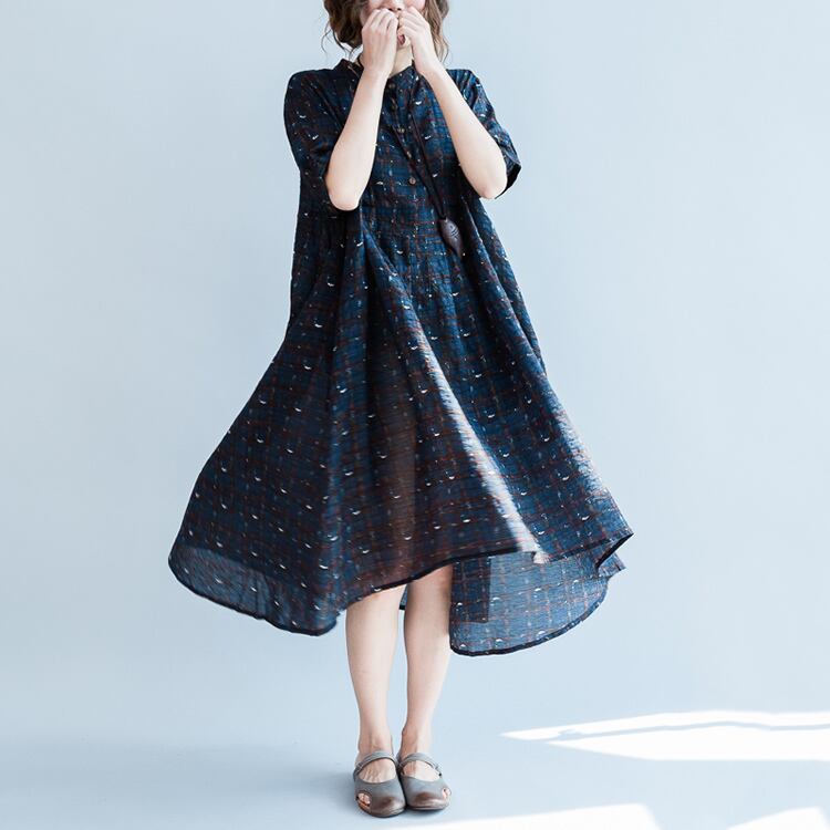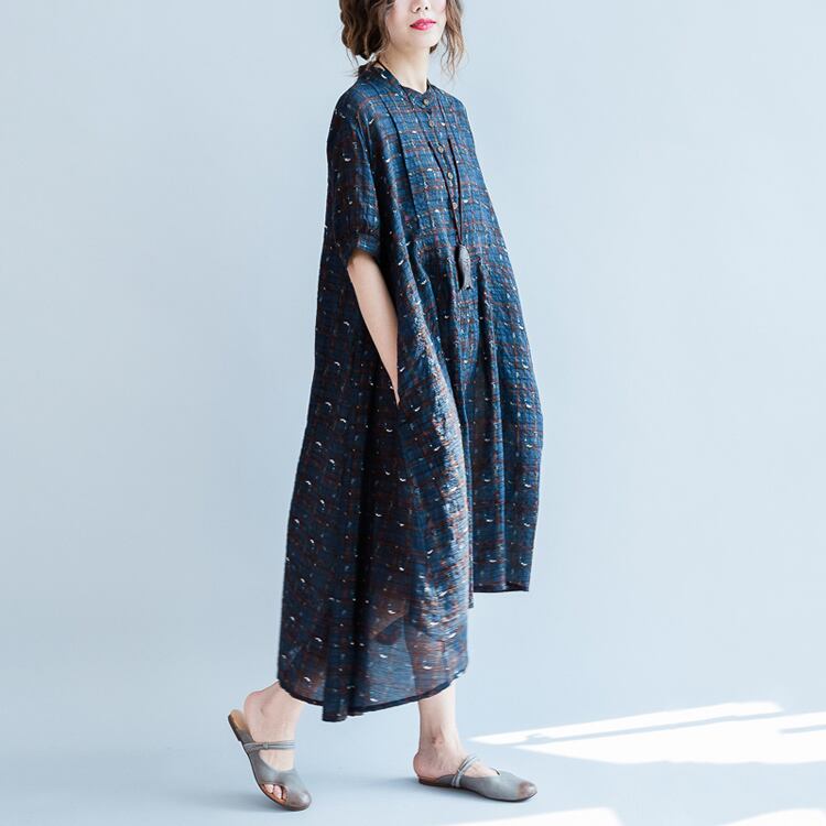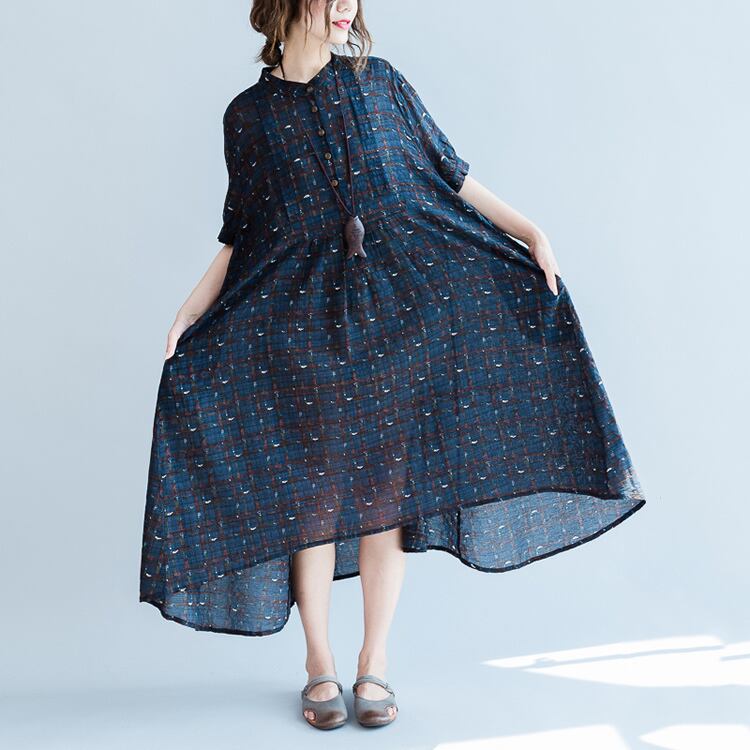 ワンピース 麻綿リネンコットン ひざ丈 ミディ丈 半袖 スタンドカラー チェック ナチュラル シンプル レトロ ゆったり 体型カバー マタニティ カジュアル お出かけ デート リゾート デイリー 普段着 夏 ブルー