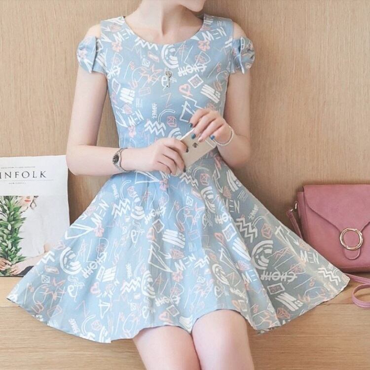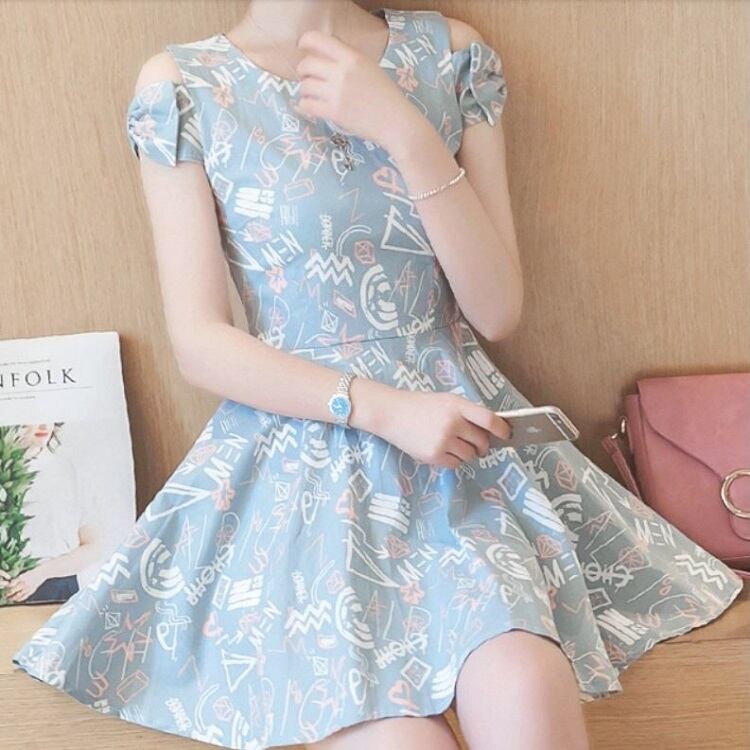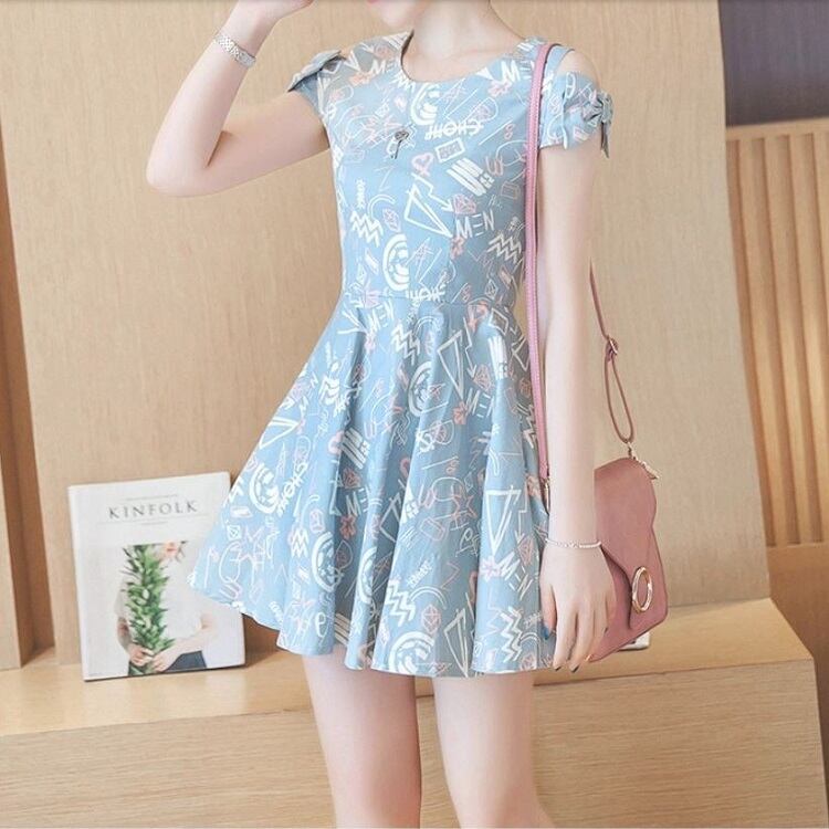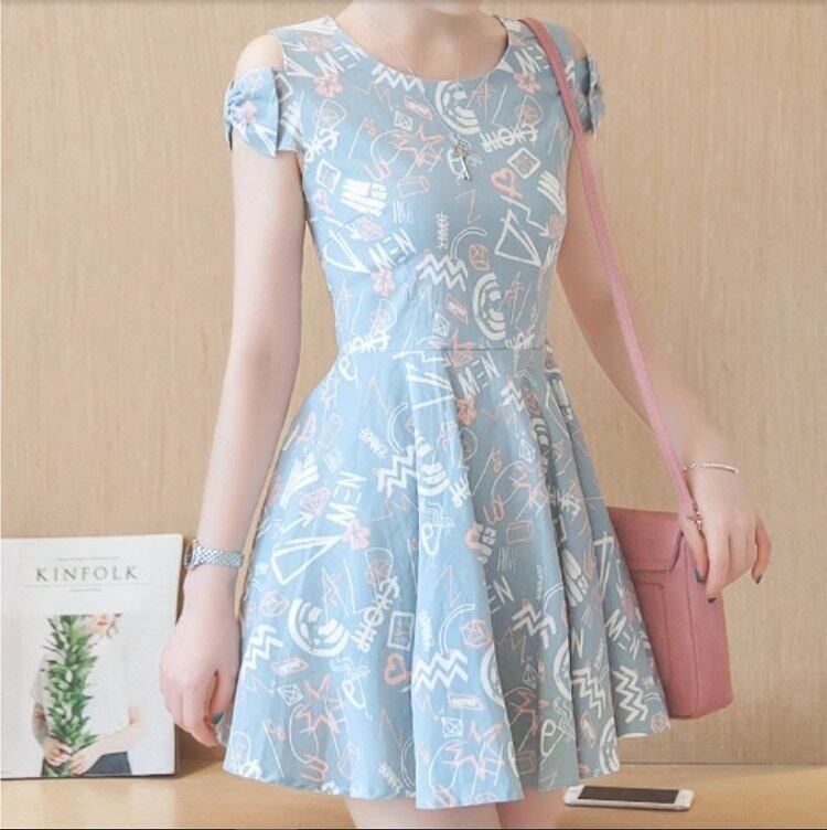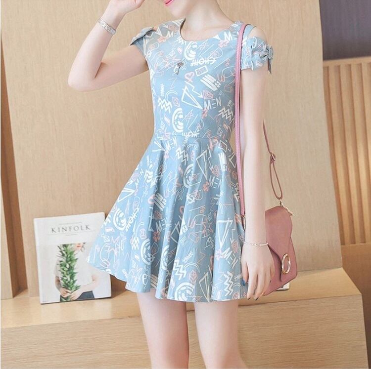 全2色 ワンピース 麻綿リネンコットン ミニ丈 フレアスカート オープンショルダー リボン 半袖 ラウンドネック シンプル レトロ カジュアル お出かけ デート リゾート デイリー 普段着 夏 ブルー ピンク