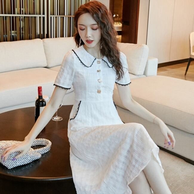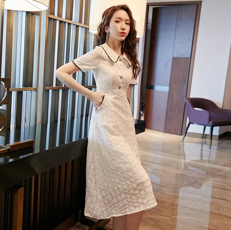 ワンピース 麻 綿 リネン コットン ミモレ丈 ウエストシャーリング フレア レース 大人可愛い ムスクテールカラー 半袖 お出かけ ボタン カジュアル デート きれいめ 夏