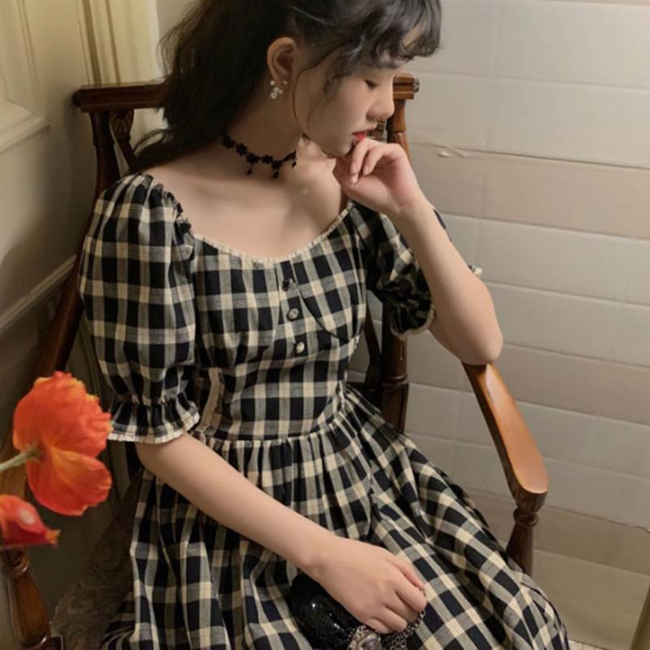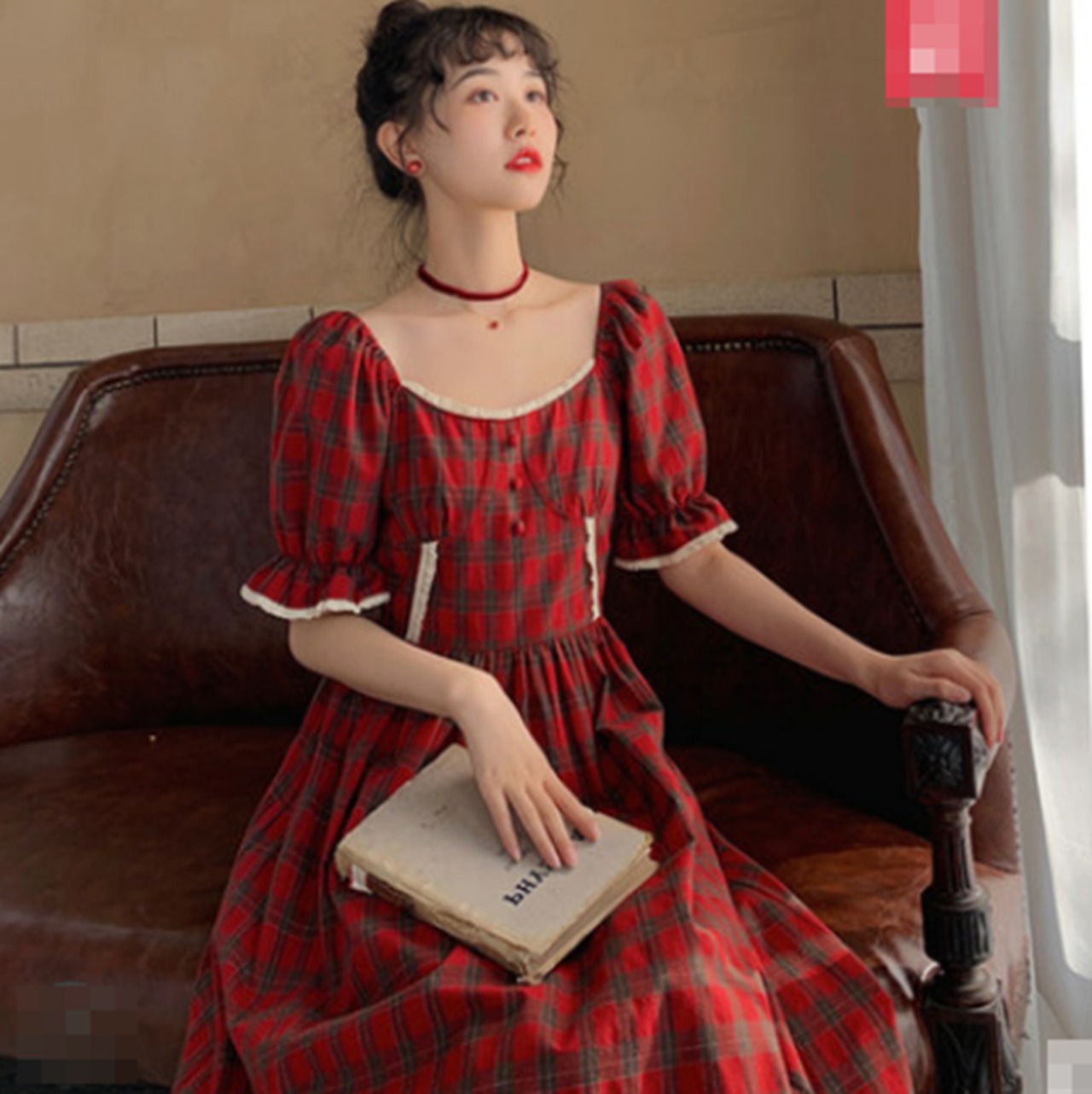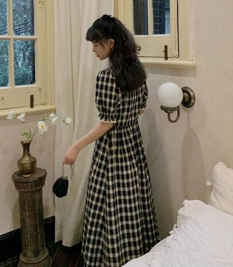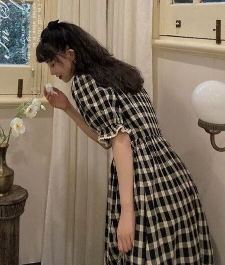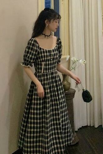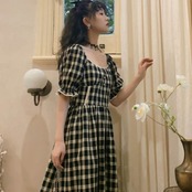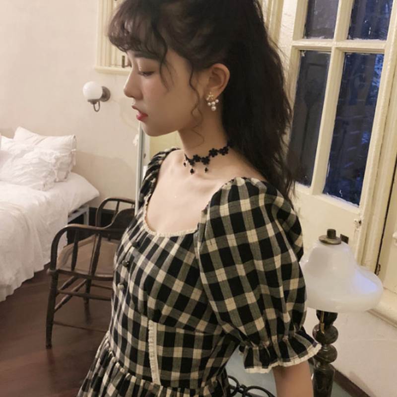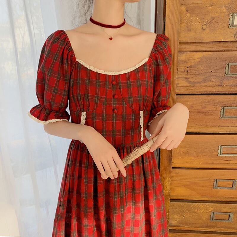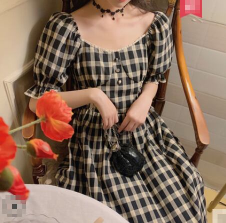 全2色 ワンピース リネン コットン 綿 麻 スクエアネック ハイウエスト チェック柄 5分袖 パフスリーブ ボタン ミモレ丈 大人可愛い カジュアル お出かけ リゾート デート フレア レトロ 夏