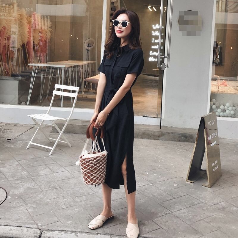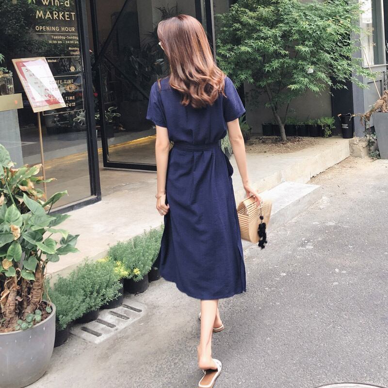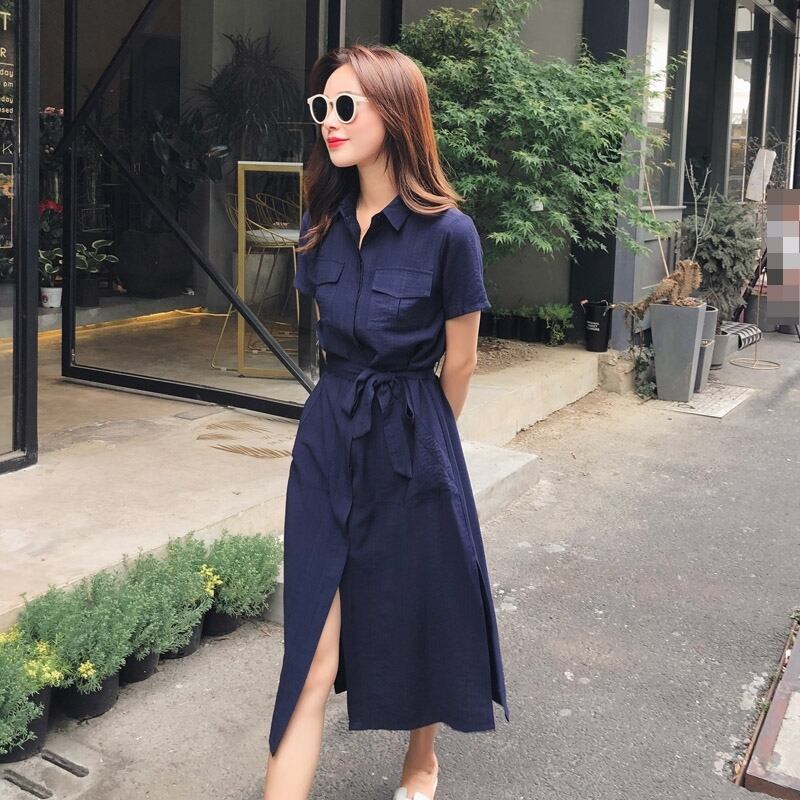 全2色 ワンピース シャツワンピース 麻 綿 リネン コットン 襟 サイドスリット ミモレ丈 Vネック フロントボタン 大人 上品 ウエストリボン きれいめ 半袖 お出かけ カジュアル デイリー シンプル 夏