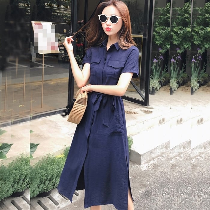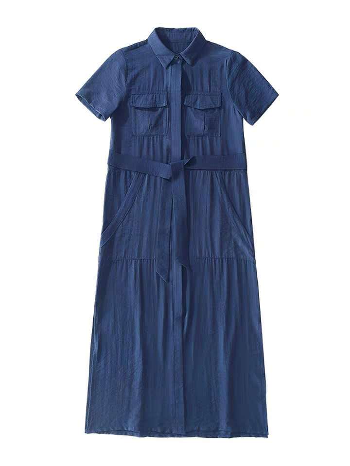 シンプルかつおしゃれなミモレ丈シャツワンピース。