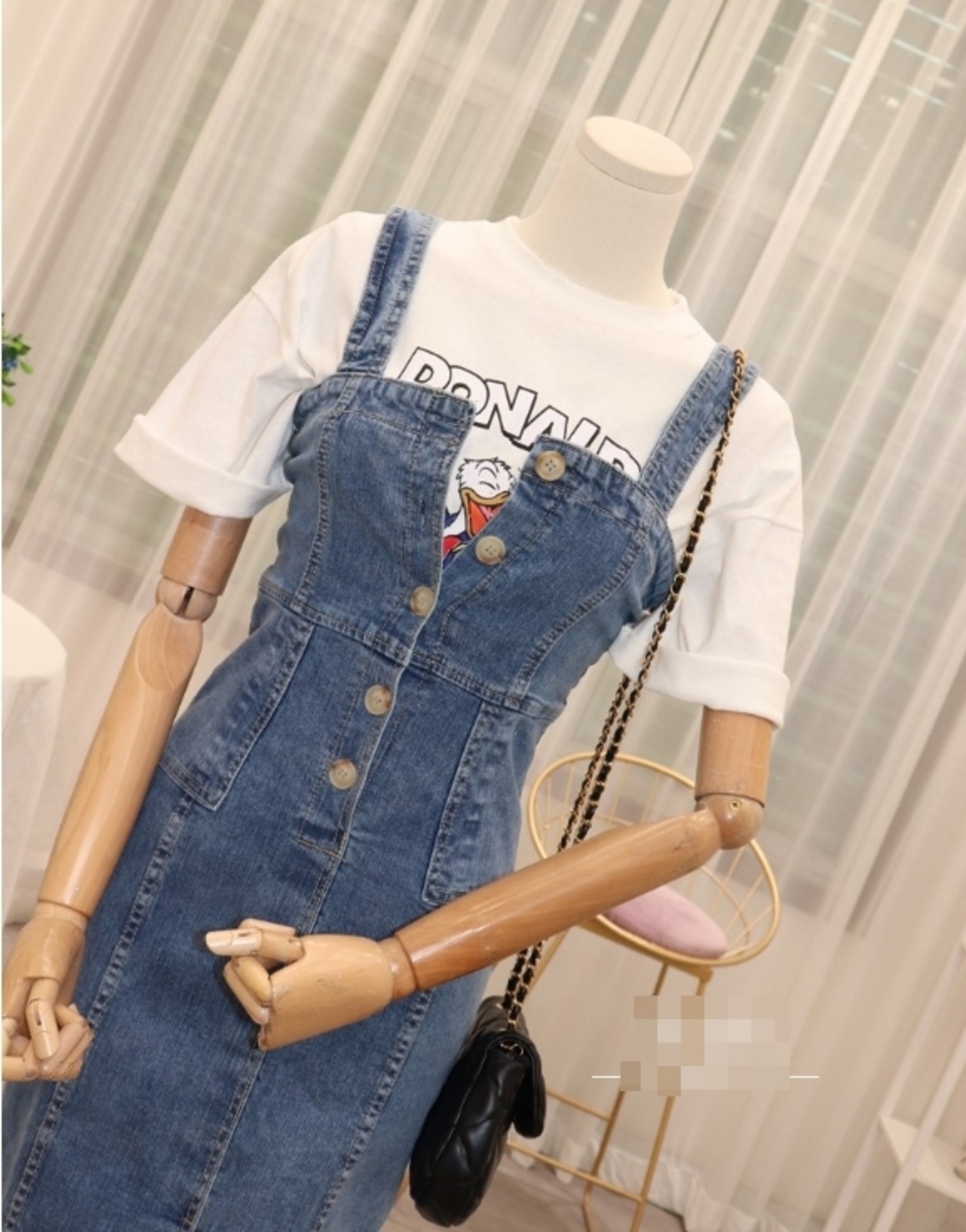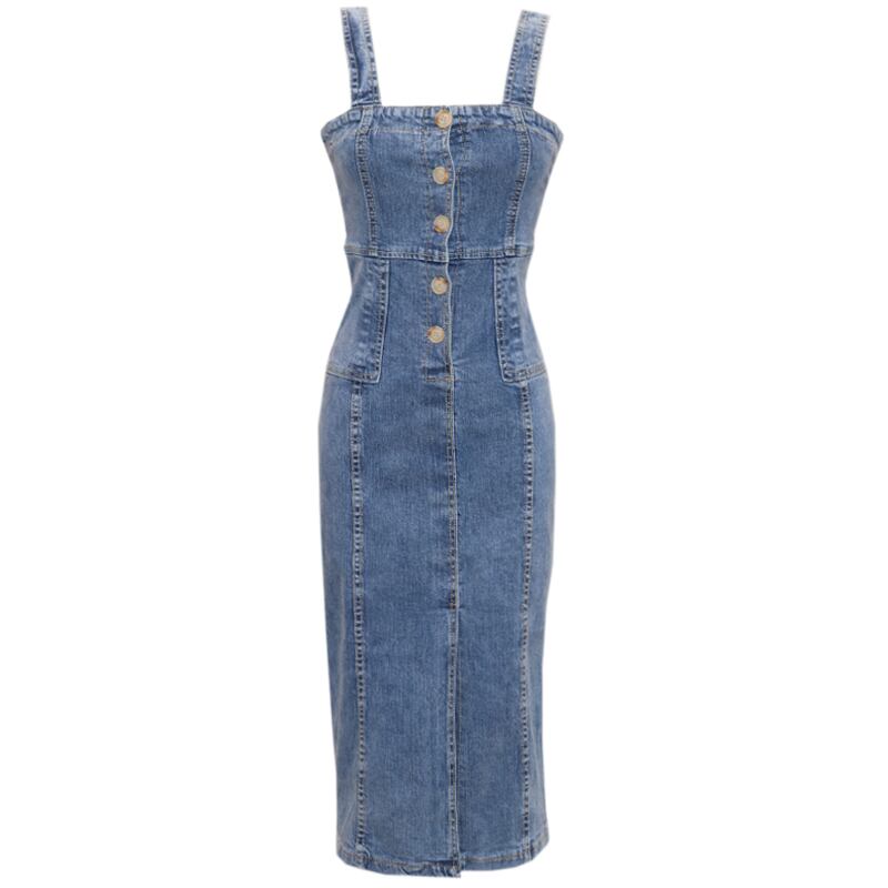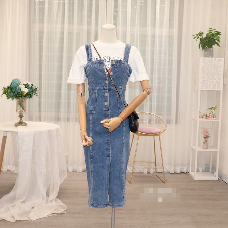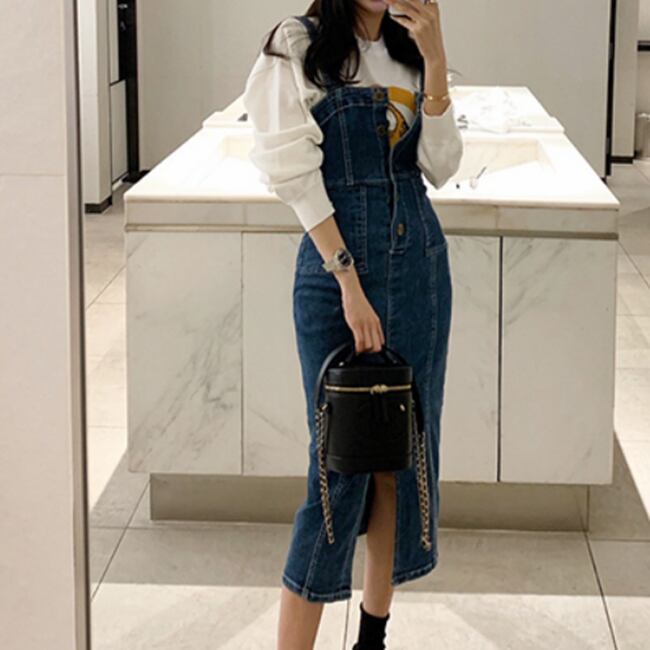 ジャンパースカート デニムワンピース サロペットスカート ミモレ丈 ジーンズ フロントボタン フロントスリット タイト カジュアル お出かけ デート 韓国ファッション 夏