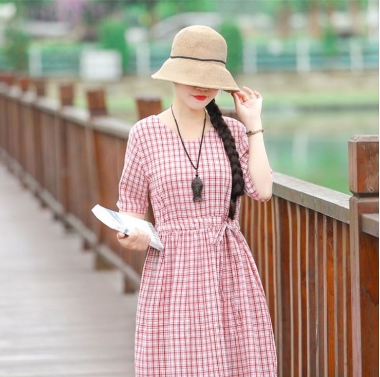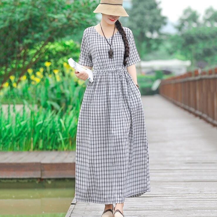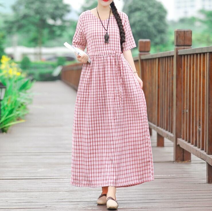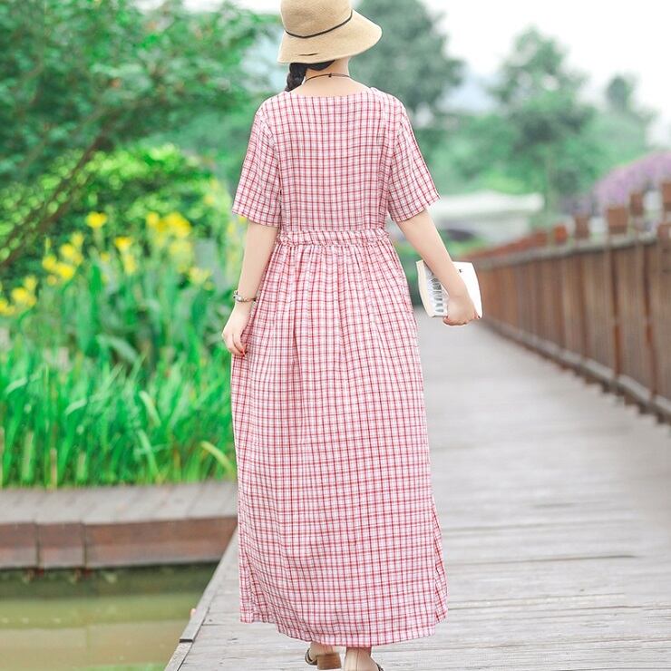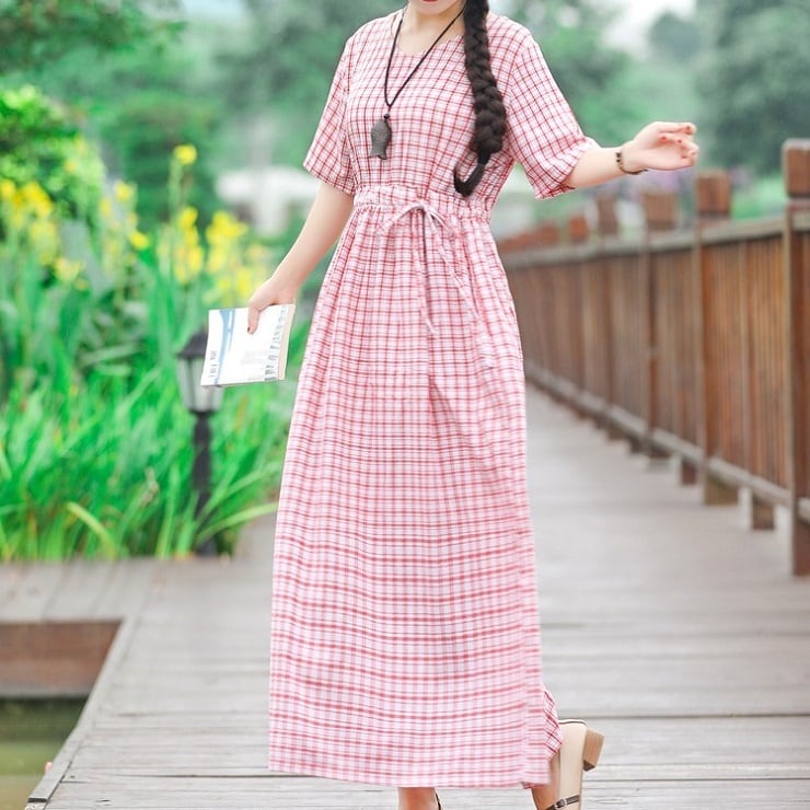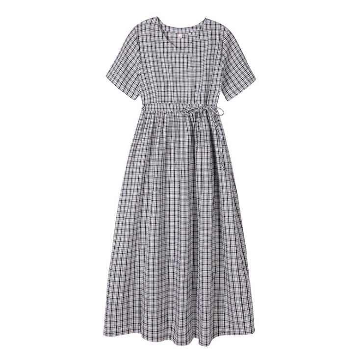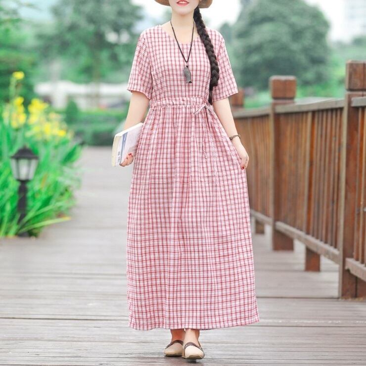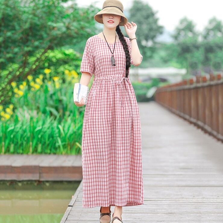 全2色 ワンピース 麻綿リネンコットン ロング丈 チェック フレアスカート ラウンドネック 半袖 シンプル ナチュラル レトロ カジュアル お出かけ デート リゾート デイリー 普段着 夏 ブラック レッド