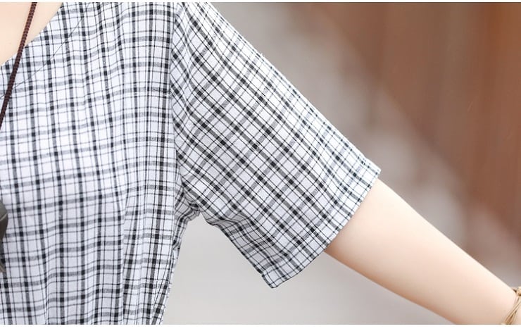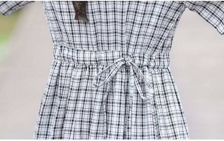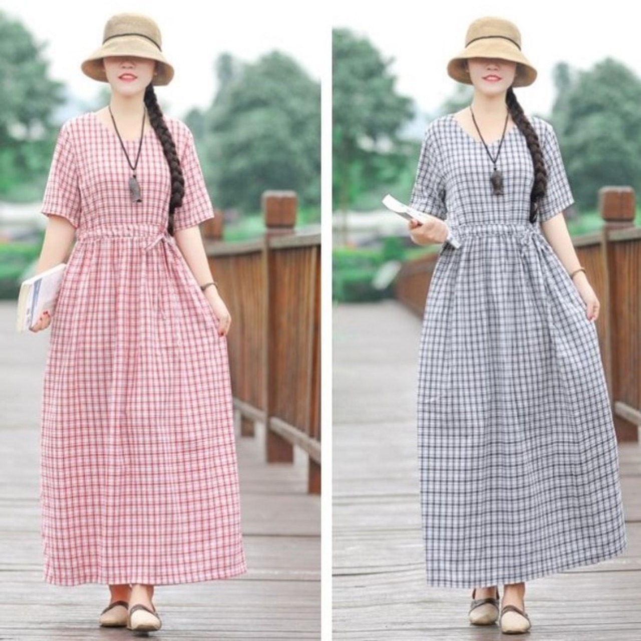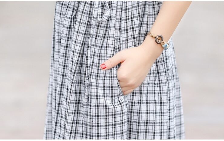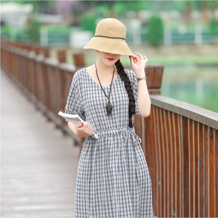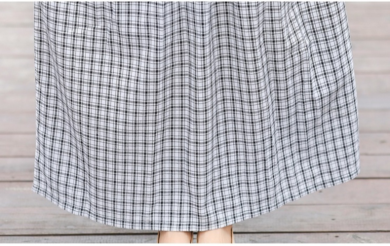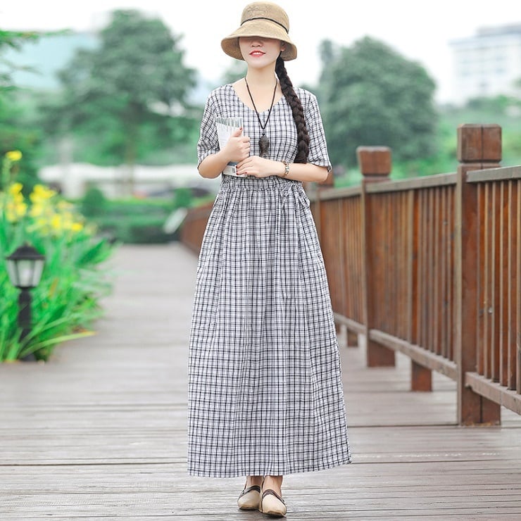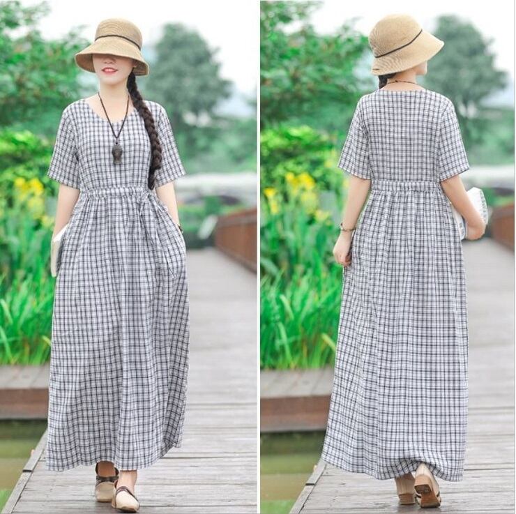 全2色 ワンピース 麻綿リネンコットン ロング丈 チェック フレアスカート ラウンドネック 半袖 シンプル ナチュラル レトロ カジュアル お出かけ デート リゾート デイリー 普段着 夏 ブラック レッド