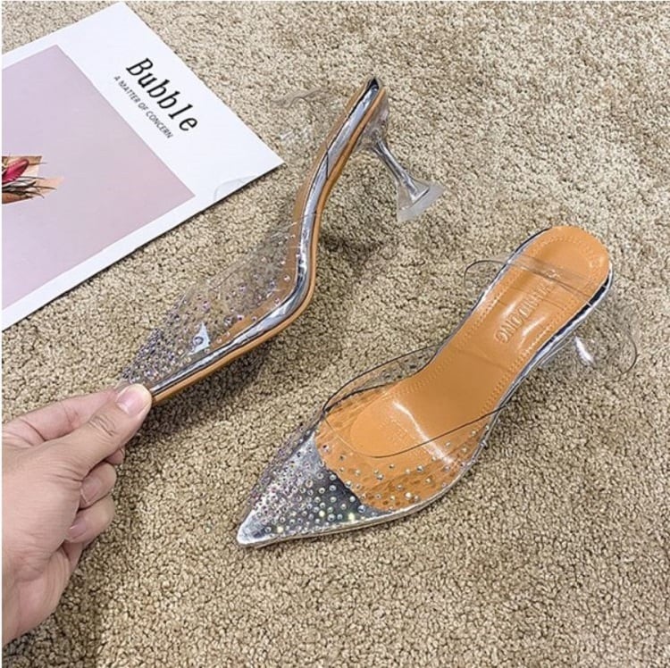 透明な素材にラインストーンがちりばめられたデザインのクリアサンダル。