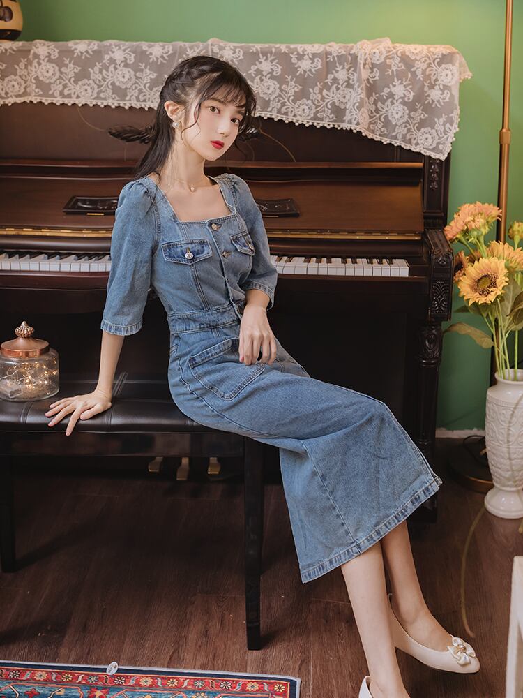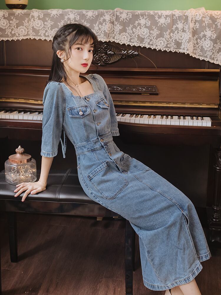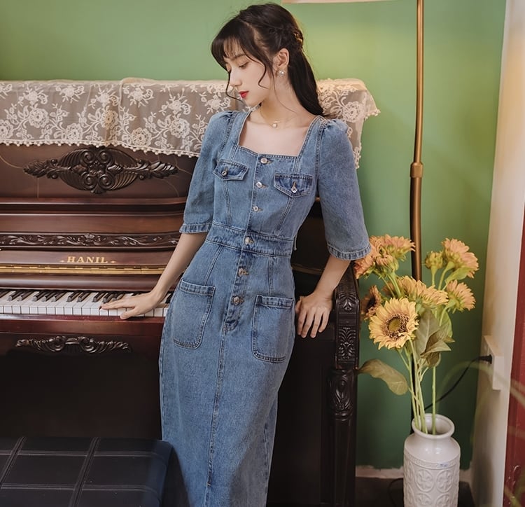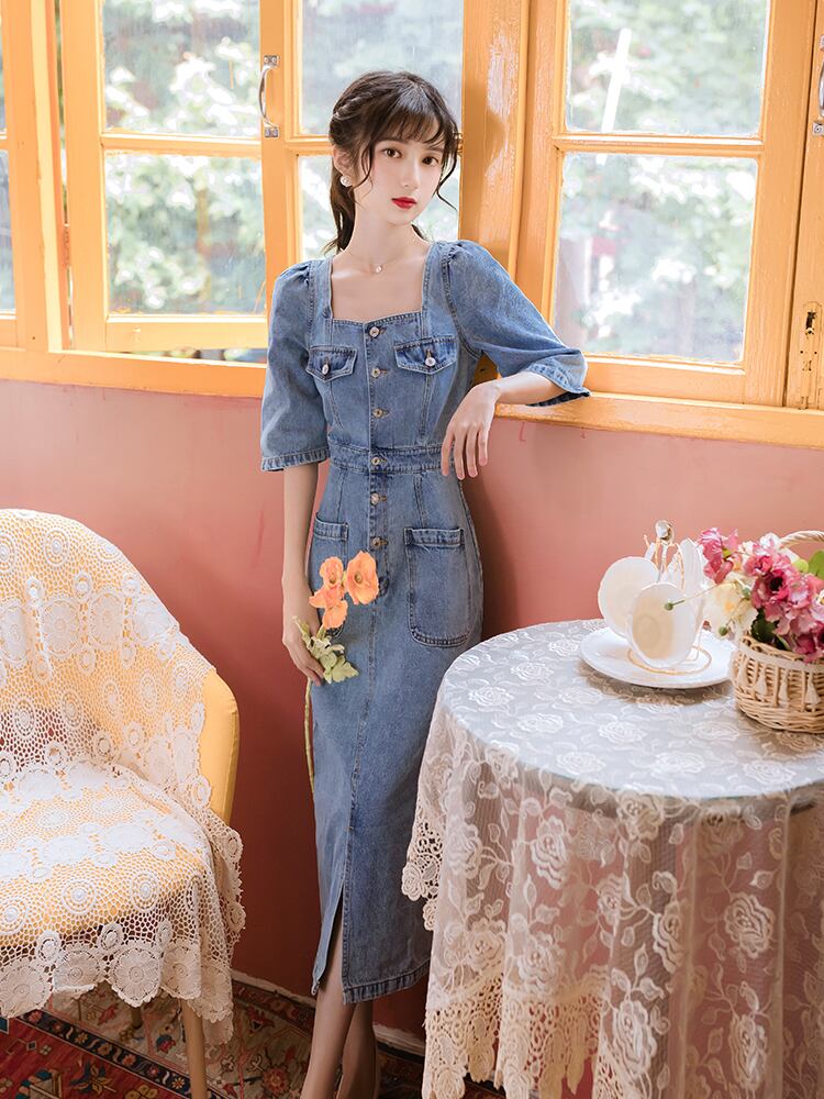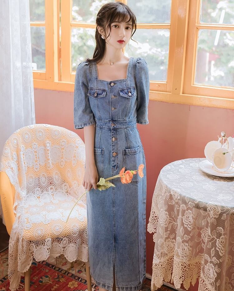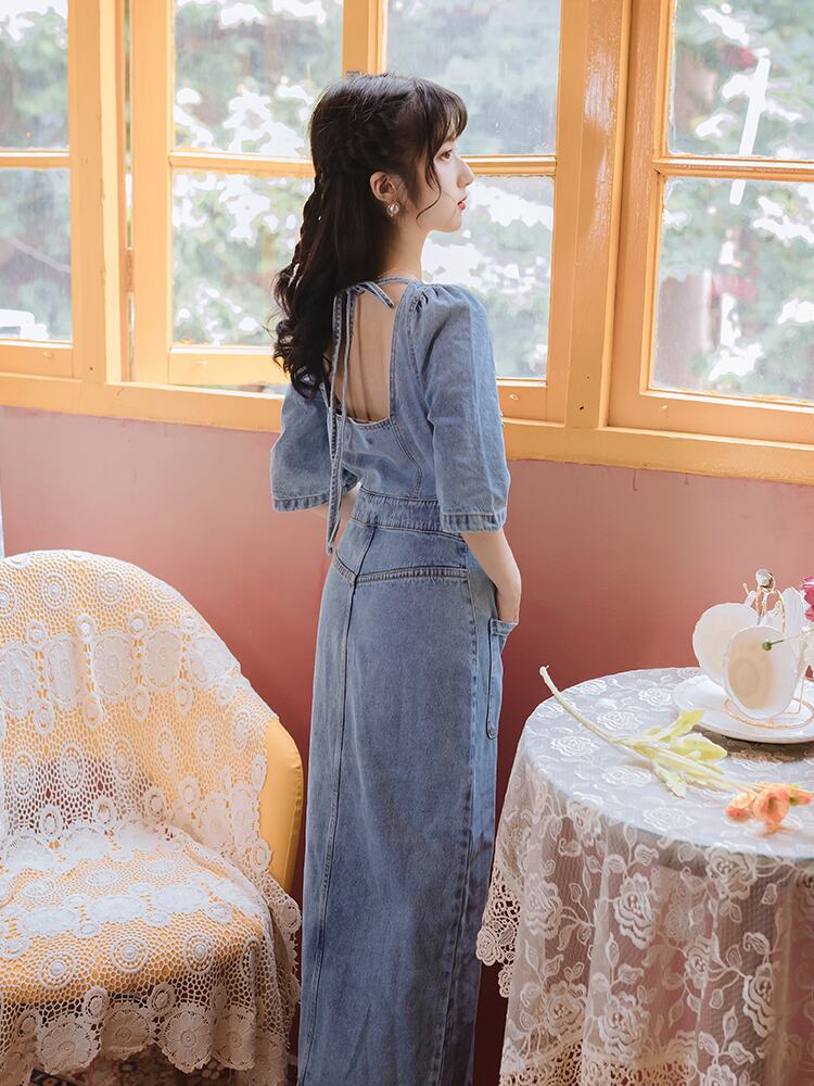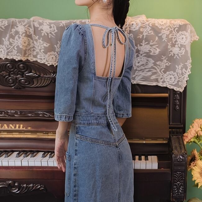 デニムワンピース フロントボタン 5分袖 ロング丈 スリム フロントスリット バックリボン スクエアネック バックコンシャス 背中見せ 背中開き カジュアル 大人可愛い きれいめ デート レトロ 春 夏