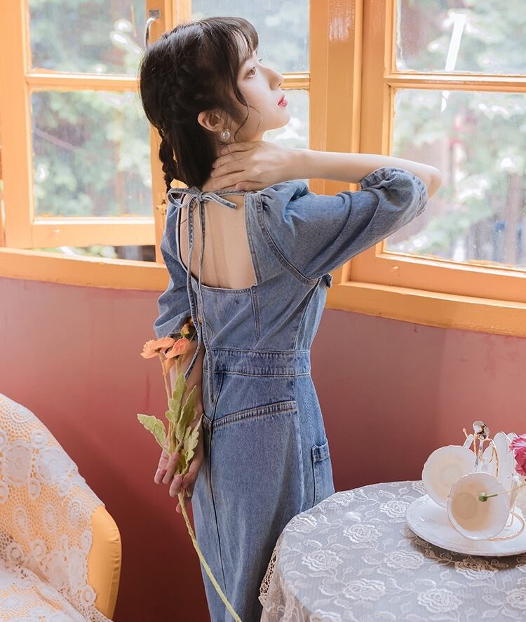 背中が開いたバックスタイルが大人の色気を演出するデニムワンピース。