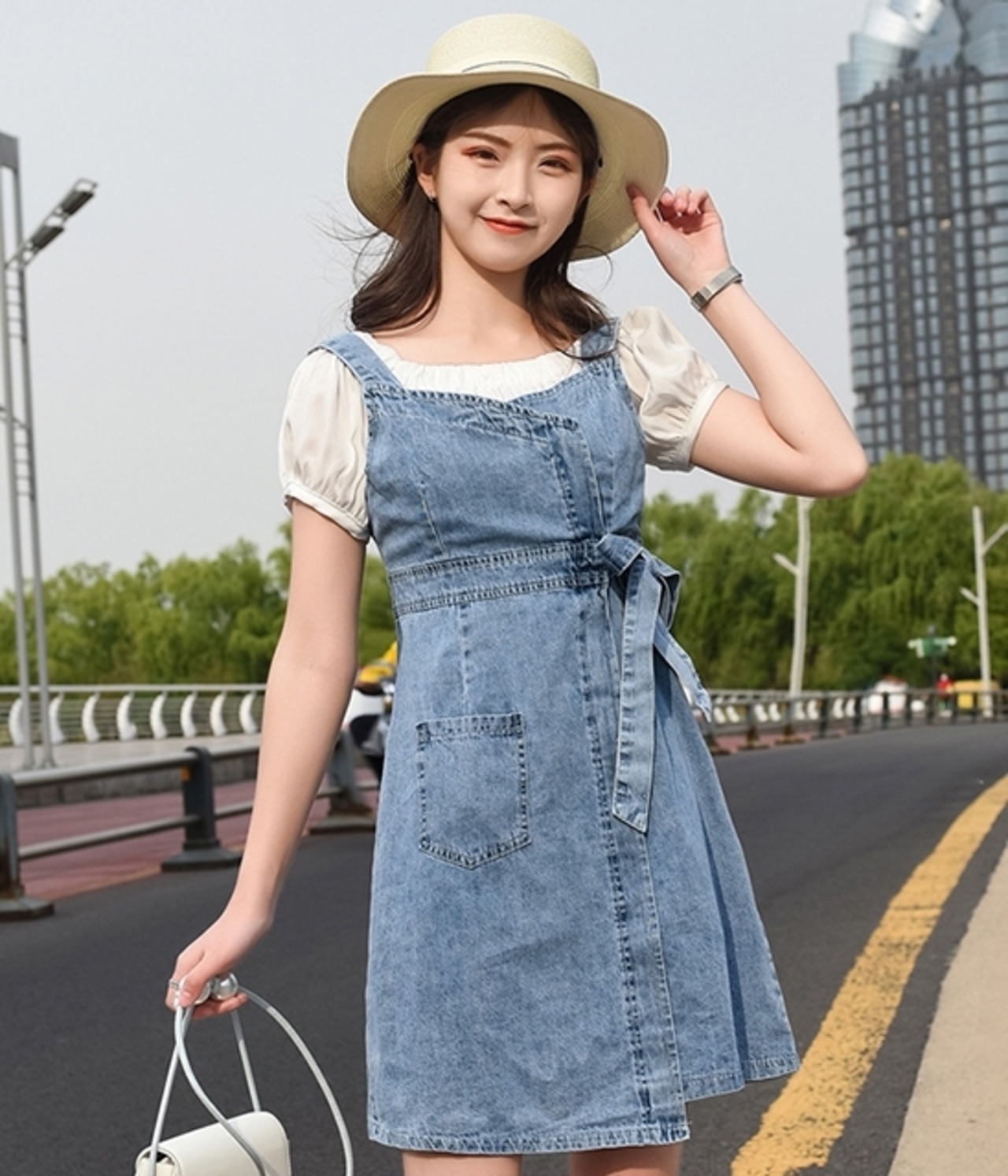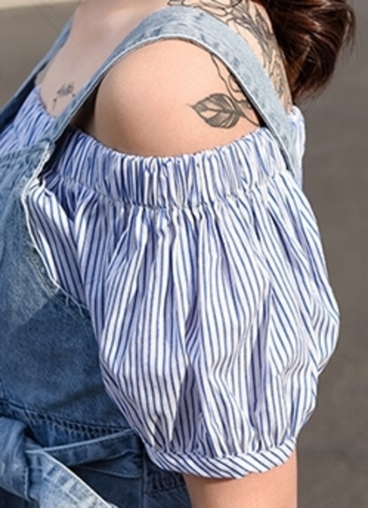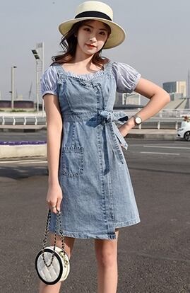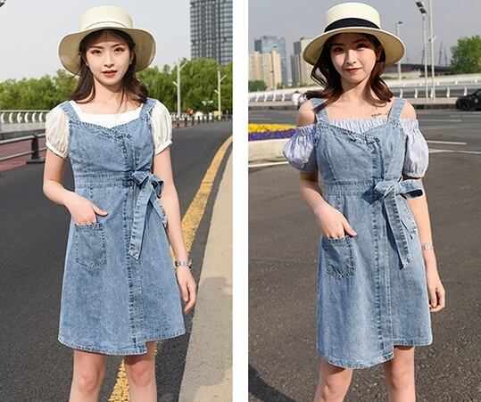 全2色 フェイクツーピース ジャンパースカート サロペットスカート デニムサロペット ワンピース オフショルダー リボン ショート丈 タイト カジュアル お出かけ 可愛い デート ユニーク ジーンズ ストライプ 韓国ファッション 夏
