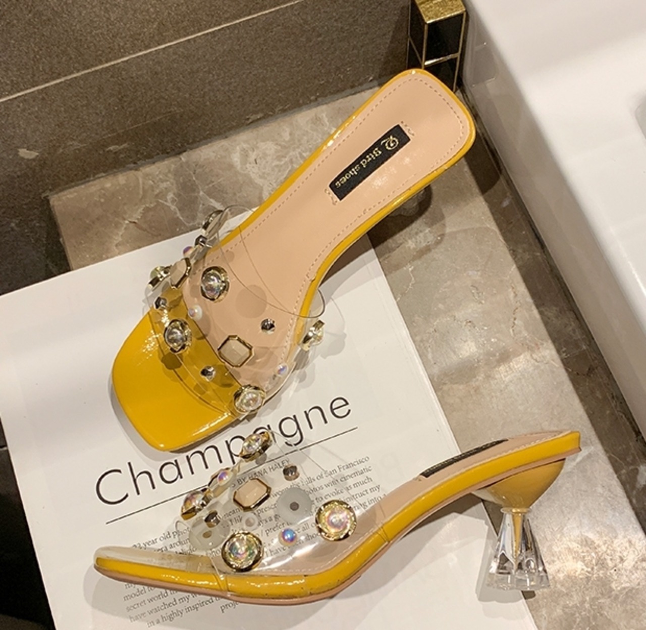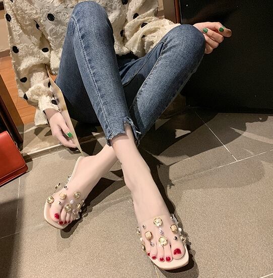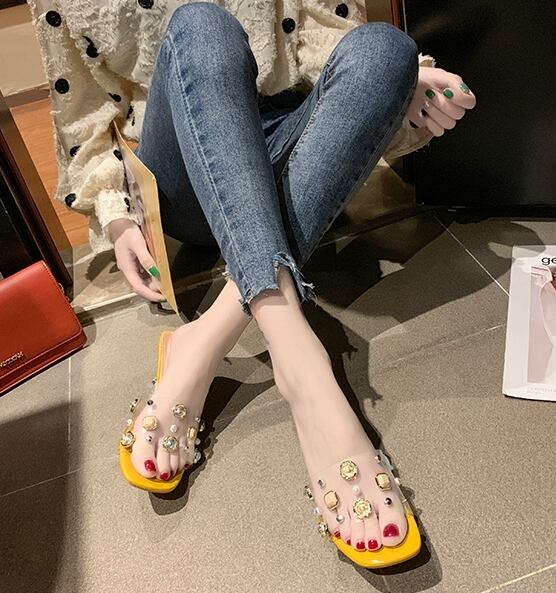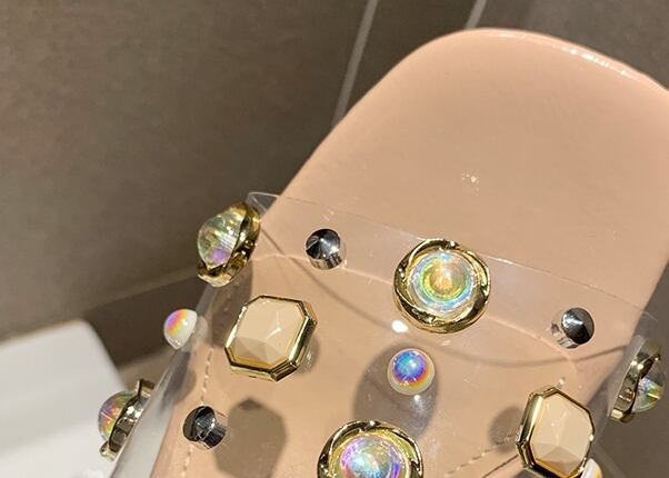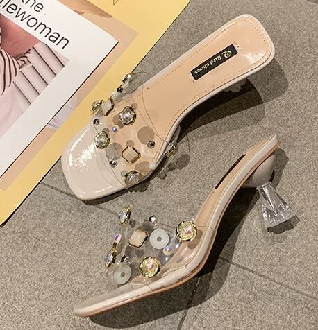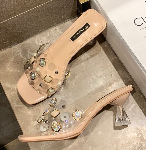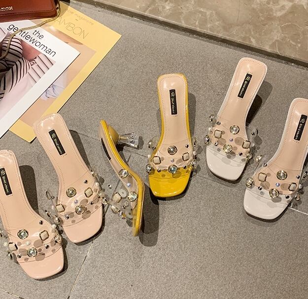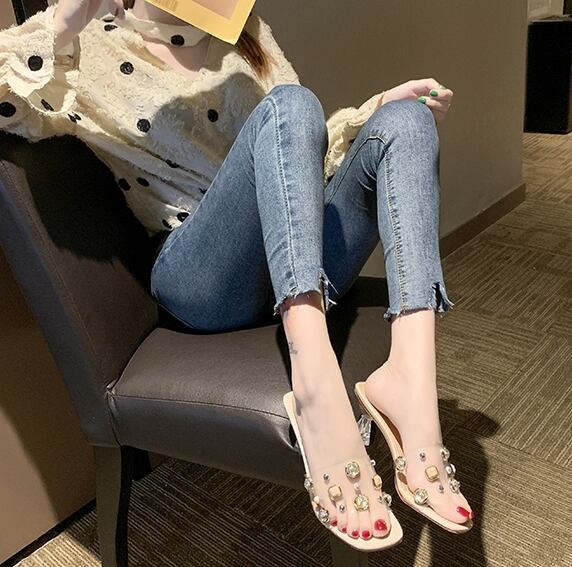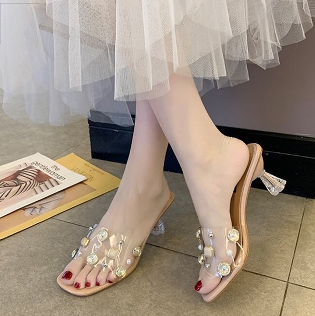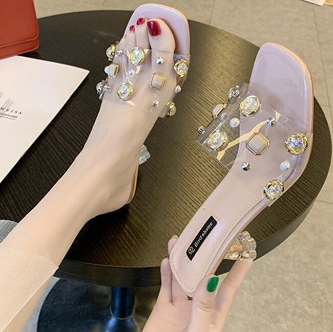 全3色 ミュール サンダル クリア スクエアトゥ ビジュー ラインストーン シースルー 透け感 オープントゥ ミドルヒール きれいめ カジュアル 上品 デート 女子会 夏