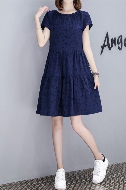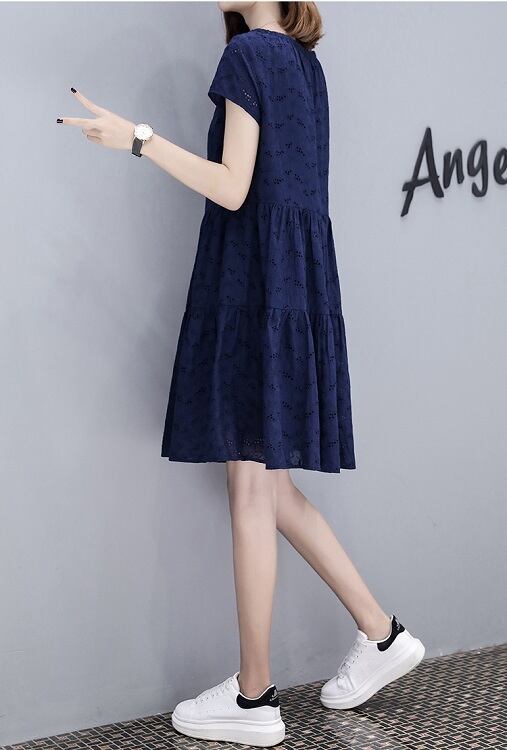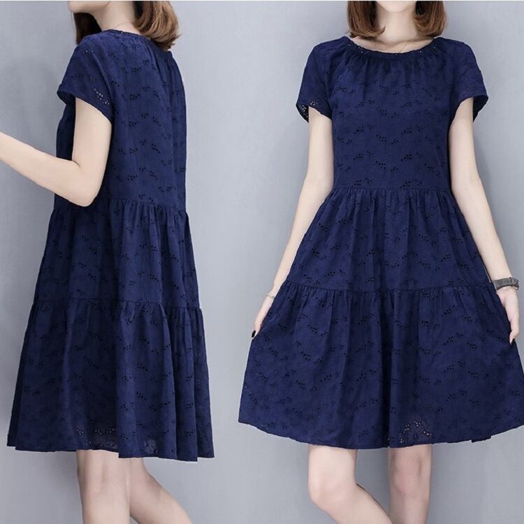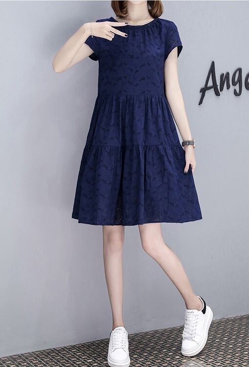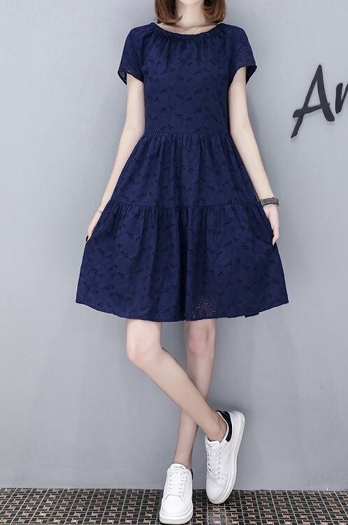 大きいサイズ ミニワンピース 麻綿リネンコットン ラウンドネック 半袖 ハイウエスト ティアード Aライン カジュアル お出かけ デート リゾート マタニティ デイリー 夏 2XL 3XL 4XL 5XL ネイビー