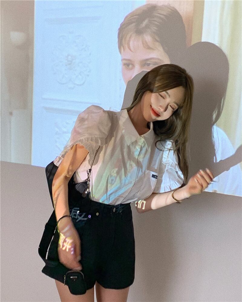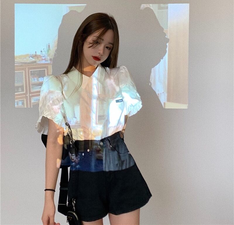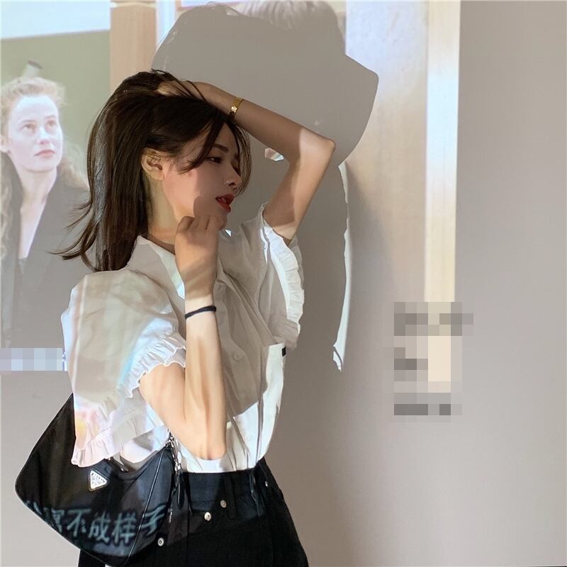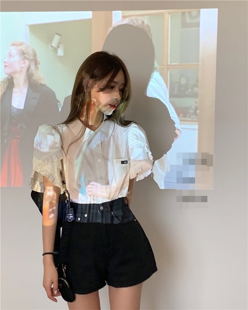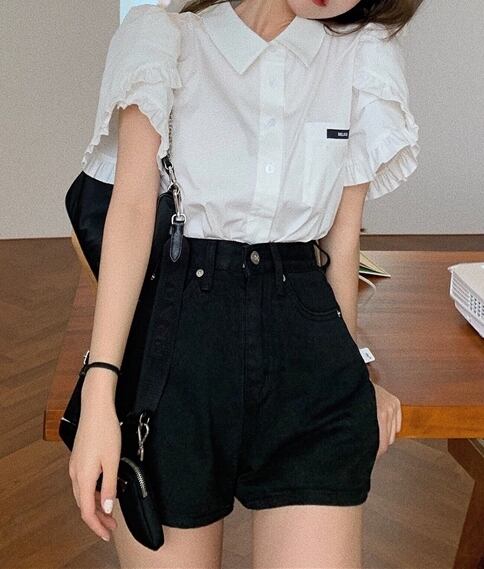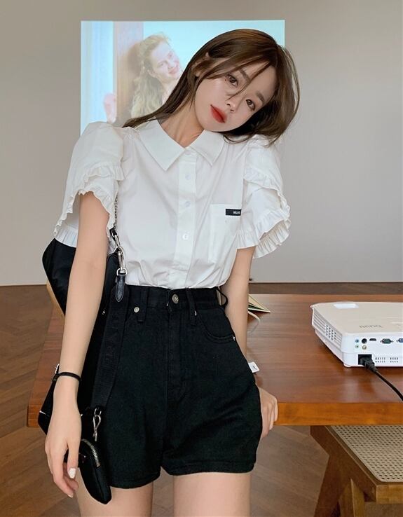 全2種 ブラウス シャツ ショートパンツ ボトムス ミニ丈 フロントボタン 襟 袖コンシャス フリル 半袖 ハイウエスト カジュアル 大人可愛い きれいめ デート お出かけ 夏